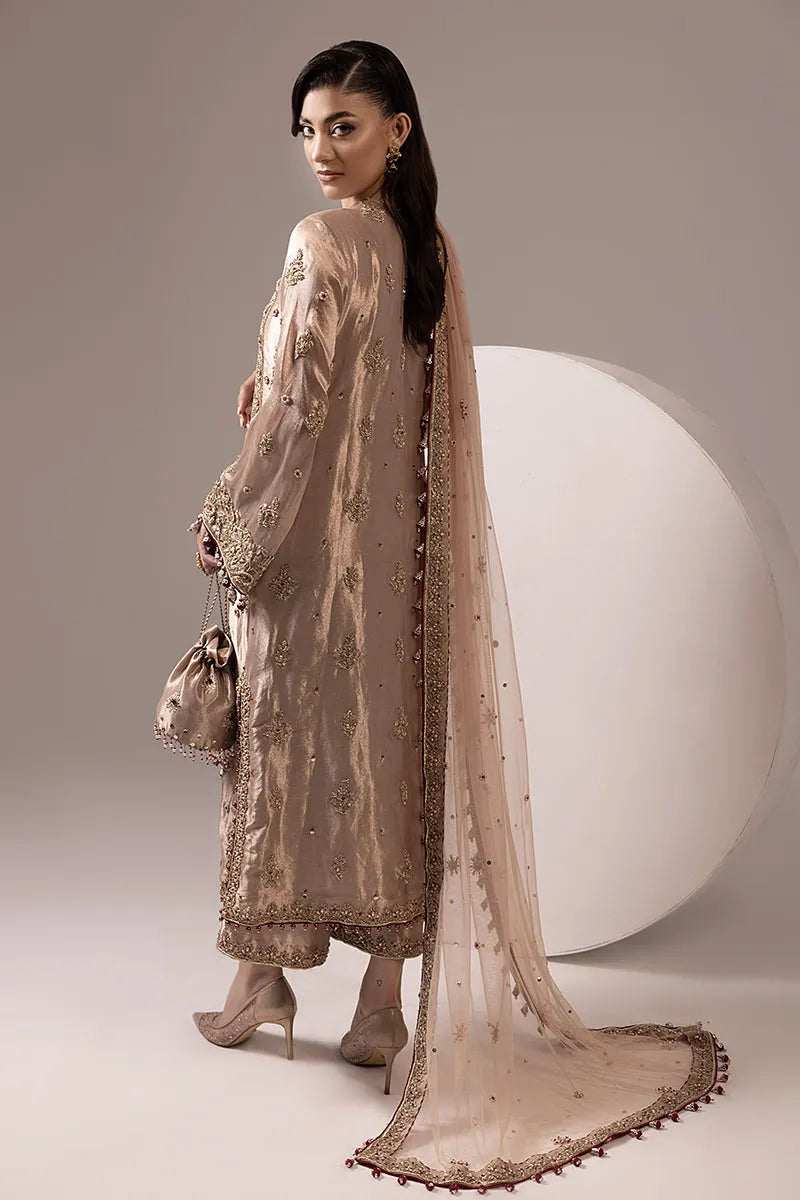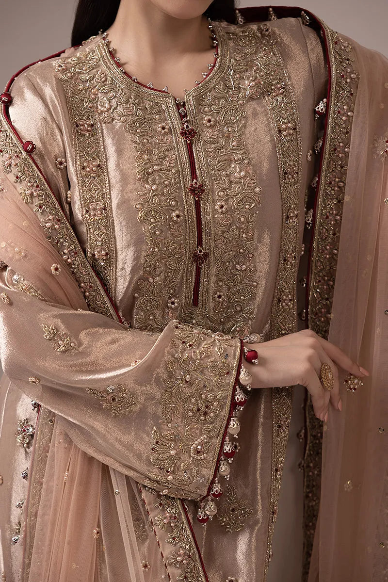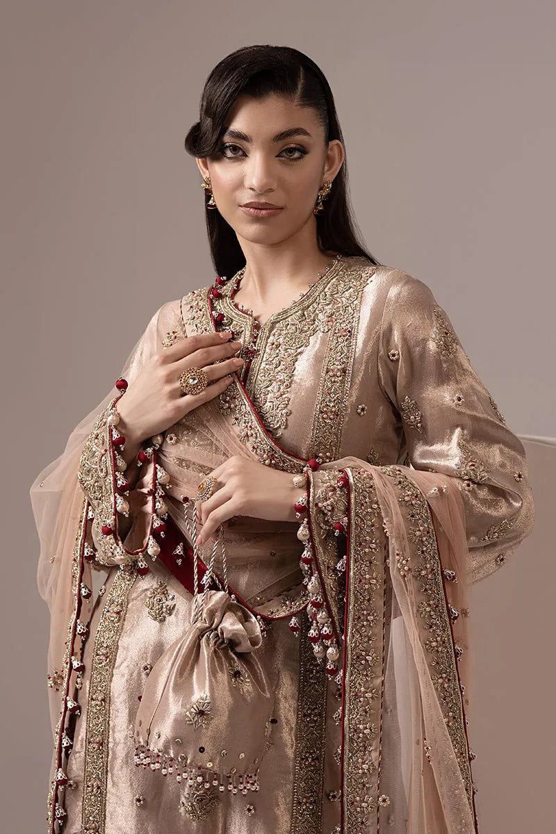 An ethereal shade of rose gold hue with a subtly shimmering, Gulnar is embellished with zardozi, sequins, pearls, seroski , crystals and silk thread work in soft pastel hues.
