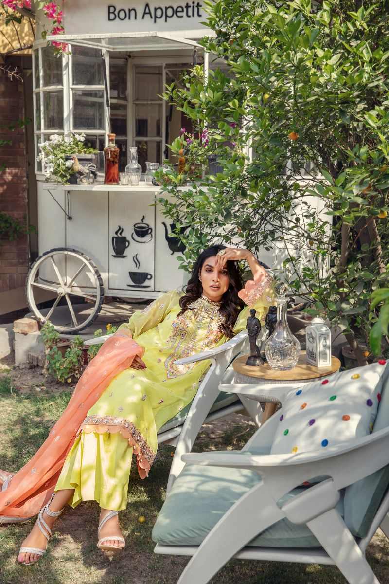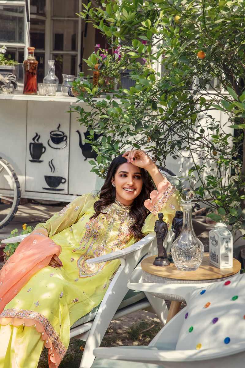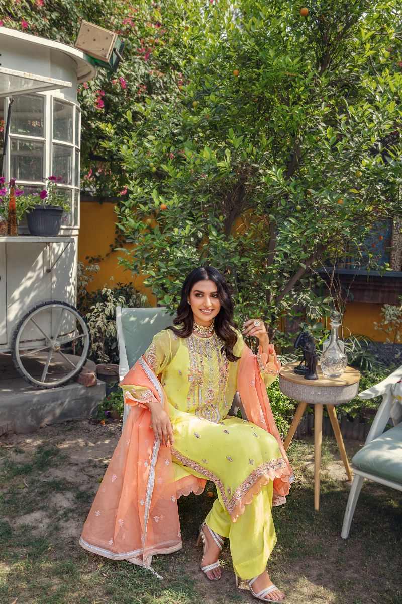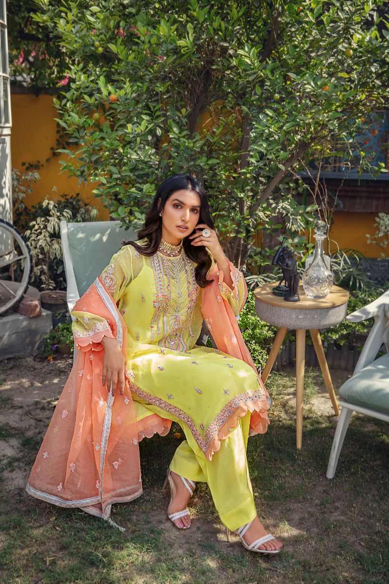 Dress up in the vivid hues of this yellow 3 piece outfit- organza kurta and dupatta paired with silk trouser. ‘Khazan’ is a chic design adorned with ornamental patterns embellished with glossy sequins, pearls, pipes and thread embroidery add beauty in it. The fusion of geometrical and floral neckline adorn this design, detailed with scallops and pearls at sleeves and borders. This ensemble is paired with spray dupatta with finishing lace and tassels.
