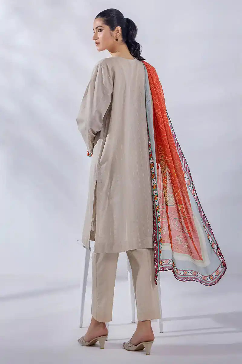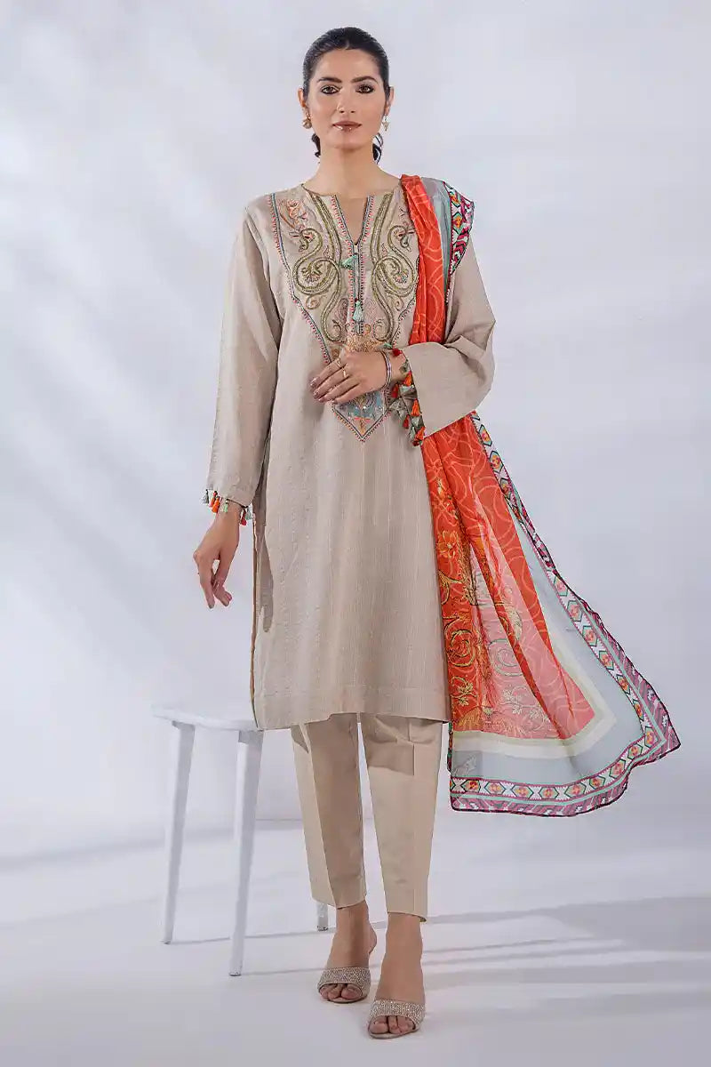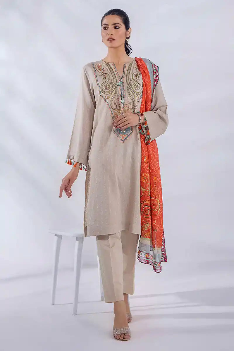 A medley of beautiful colours with a beige base. An irresistible shirt with meticulously designed embroidery in the dreamiest colours and delicate hand embellishment enhances the beauty of this ensemble. Paired with a gorgeous printed silk dupatta and cambric trouser, that’s instantly attractive and uplifts your everyday wardrobe.