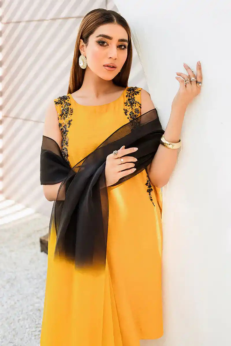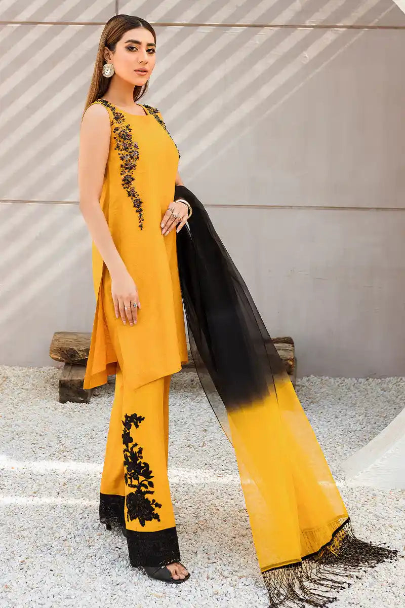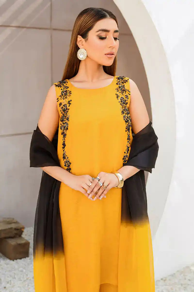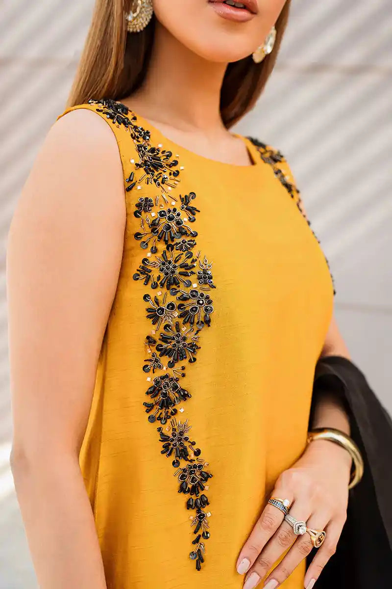 Dreamy and ethereal outfit – this mustard raw silk shirt and trouser comes with an organza dupatta. The shirt is adorned with delicate adda work. The trouser with embroidered patch work adds to the ode of this ensemble. The organza dupatta is dyed on ombre’ black and mustard and is laced up with delicate edging. This remarkable piece is bound to make you the center of attention.