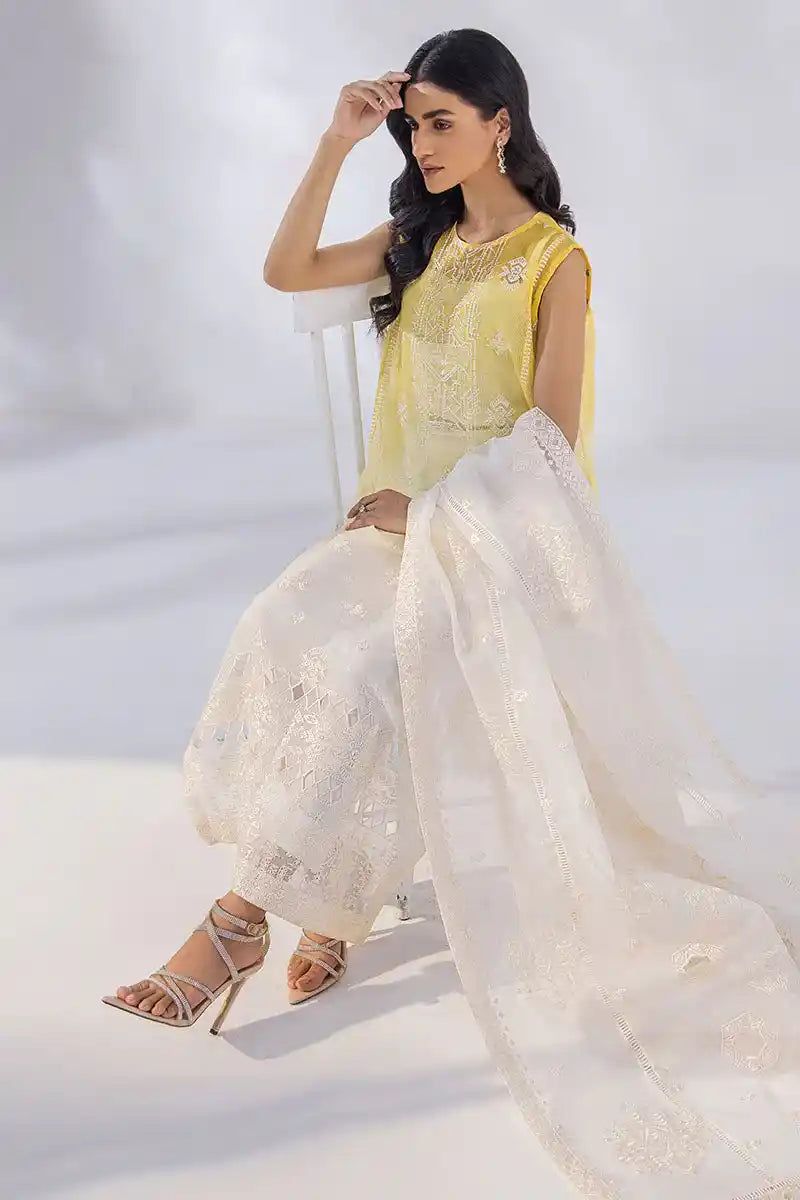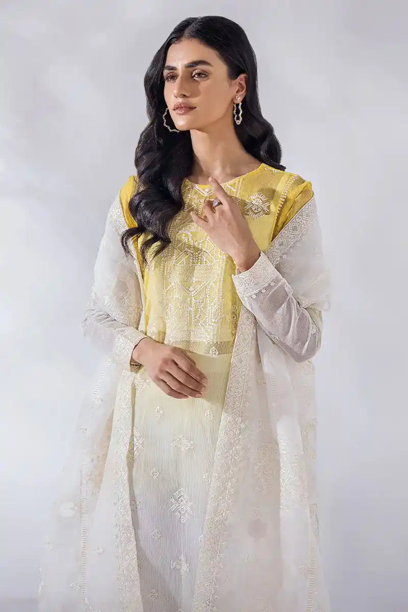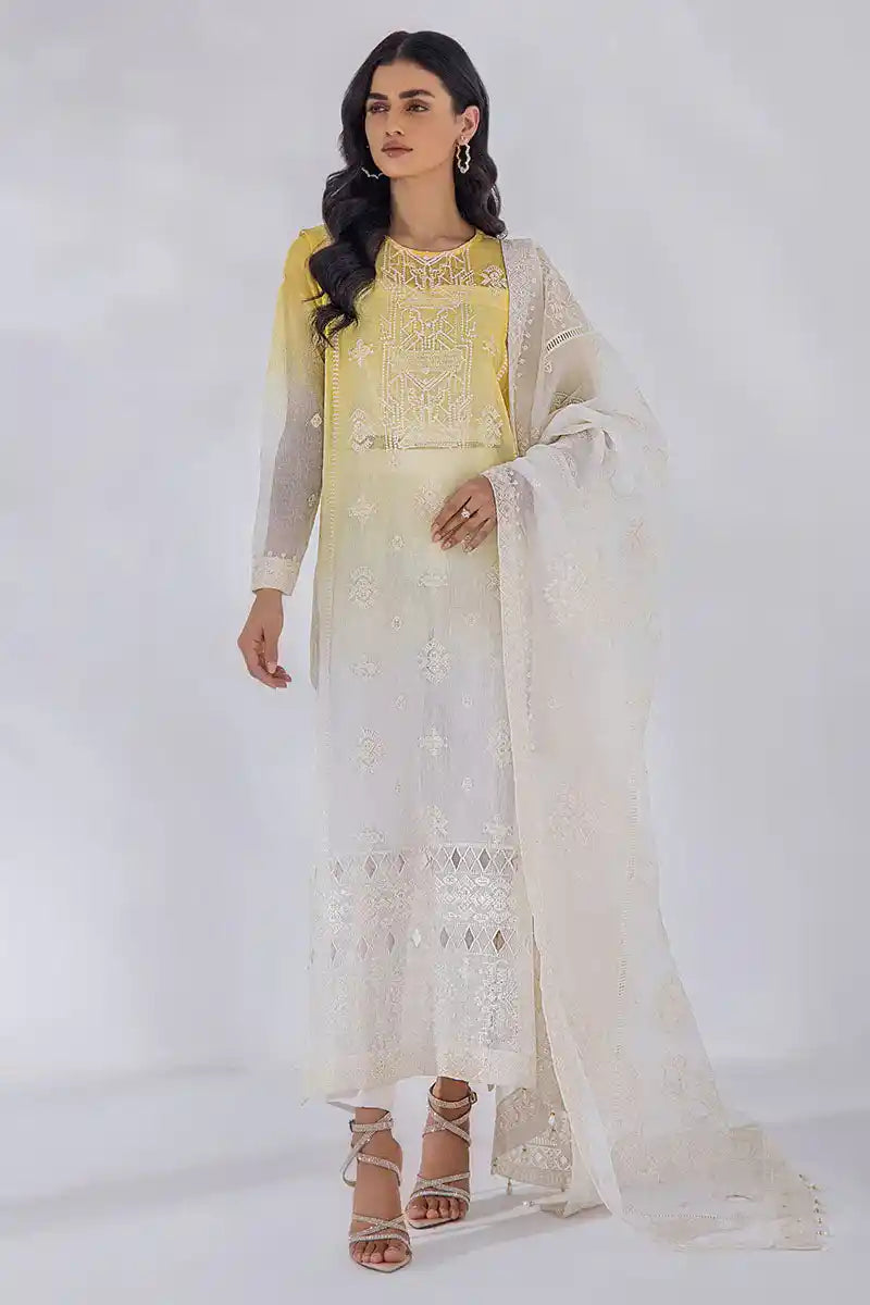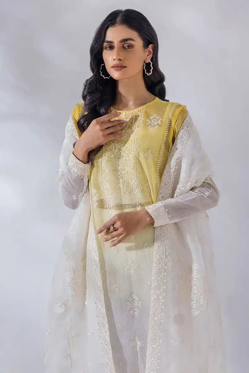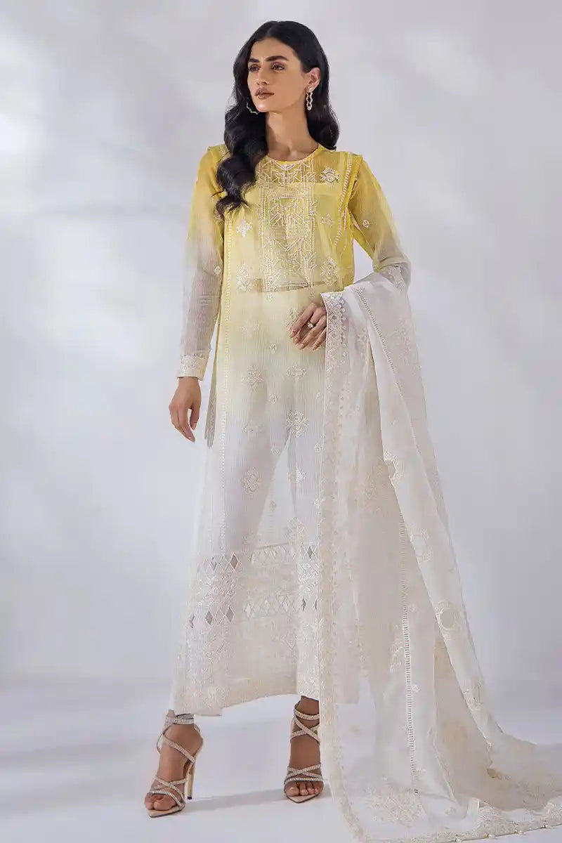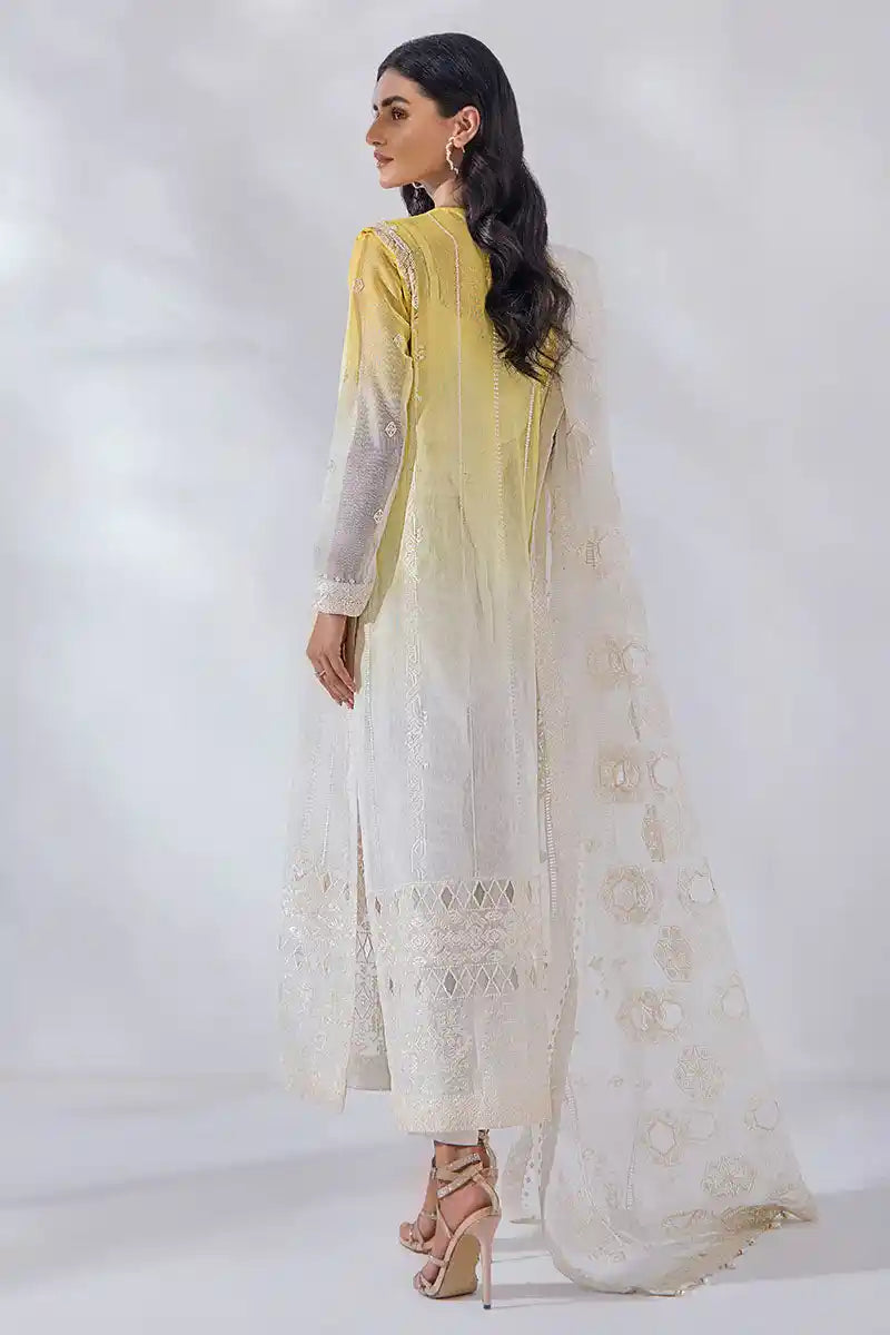 Look ravishing in this yellow ombre khadi net shirt. The shirt features matching front panels generously embroidered with amazing modern architecture motifs. It is paired with cigarette pants and a classic, fully embroidered and cutwork dupatta. The droplet hangings in the dupatta add oomph to this statement.