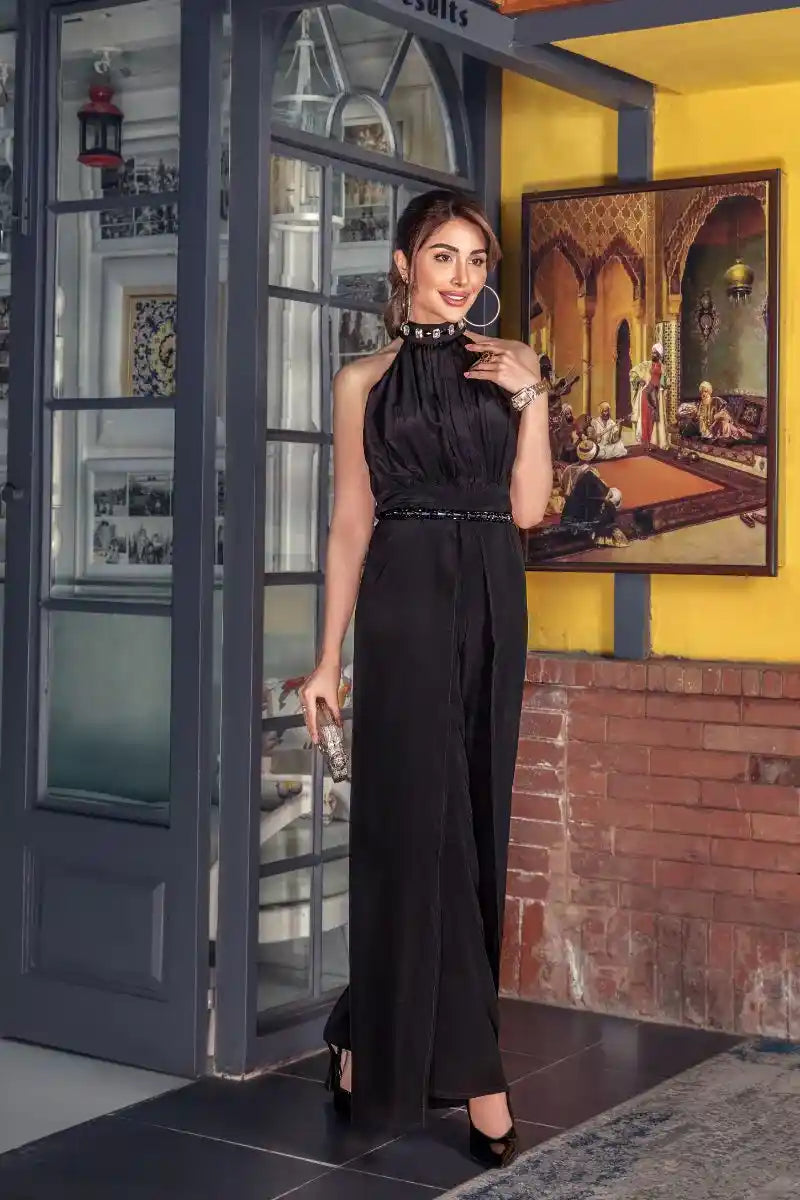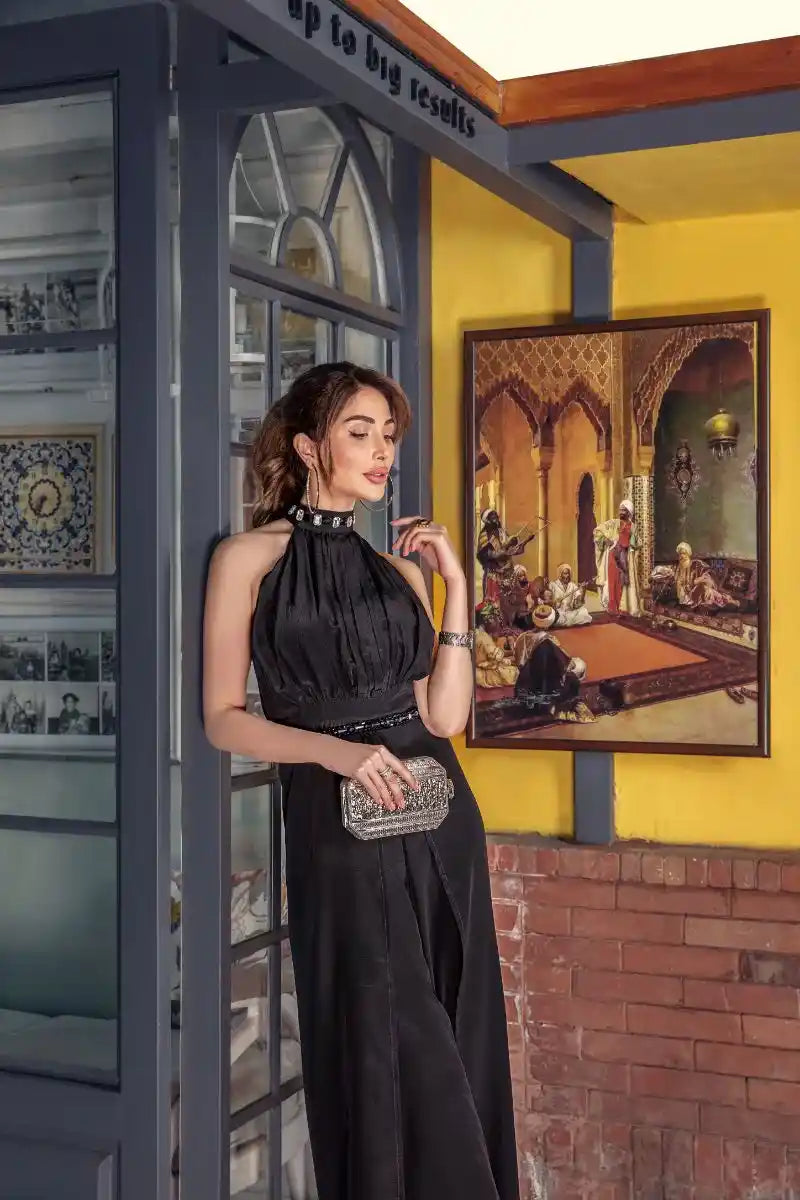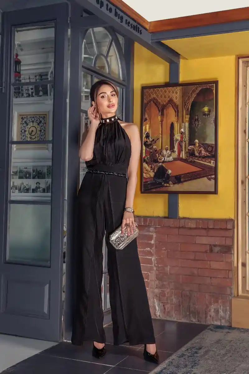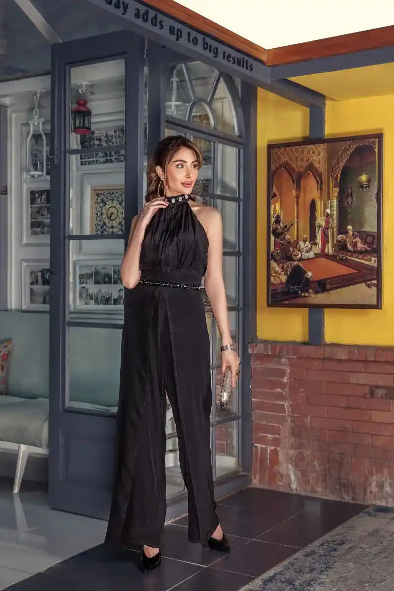 Adornan elegant look with this unique black jumpsuit. This jumpsuit has sumptuous embellished halter neckline with appealing crystals that enhance the beauty of this outfit. This design is so striking and is the ultimate style statement.