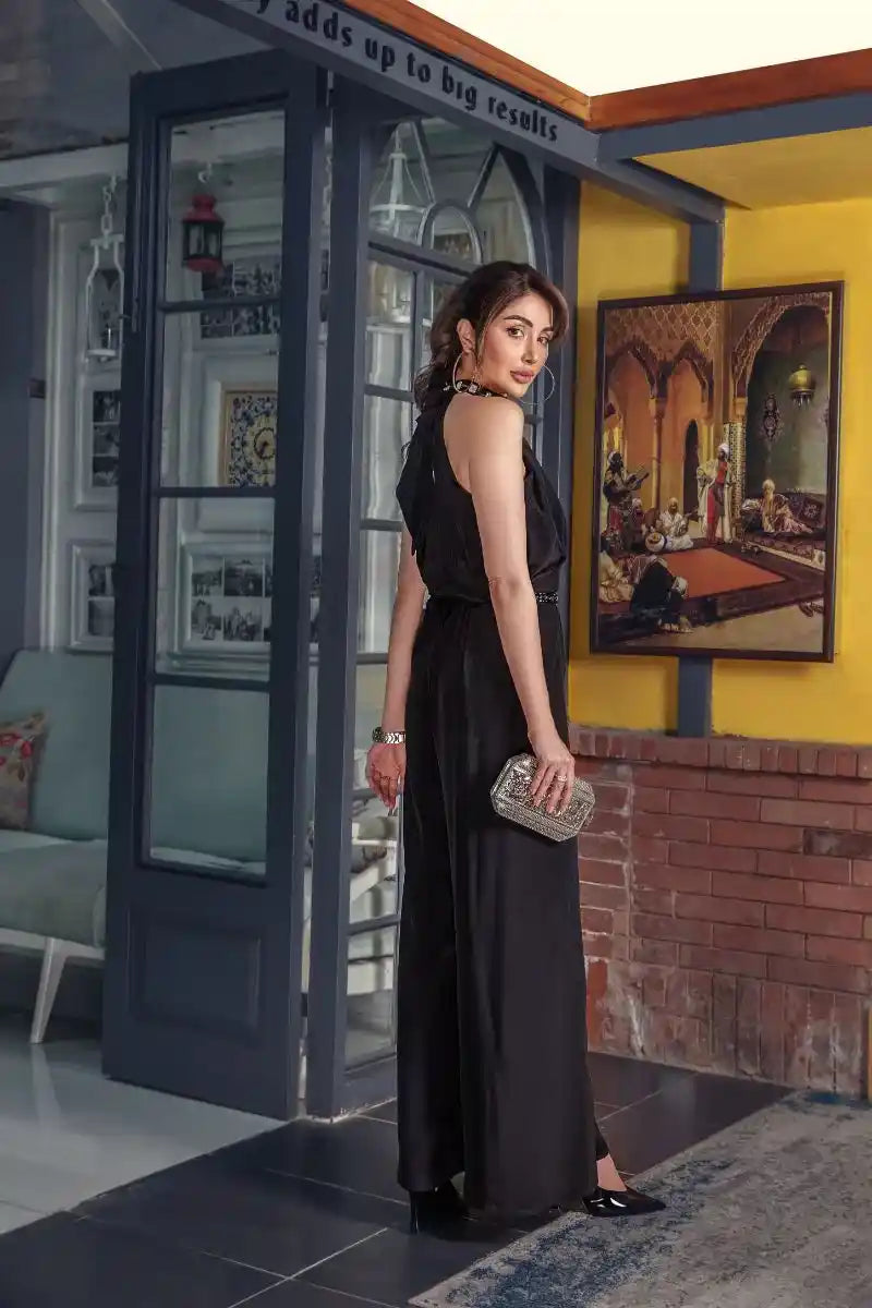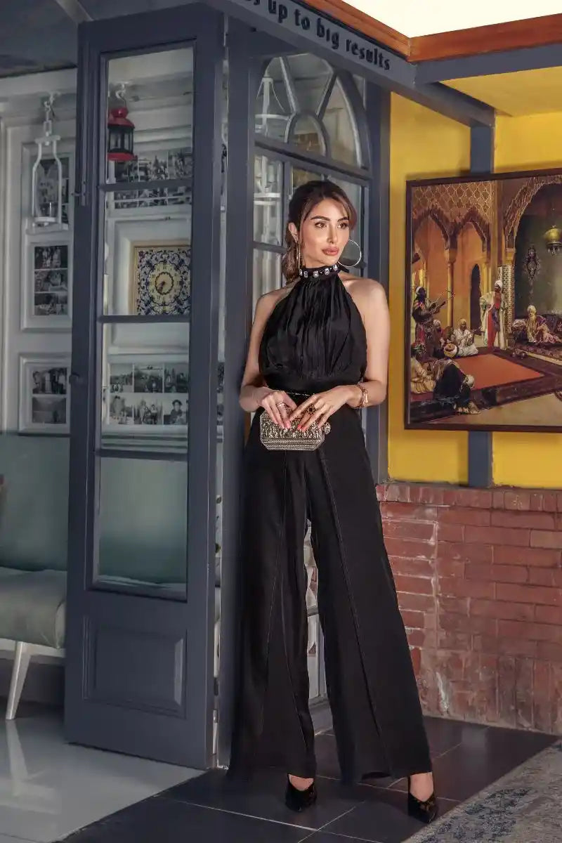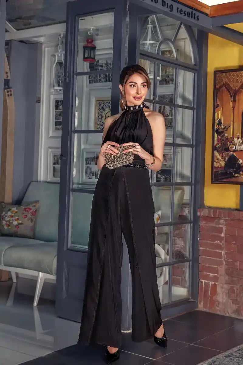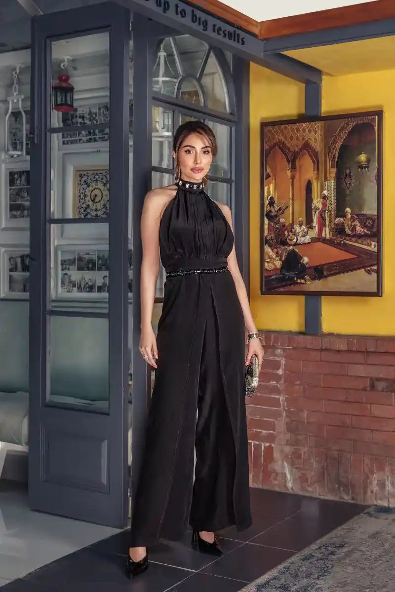 Adornan elegant look with this unique black jumpsuit. This jumpsuit has sumptuous embellished halter neckline with appealing crystals that enhance the beauty of this outfit. This design is so striking and is the ultimate style statement.