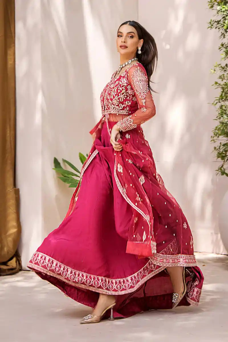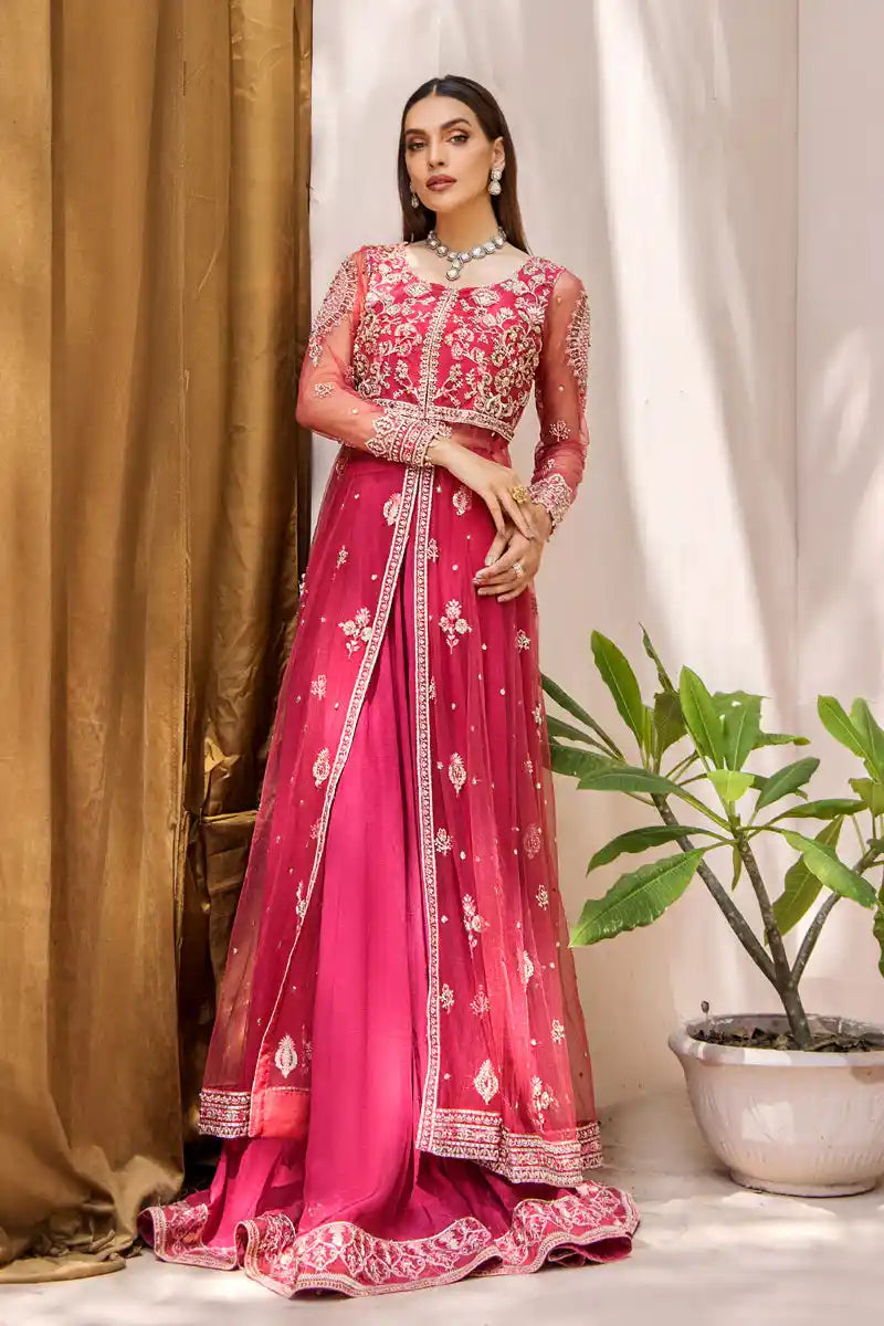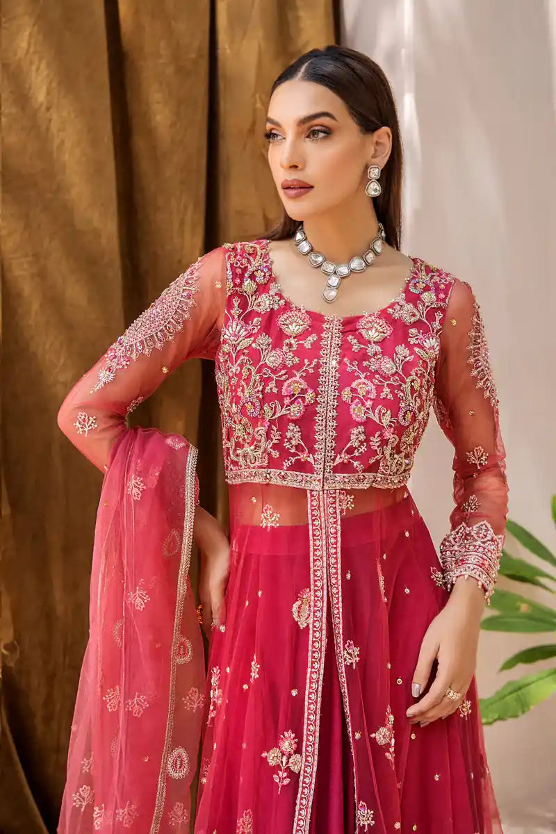 Mahjabeen is the culmination of expert artistry. The ensemble is remarkably enhanced with a delicate blend of sequins, pearls, pipes, stones, seroski, embroidery and zardozi work on a voluminous net pishwas. The statement silhouette comes paired with a form-fitting silk lehnga and net dupatta for the ultimate in wedding luxury.