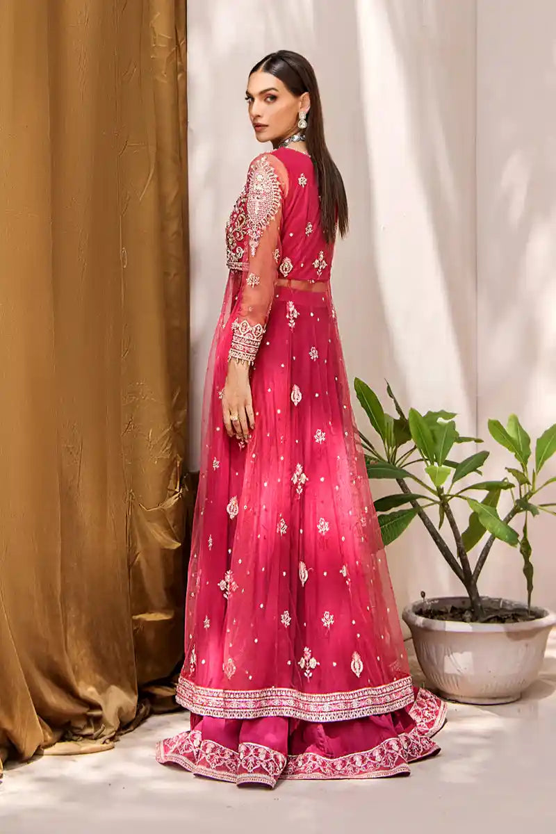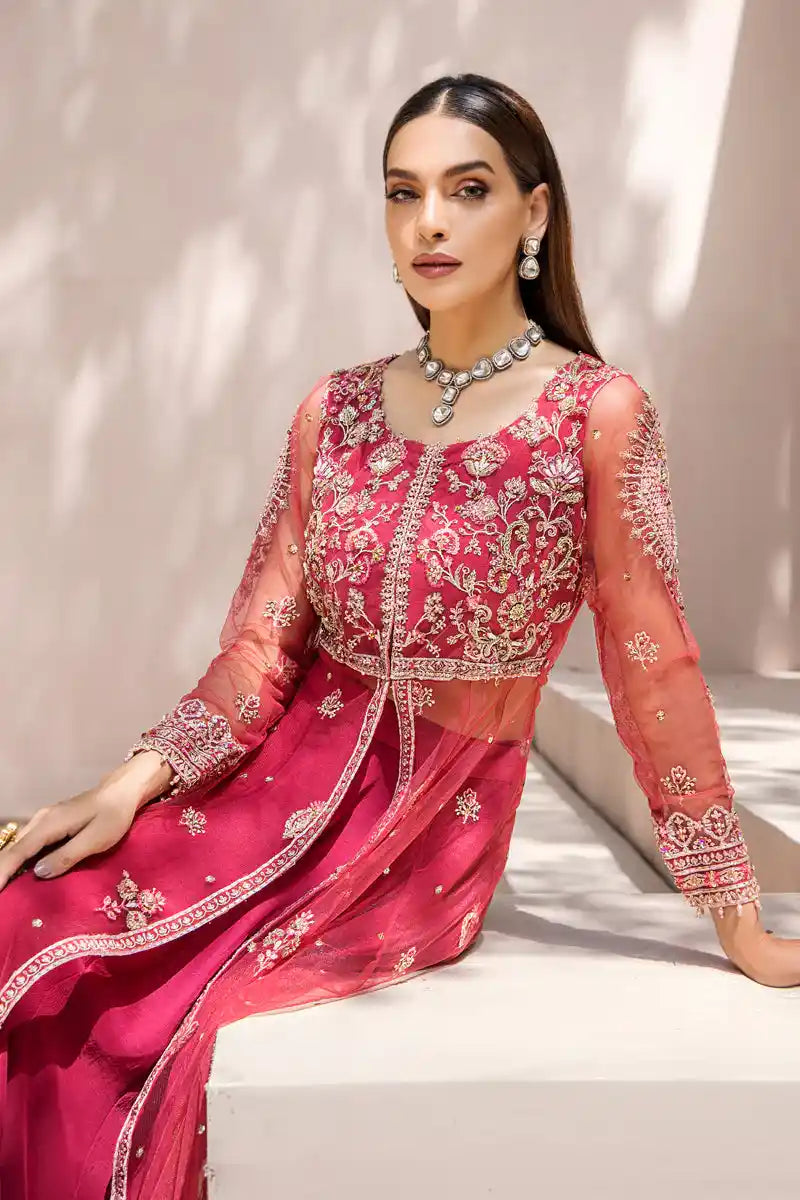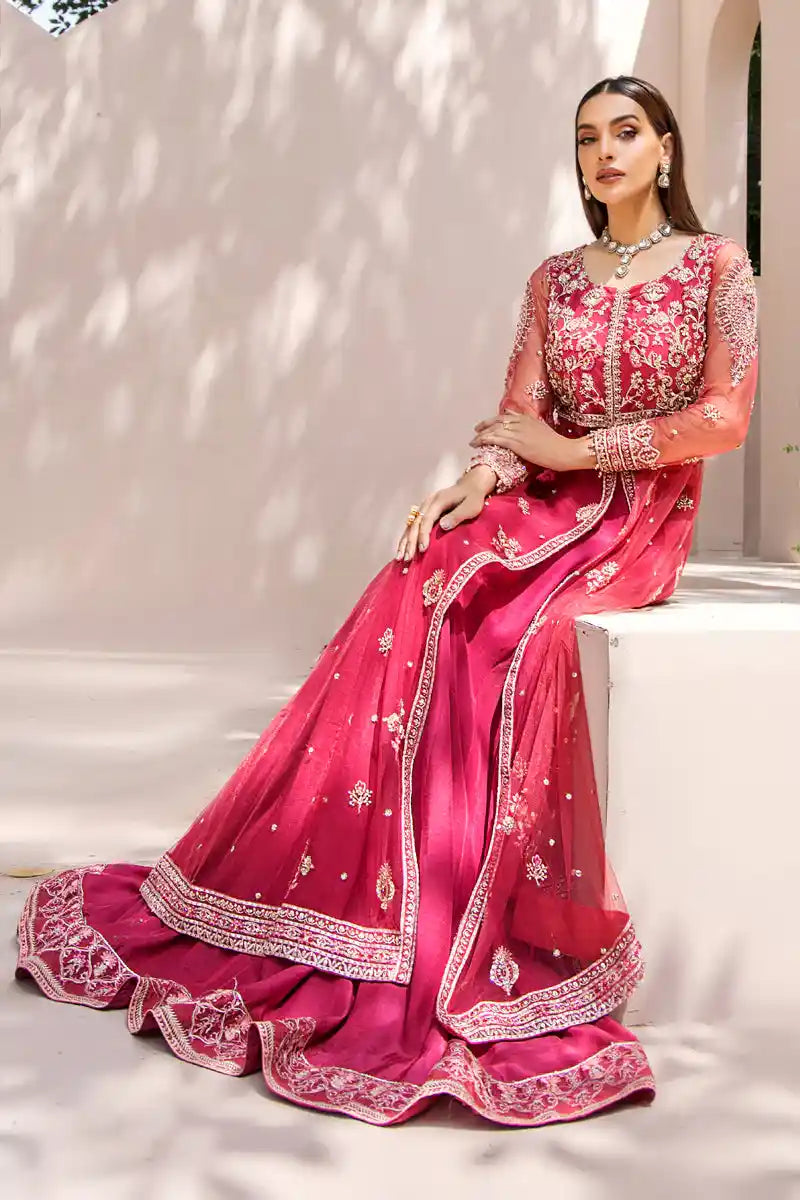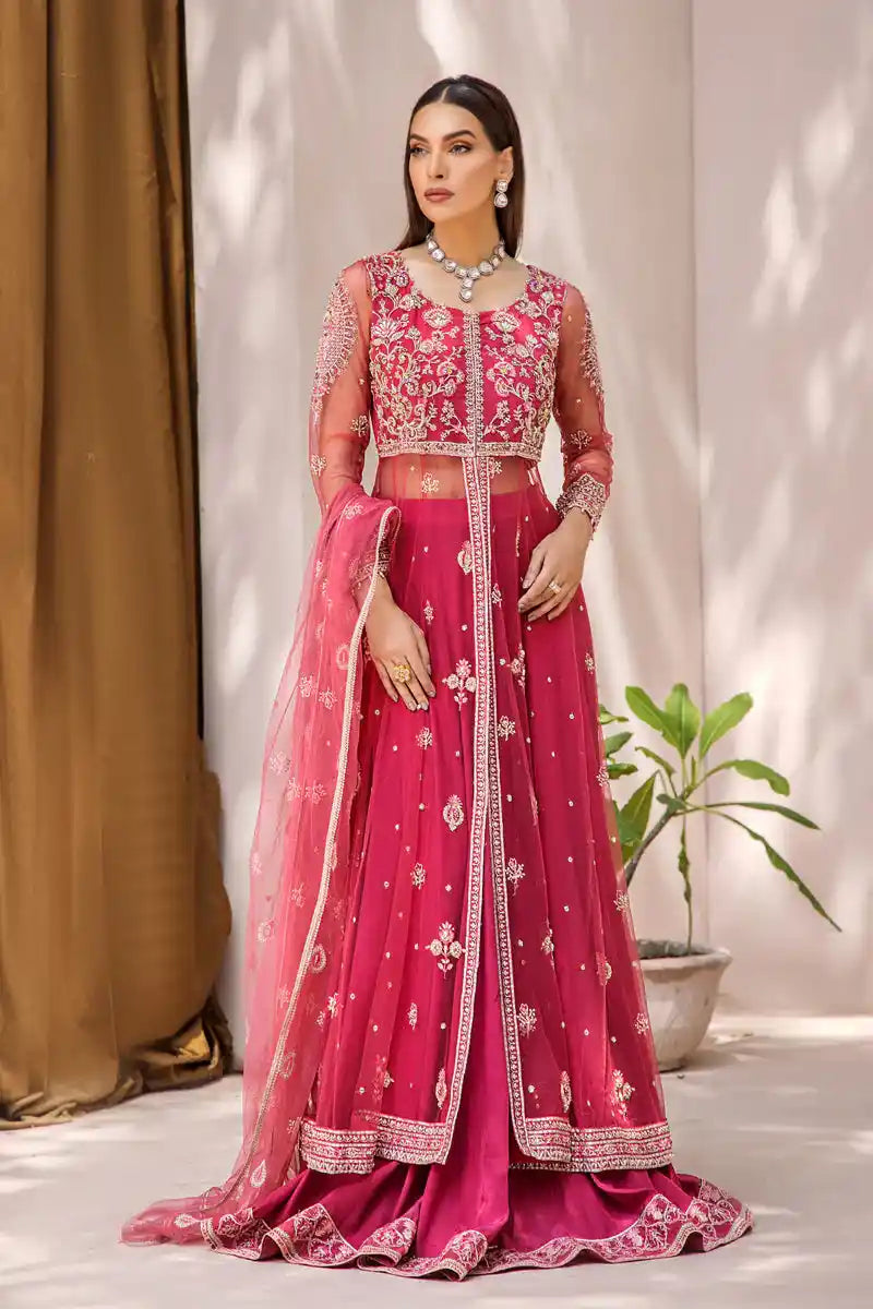 Mahjabeen is the culmination of expert artistry. The ensemble is remarkably enhanced with a delicate blend of sequins, pearls, pipes, stones, seroski, embroidery and zardozi work on a voluminous net pishwas. The statement silhouette comes paired with a form-fitting silk lehnga and net dupatta for the ultimate in wedding luxury.