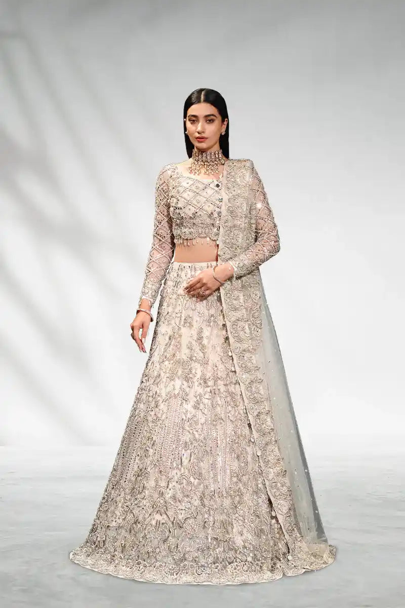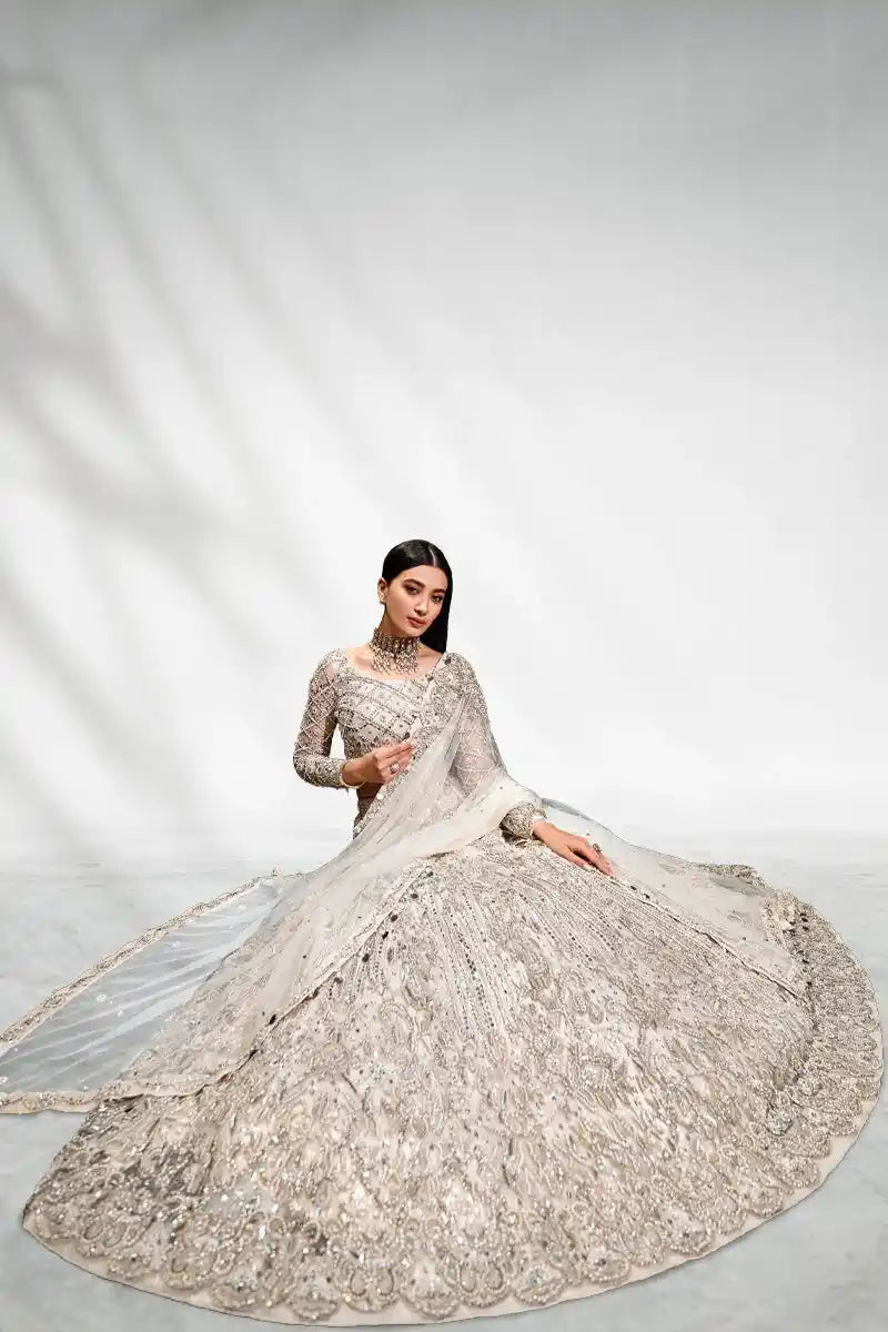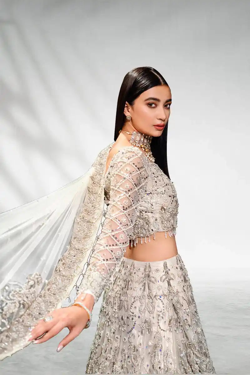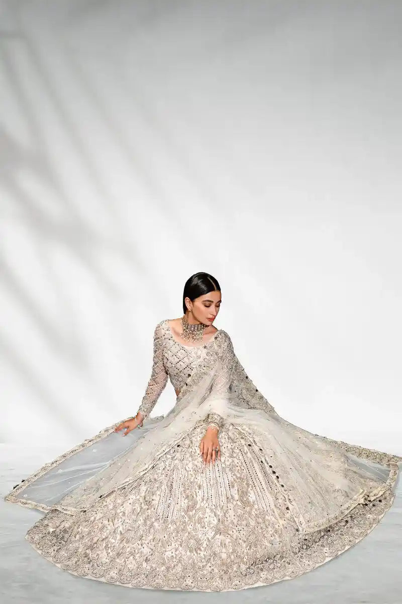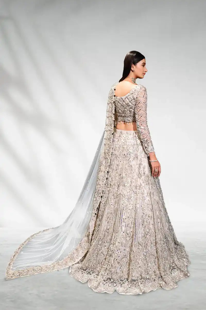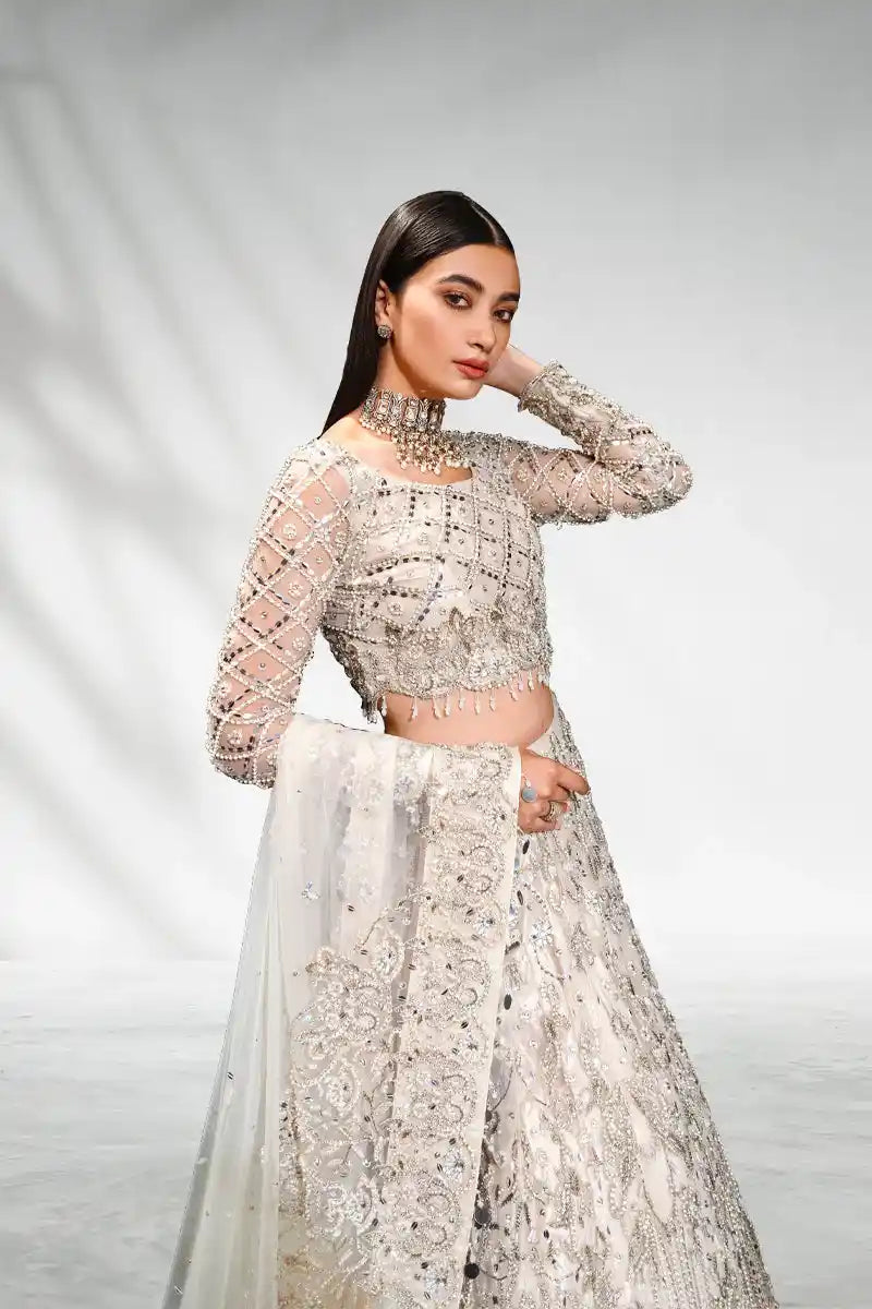 Bringing to life the quintessential magic, this bridal pairs along with net blouse and lehenga, heavily embellished with crystals, pearls and sequins. The amalgamation of ivory and silver with a traditional silhouette, gives a forever glamorous vibe. The geometrical and floral fusion of handwork pattern makes it modern and classy. The dupatta borders are beautifully embellished with spray of hand embellishments all over to give it a delicate finish. This grand outfit from Malook makes an opulent statement.