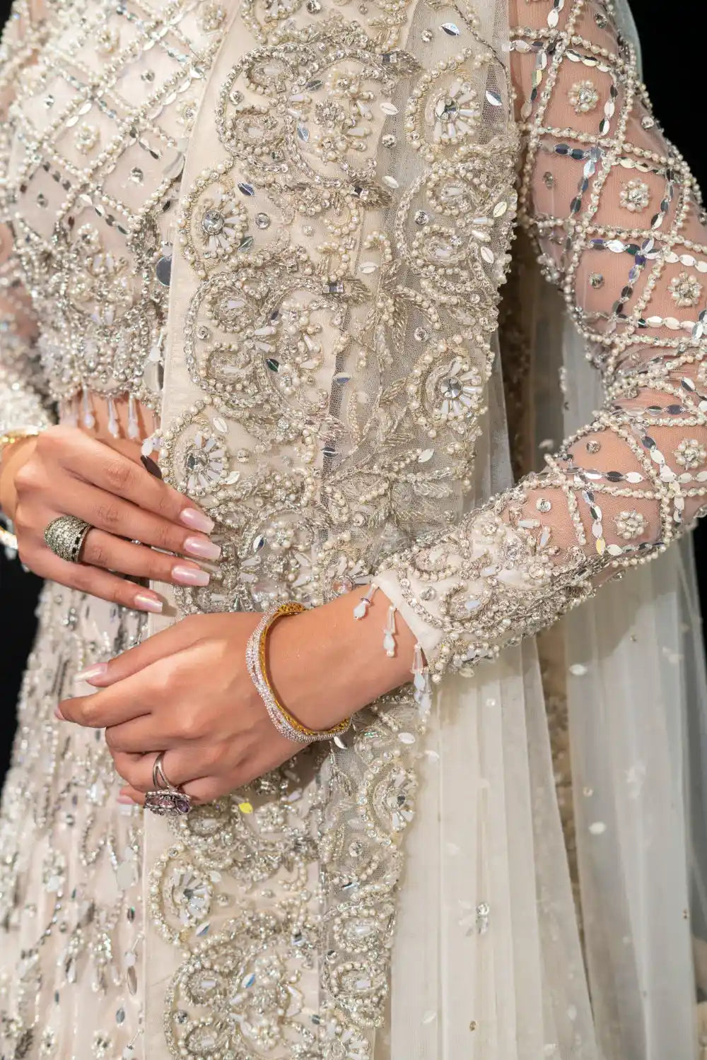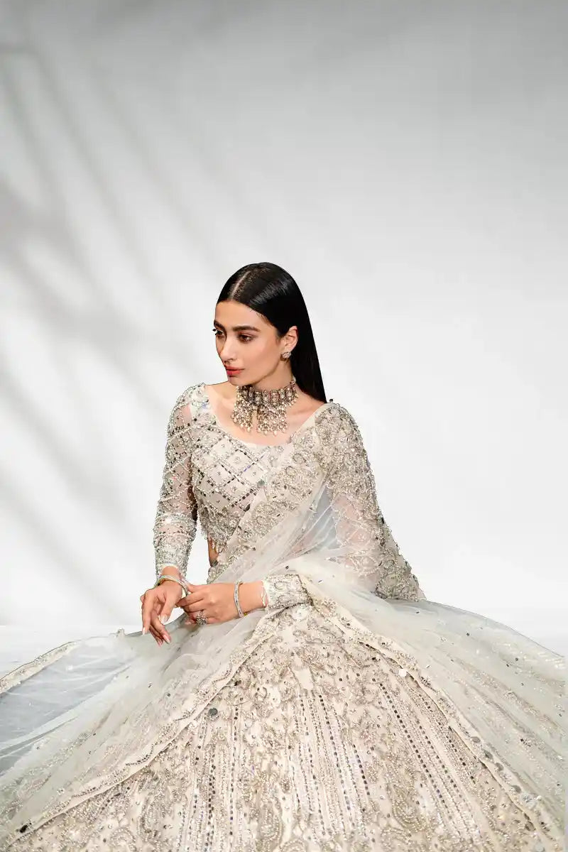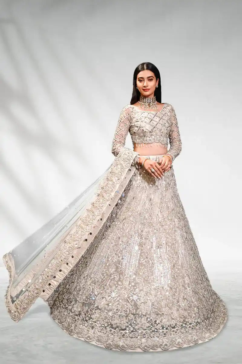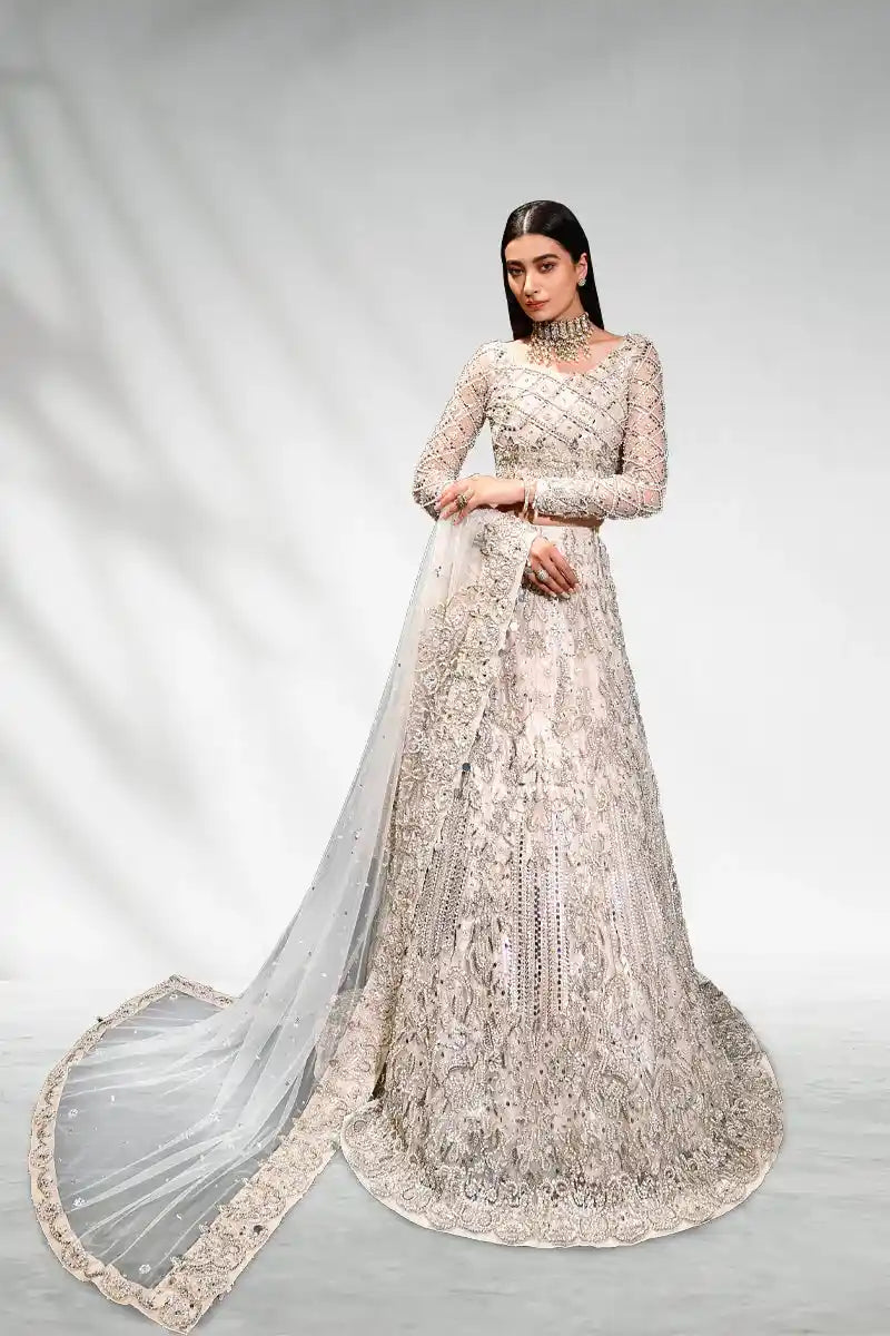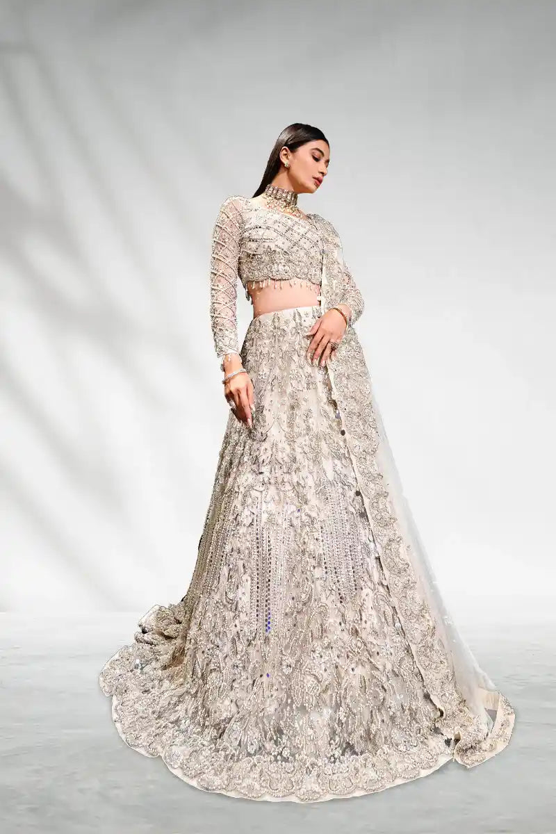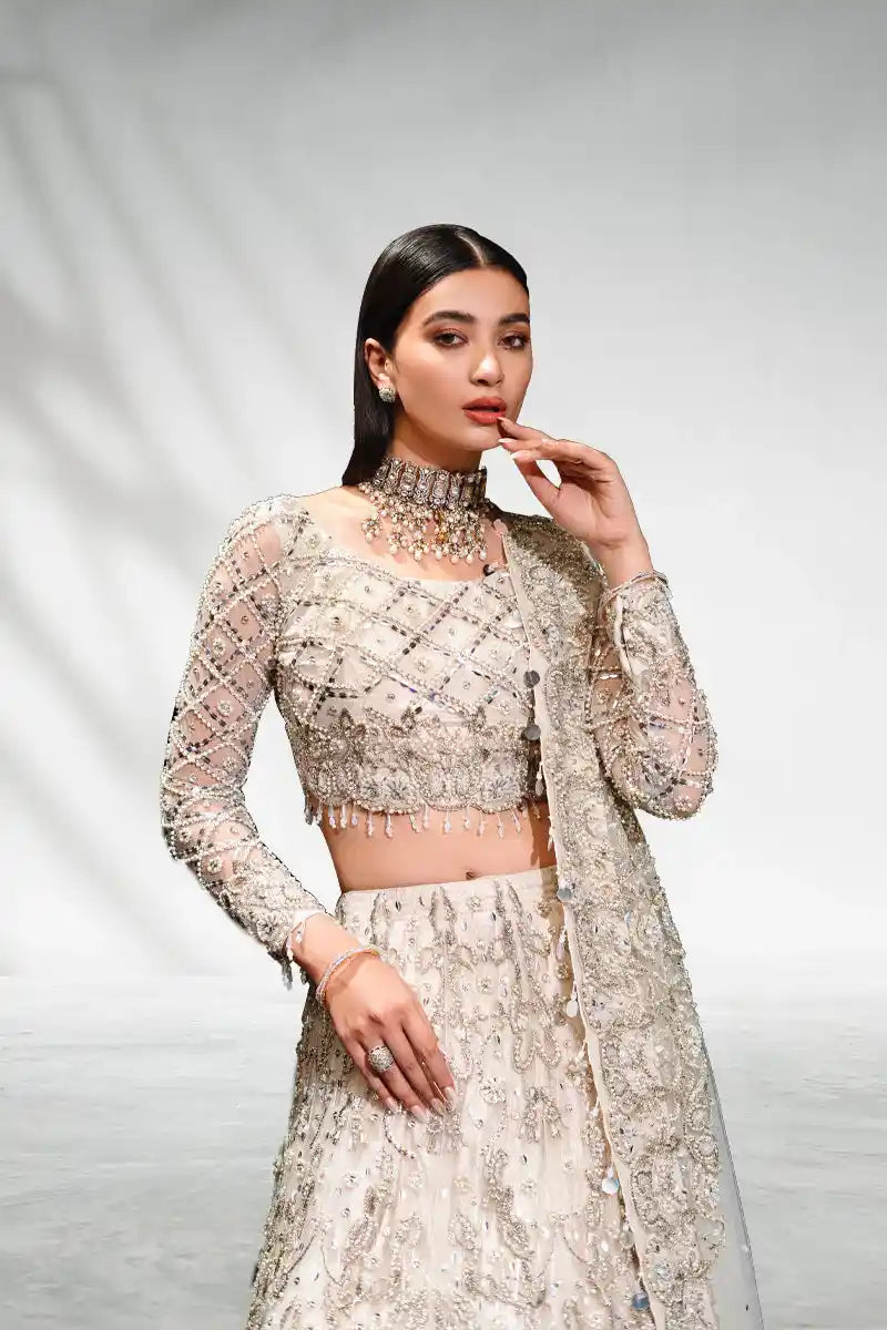 Bringing to life the quintessential magic, this bridal pairs along with net blouse and lehenga, heavily embellished with crystals, pearls and sequins. The amalgamation of ivory and silver with a traditional silhouette, gives a forever glamorous vibe. The geometrical and floral fusion of handwork pattern makes it modern and classy. The dupatta borders are beautifully embellished with spray of hand embellishments all over to give it a delicate finish. This grand outfit from Malook makes an opulent statement.
