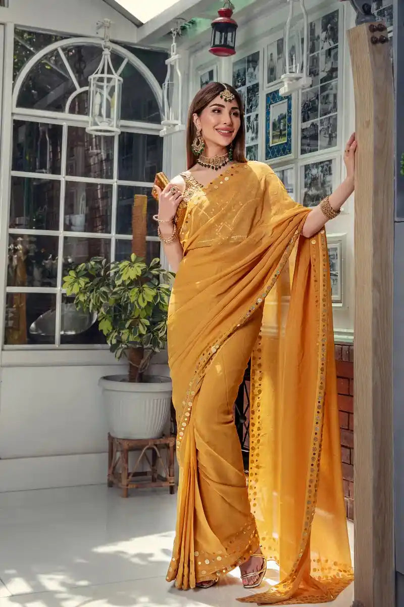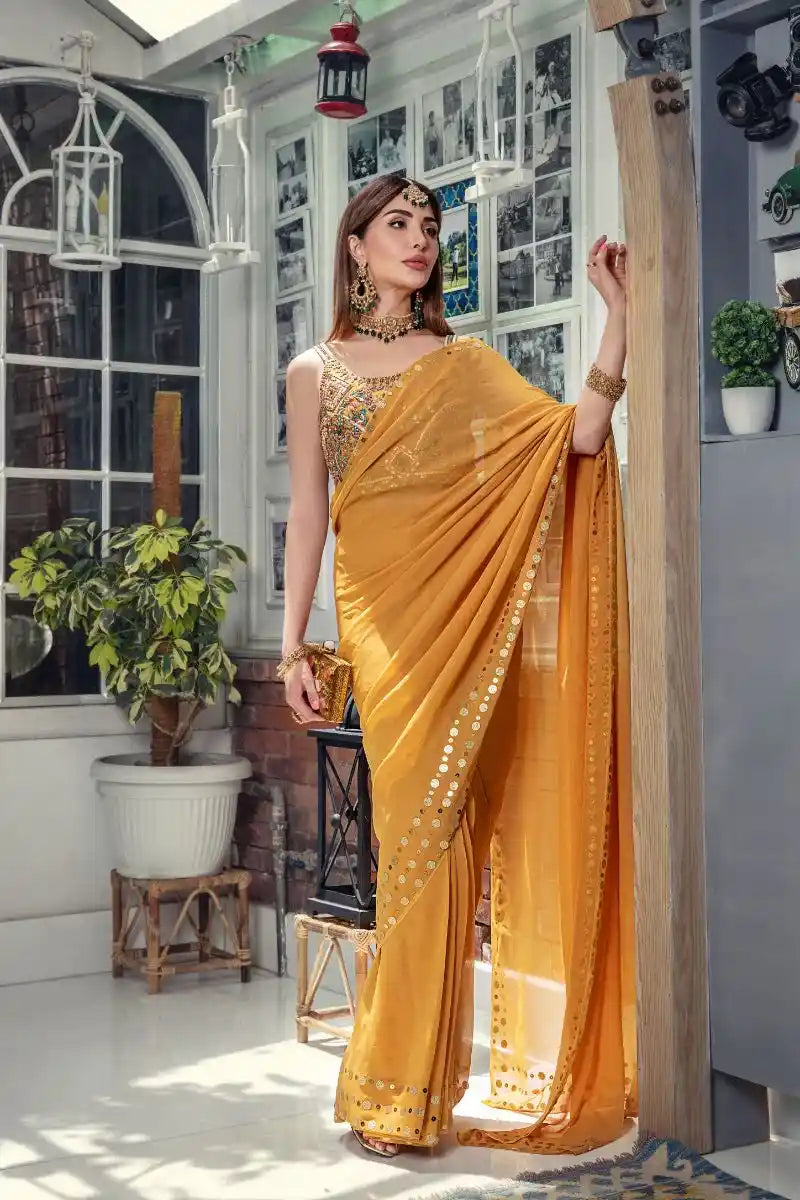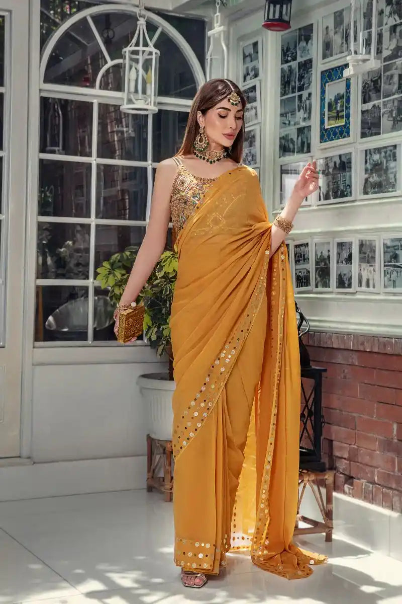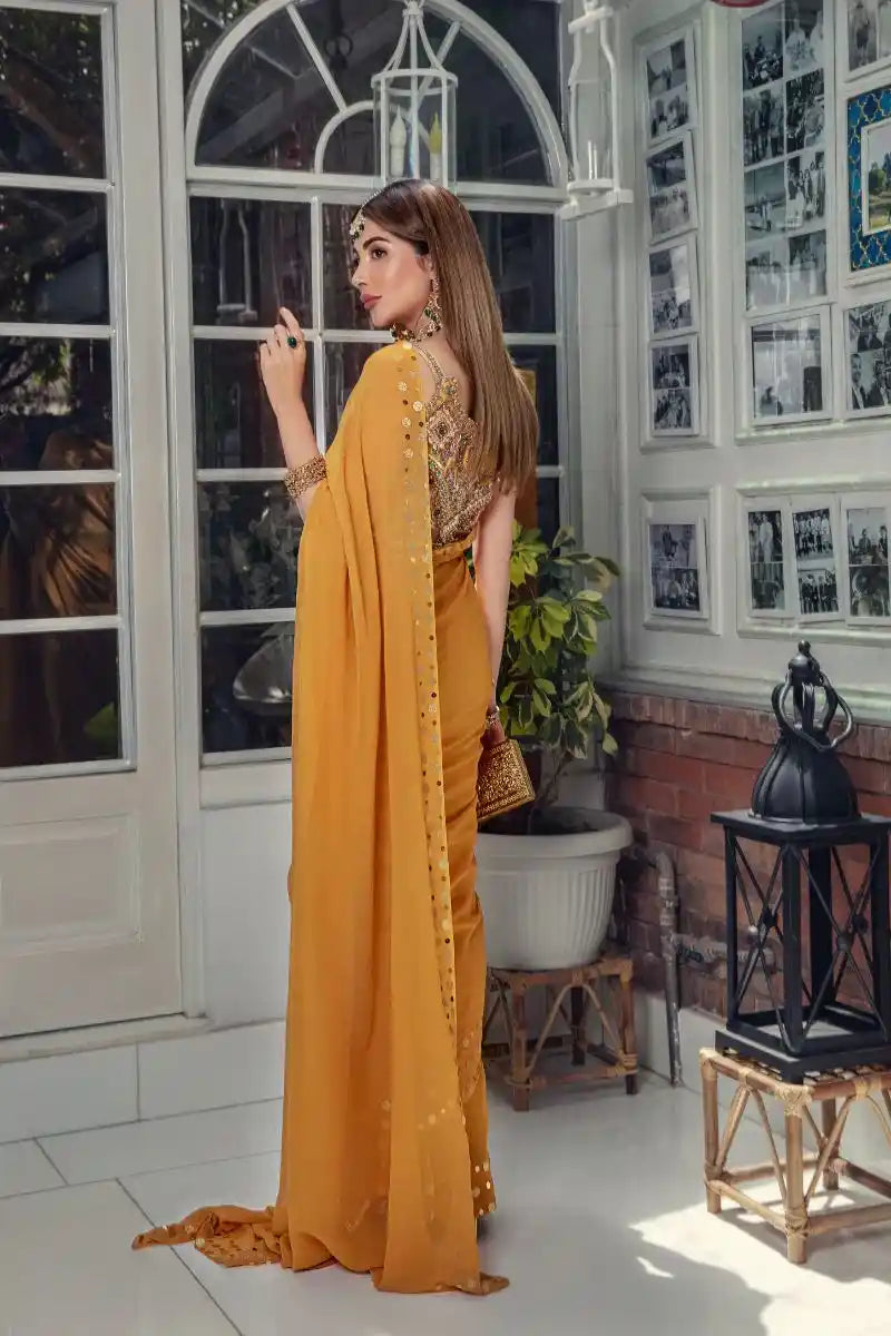 The most regal ‘Minha’ in a beautifully festive traditional yellow, this silhouette reflects royalty. The saree blouse is heavily embellished using intricate hand embroidery techniques with gotta, dabka, stones, lappa, crystals, resham and handmade flowers in exquisite motifs. The saree has a delicate border of gleamsy sequins, which gives the ensemble a flamboyant finish.