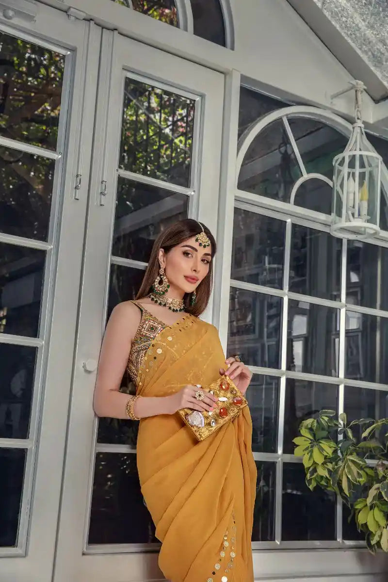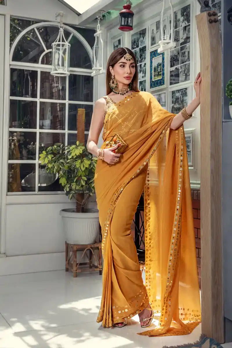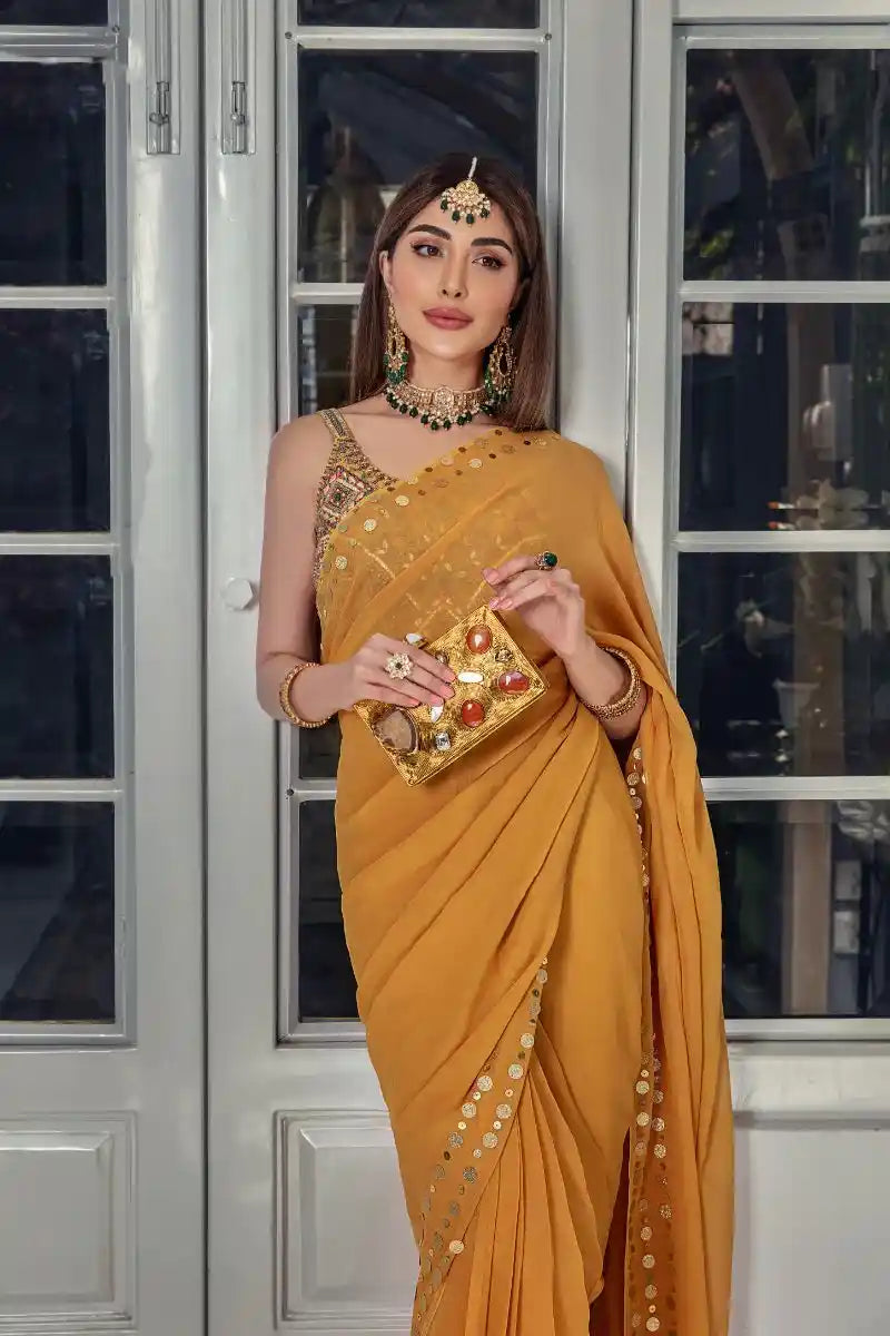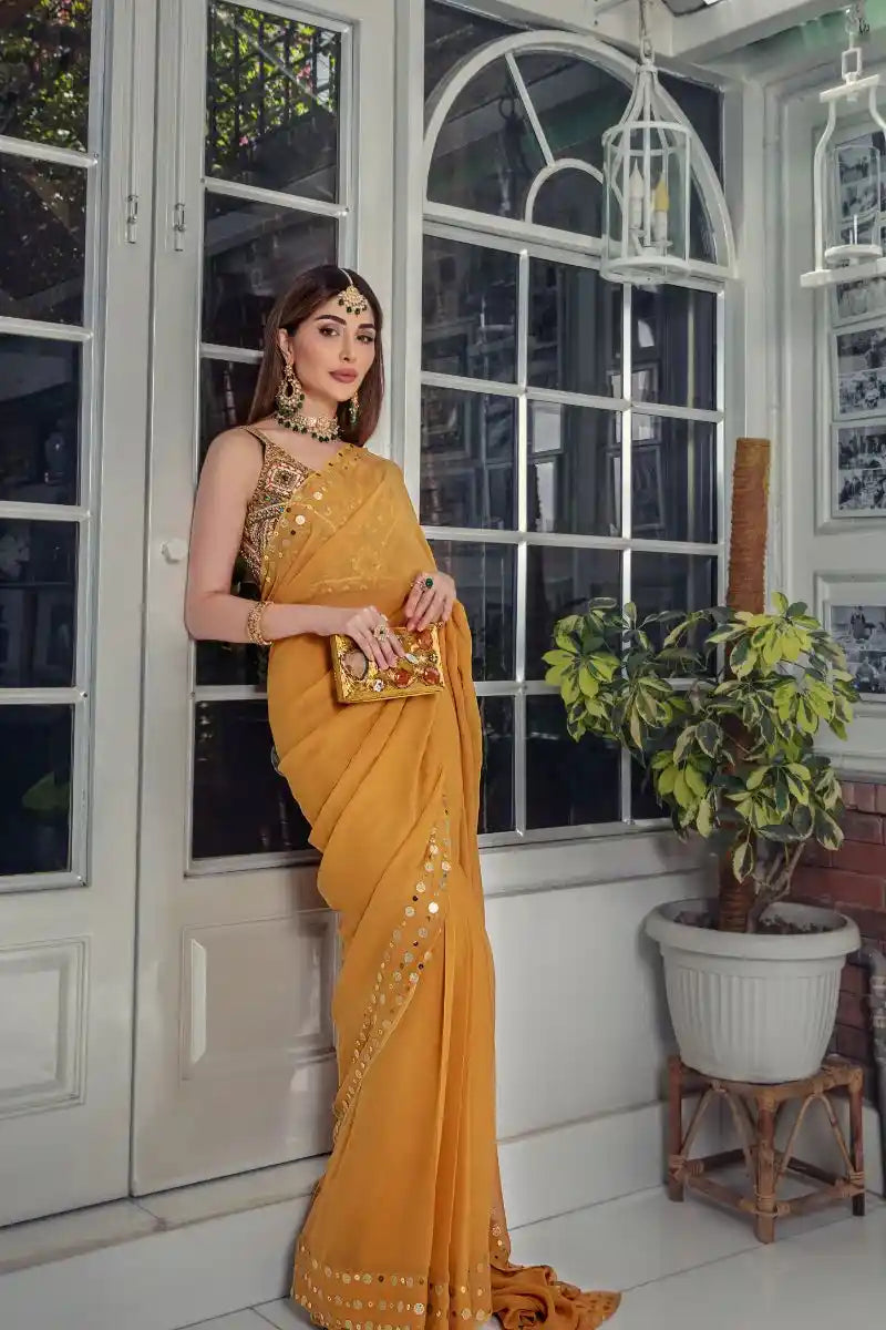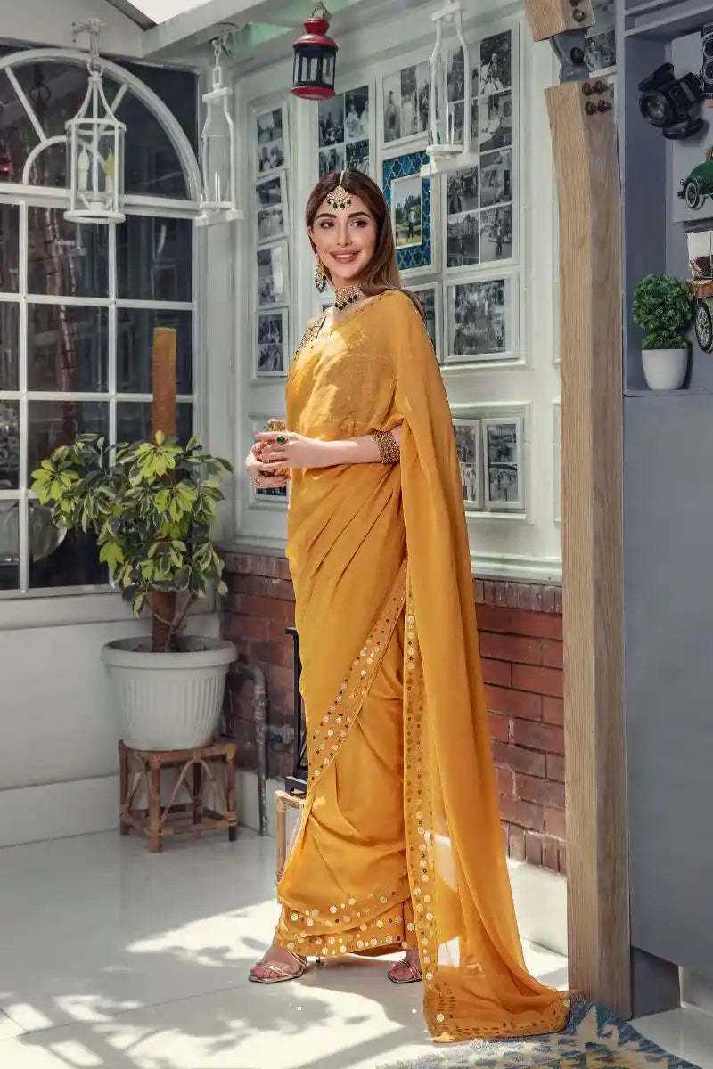 The most regal ‘Minha’ in a beautifully festive traditional yellow, this silhouette reflects royalty. The saree blouse is heavily embellished using intricate hand embroidery techniques with gotta, dabka, stones, lappa, crystals, resham and handmade flowers in exquisite motifs. The saree has a delicate border of gleamsy sequins, which gives the ensemble a flamboyant finish.