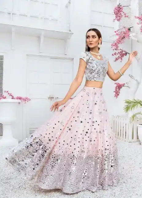 Beautiful lehnga choli is heavily hand embellished with mirror work. 2 Piece Dress (Lehnga + Choli)