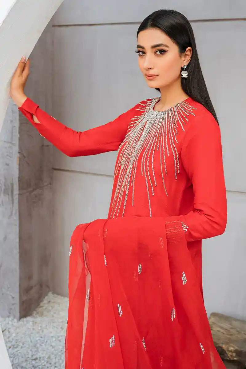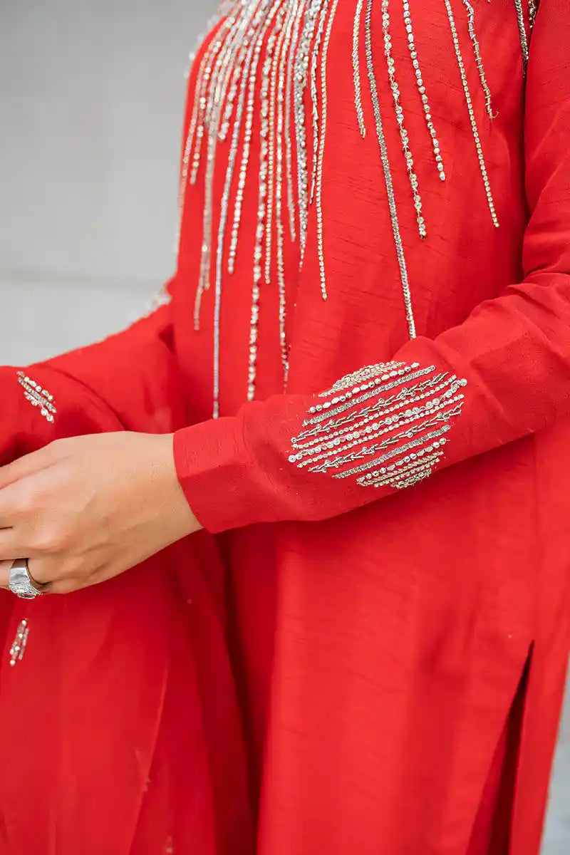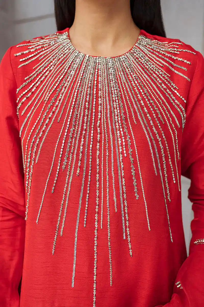 In an elegant ode to tradition a raw silk long modern cut shirt, hand worked with appealing and sparkling embellishments. Nawal is a long red shirt with embellished rays at neckline and sleeves. The long shirt is paired with trouser and hand embellished organza dupatta. It is a statement piece that is bound to turn heads at an evening soiree.