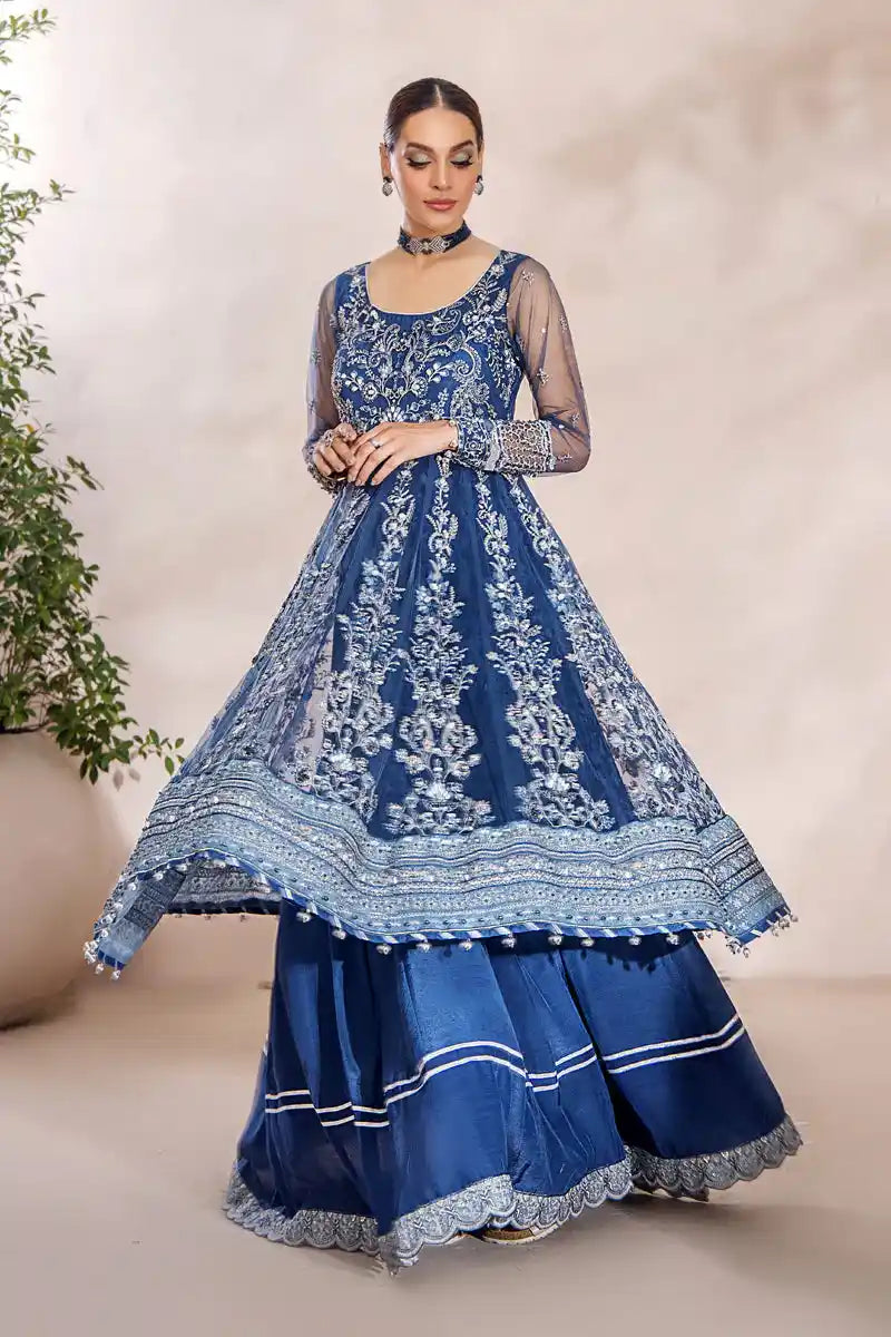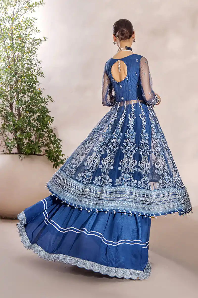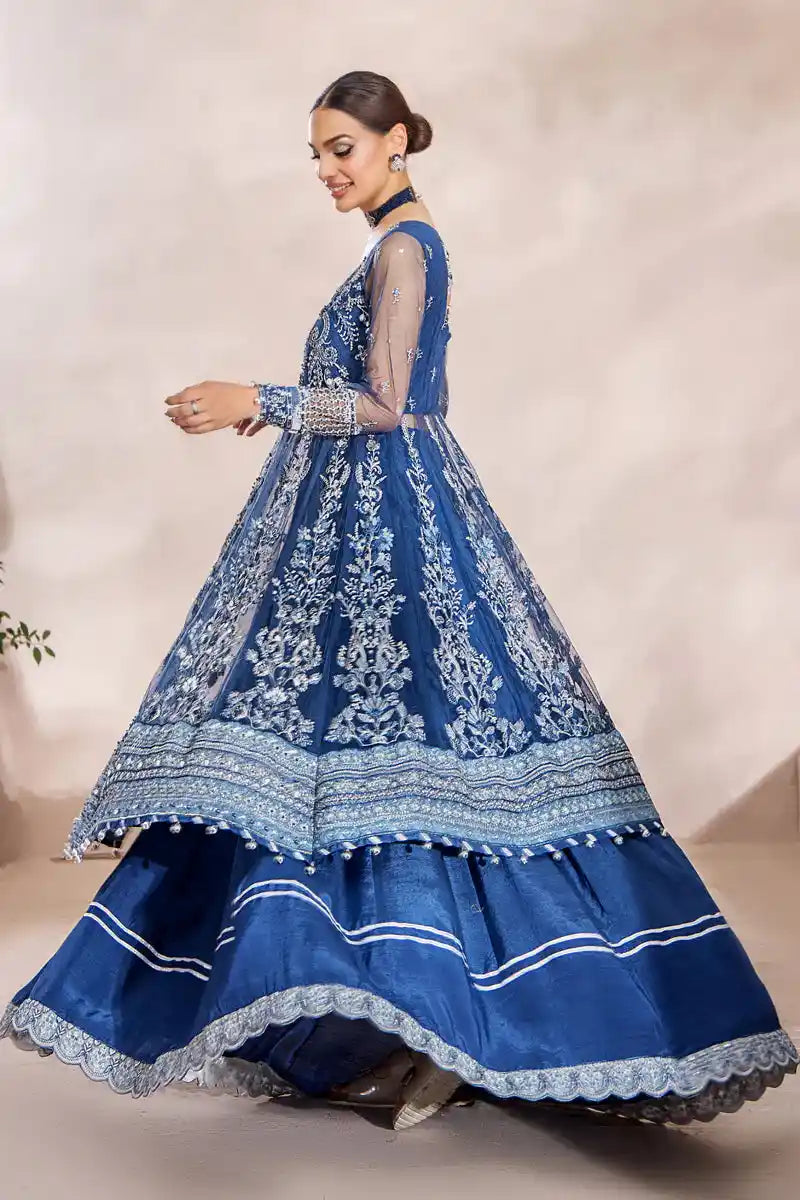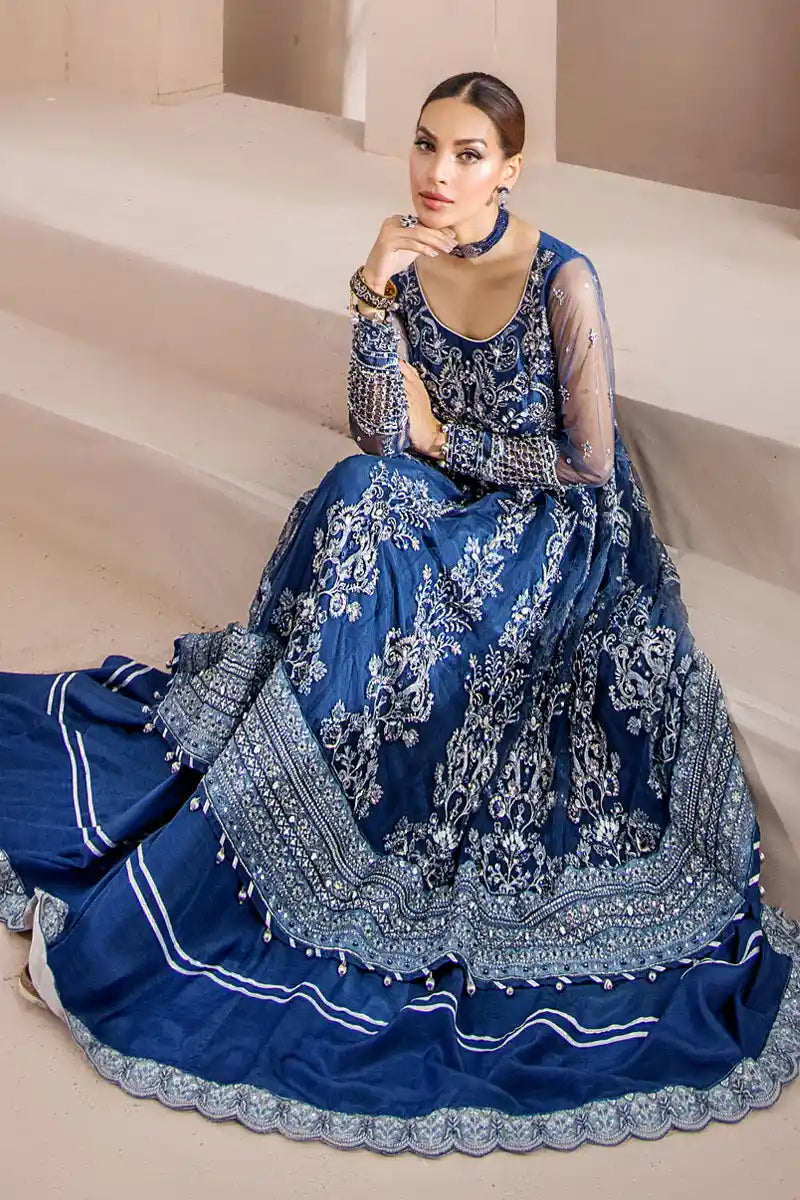Pareeshay is a mesmerizing assemblage of the finest artisanal crafts. Primed by exceptionally skilled artisans, the mélange of pearls, Sequins, zardozi work and embroidery on a sweeping net pishwas is extravagant. Giving an air of regality to the ensemble are the finely ornamented organza dupatta and silk lehnga in an über-feminine blue hue.