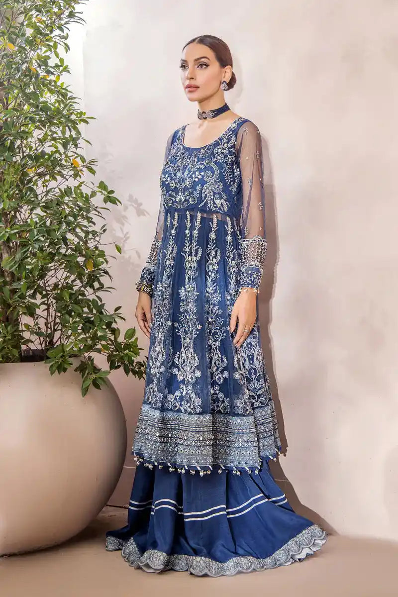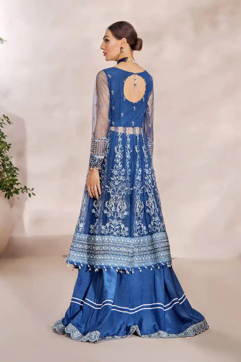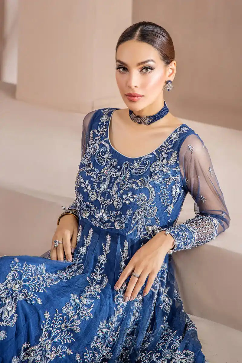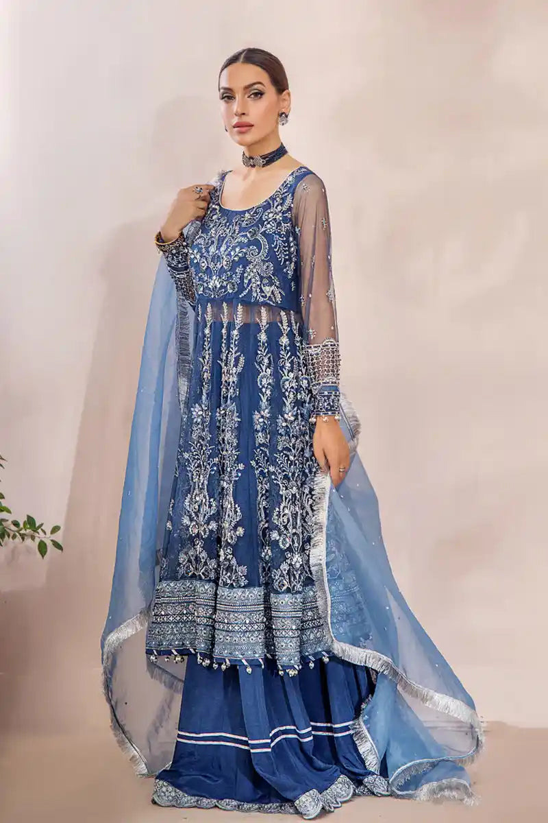 Pareeshay is a mesmerizing assemblage of the finest artisanal crafts. Primed by exceptionally skilled artisans, the mélange of pearls, Sequins, zardozi work and embroidery on a sweeping net pishwas is extravagant. Giving an air of regality to the ensemble are the finely ornamented organza dupatta and silk lehnga in an über-feminine blue hue.