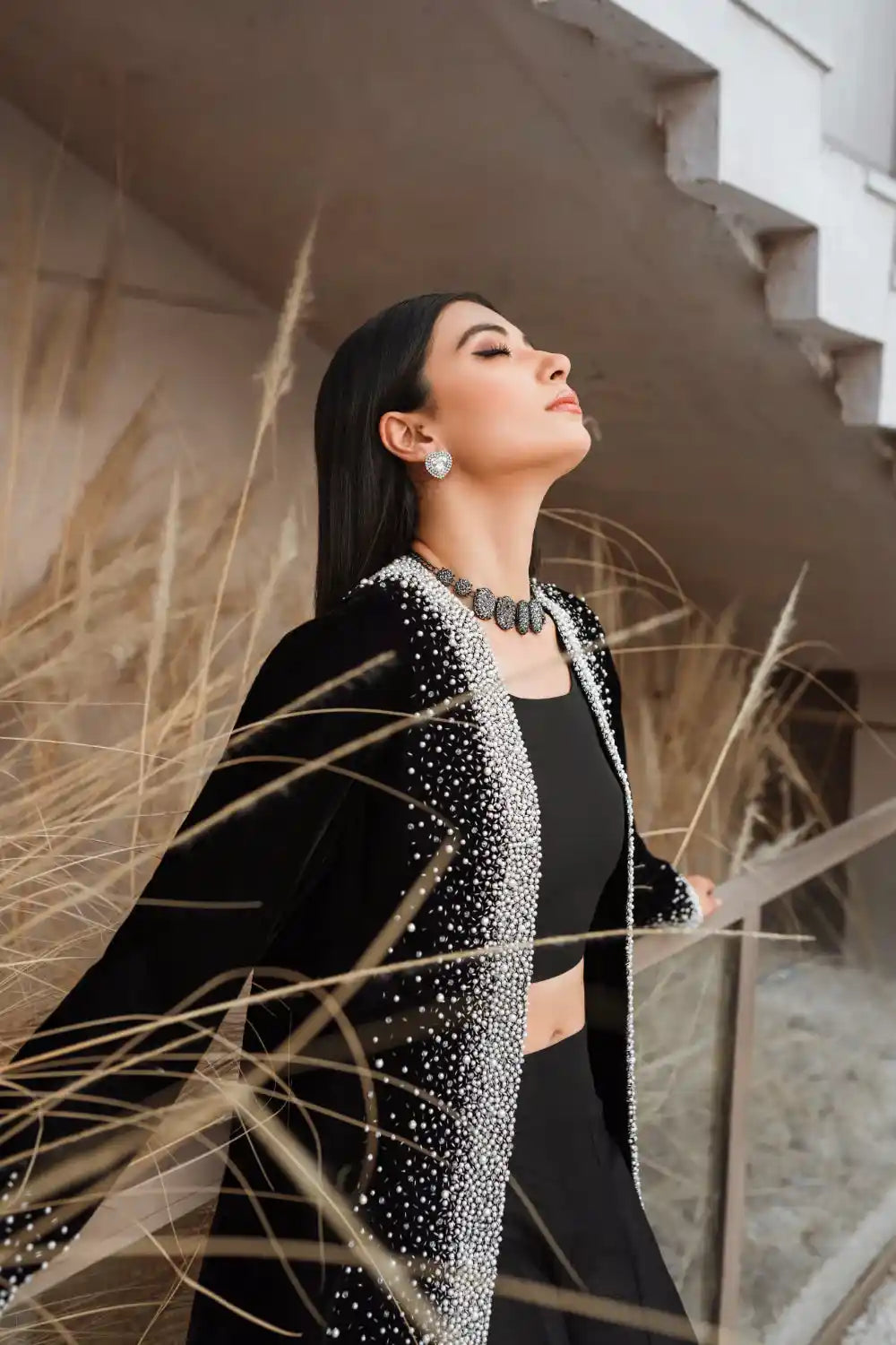A stunning royal blue cape with balletic embellishments of gleaming crystals at the front, back and on the sleeves. The gorgeously structured cape is worn, layered over a raw silk choli and bell bottoms pants (as shown) in the same verdant green. It comes along with a boot cut trouser and an inner. Its elegance is praise worthy entirely.