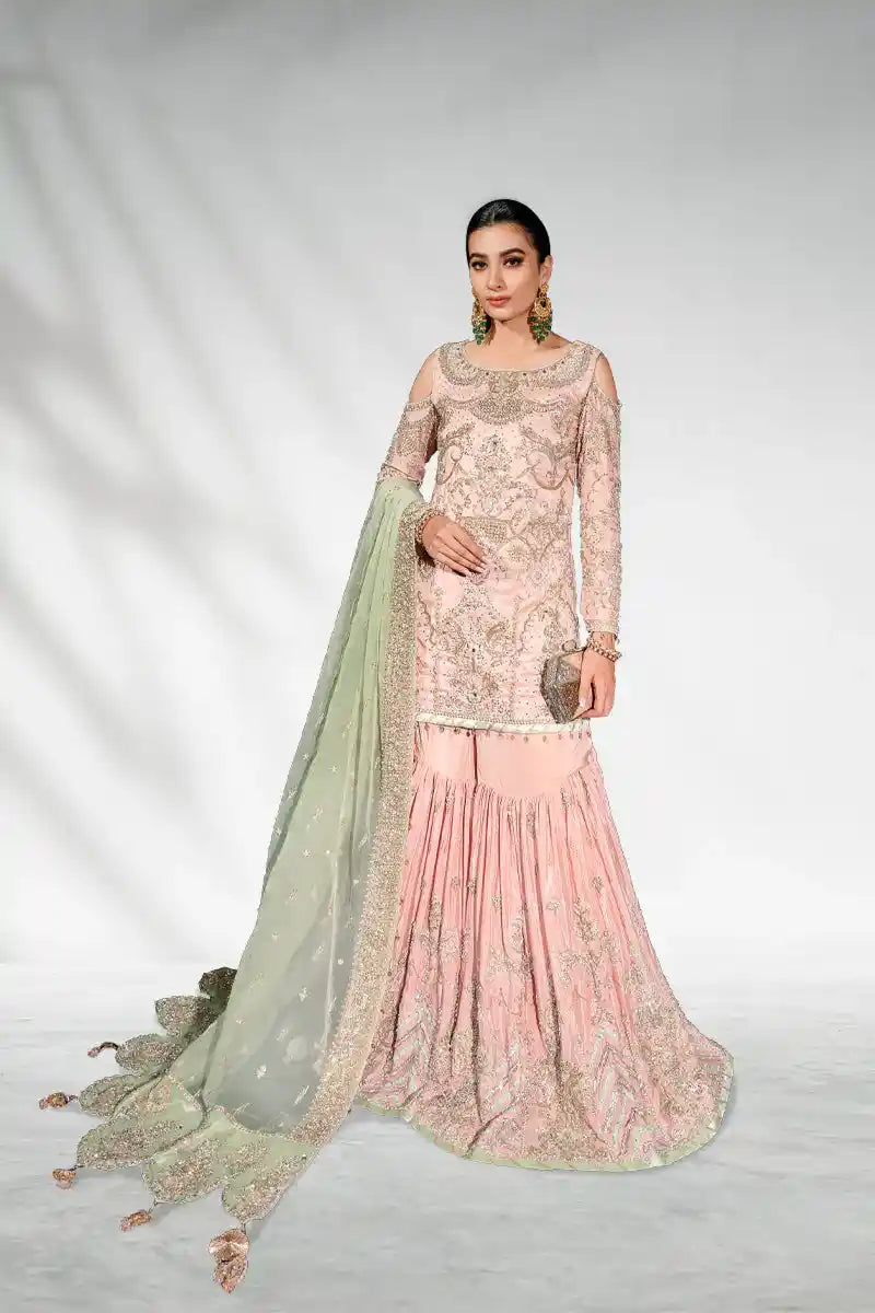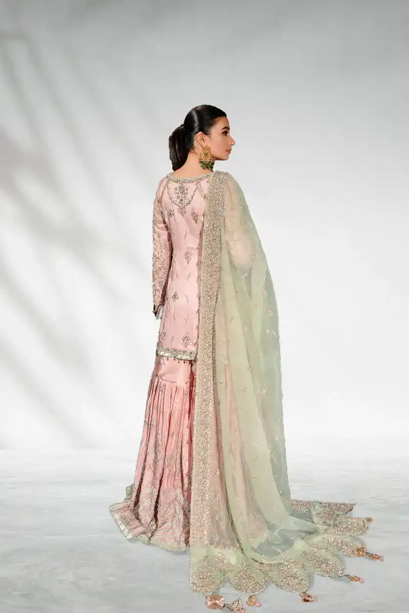 A truly stunning bridal which will have everyone mesmerized. A classic shade of pink raw silk is lavishly embellished with intricate embroidery and hand embellishments (bethki, dabka, sequins, tilla, pearls and handmade petals). The pink shirt is blooming with 3d petals and embellishments. Paired with flared gharara with heavily embellished border. Complementing the ensemble with the olive green organza dupatta with intricate and appealing embroideries and hand work. The scalloped border enhances its beauty. This silhouette with amalgamation of a traditional and antique heritage look is perfect for your special day.