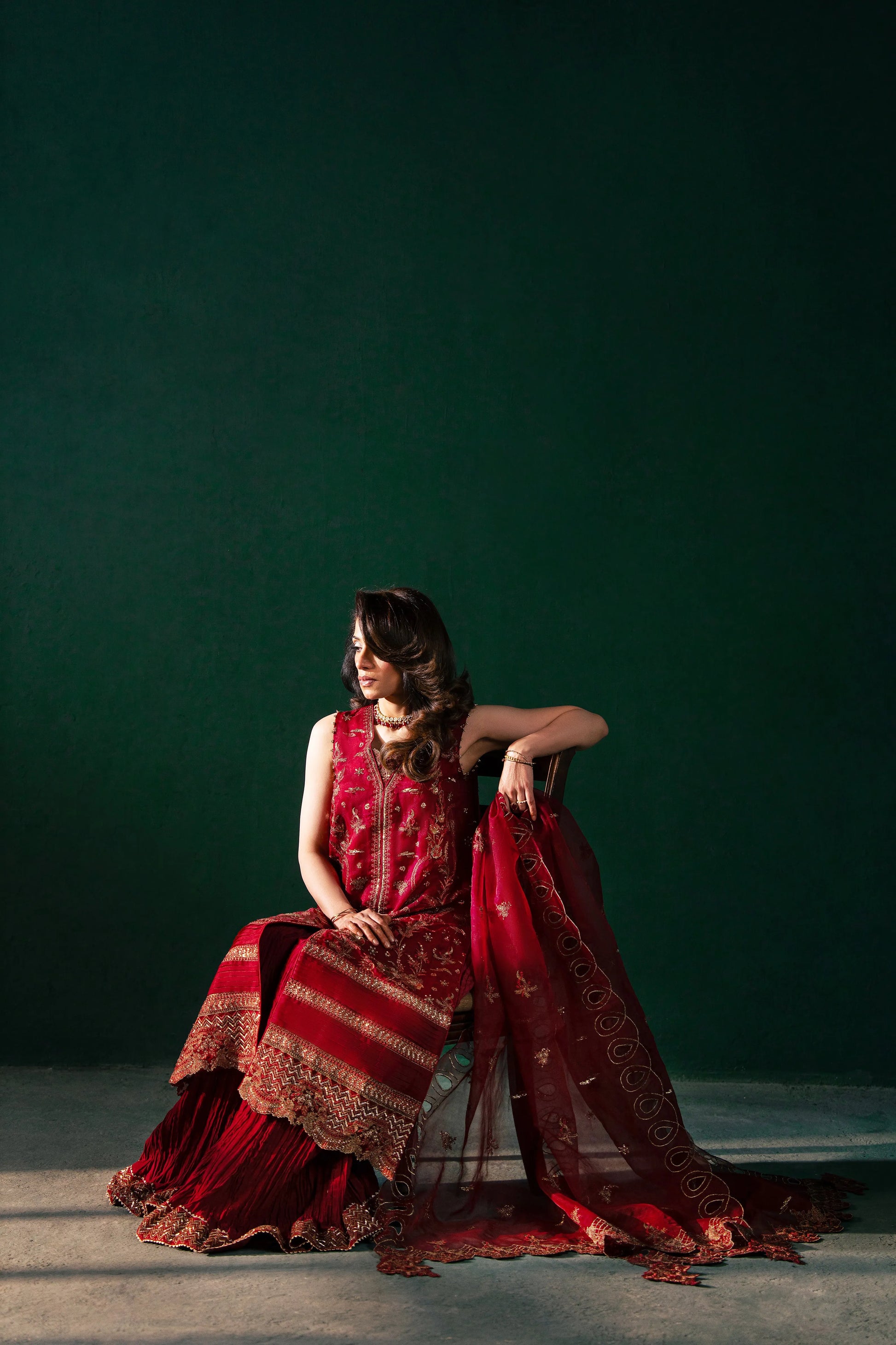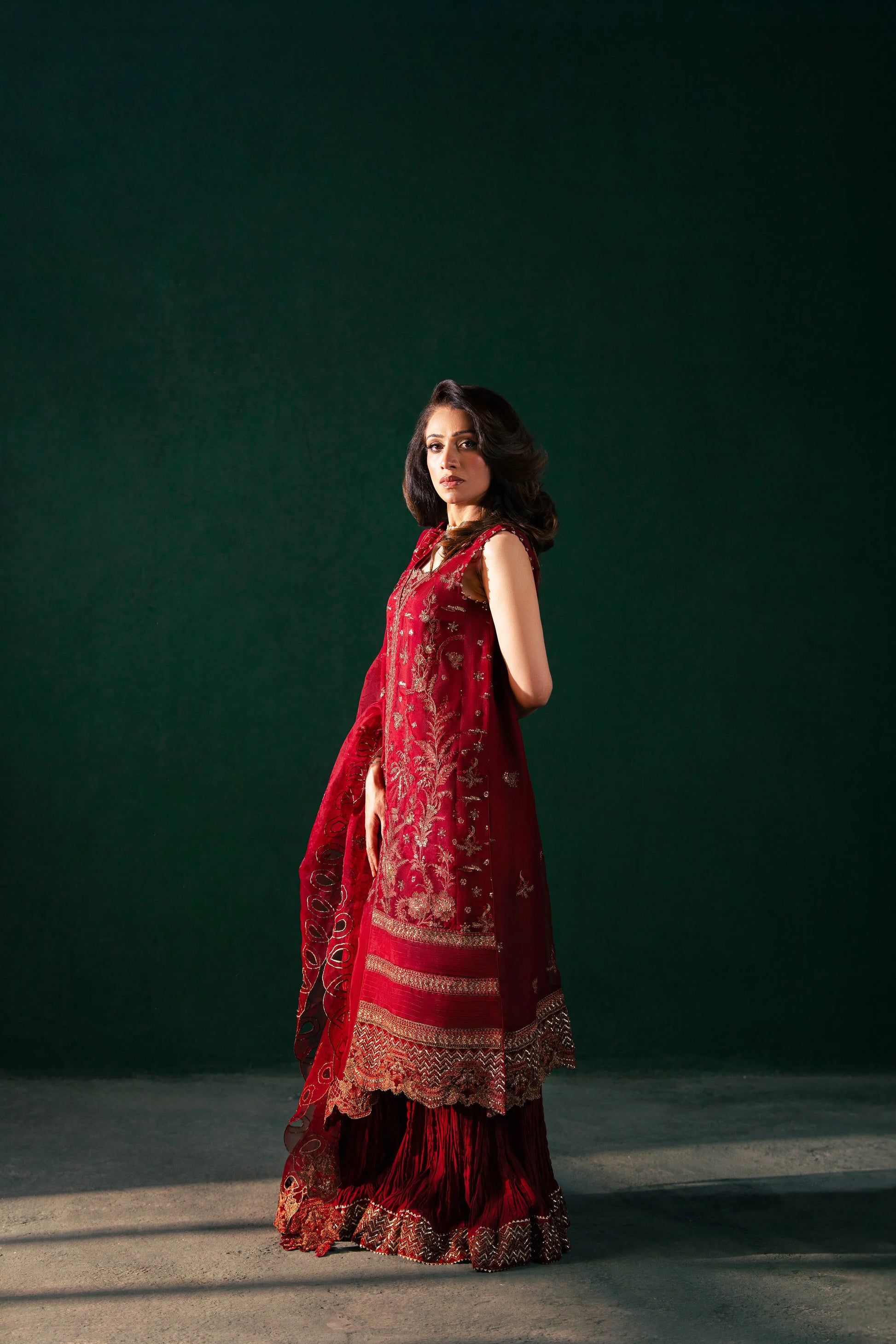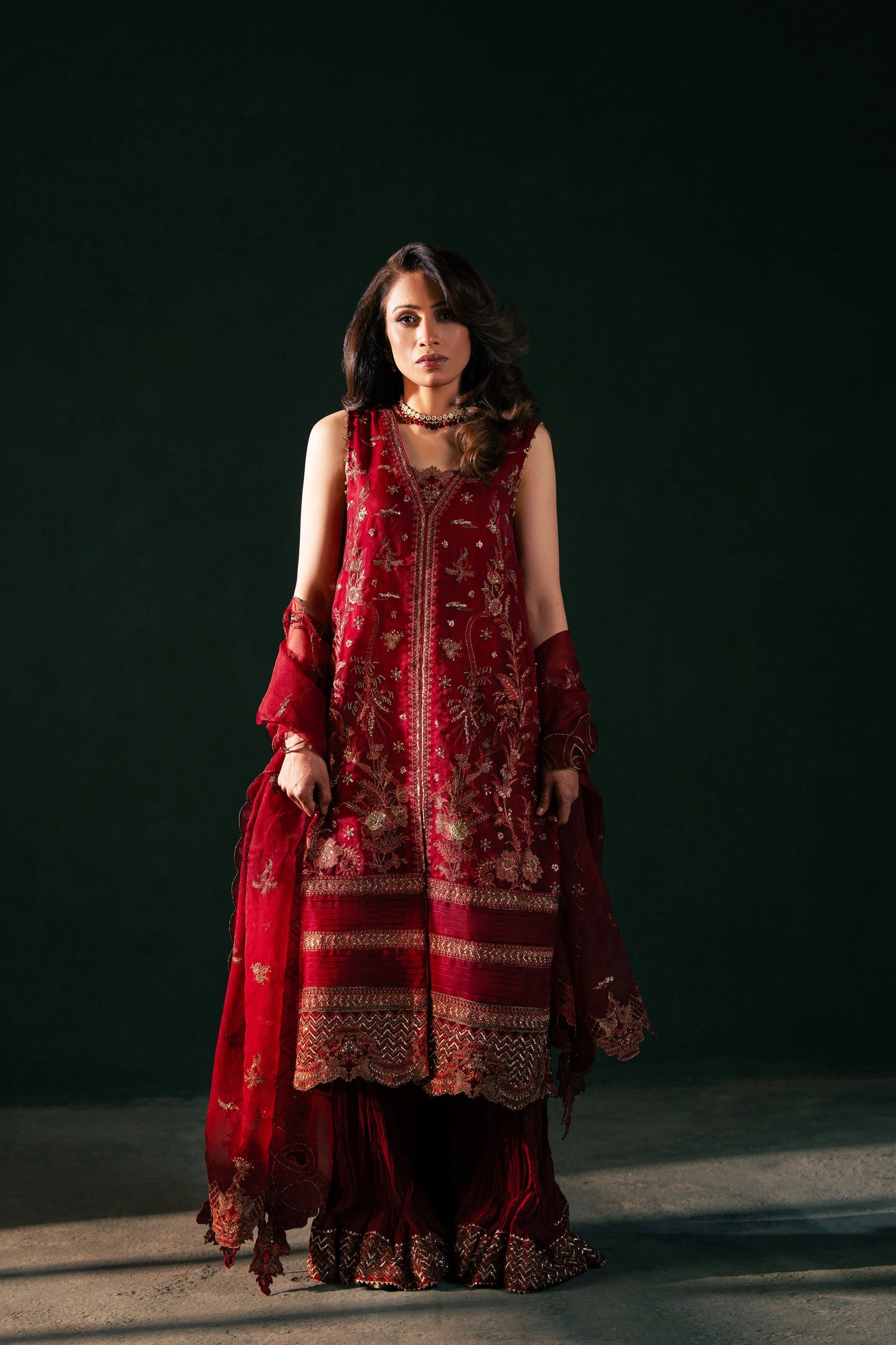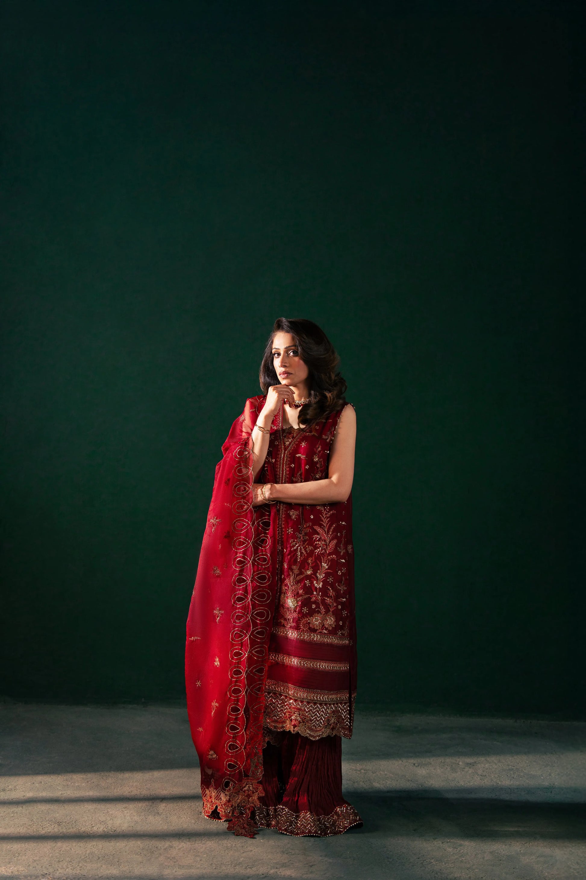 A maroon organza shirt adorned with stunning golden sequin work, paired with a matching organza dupatta and raw silk crushed trousers for a luxurious and elegant ensemble.