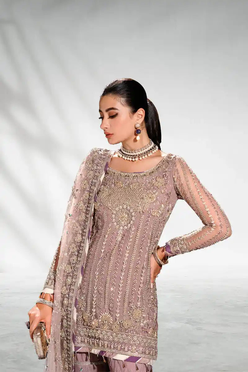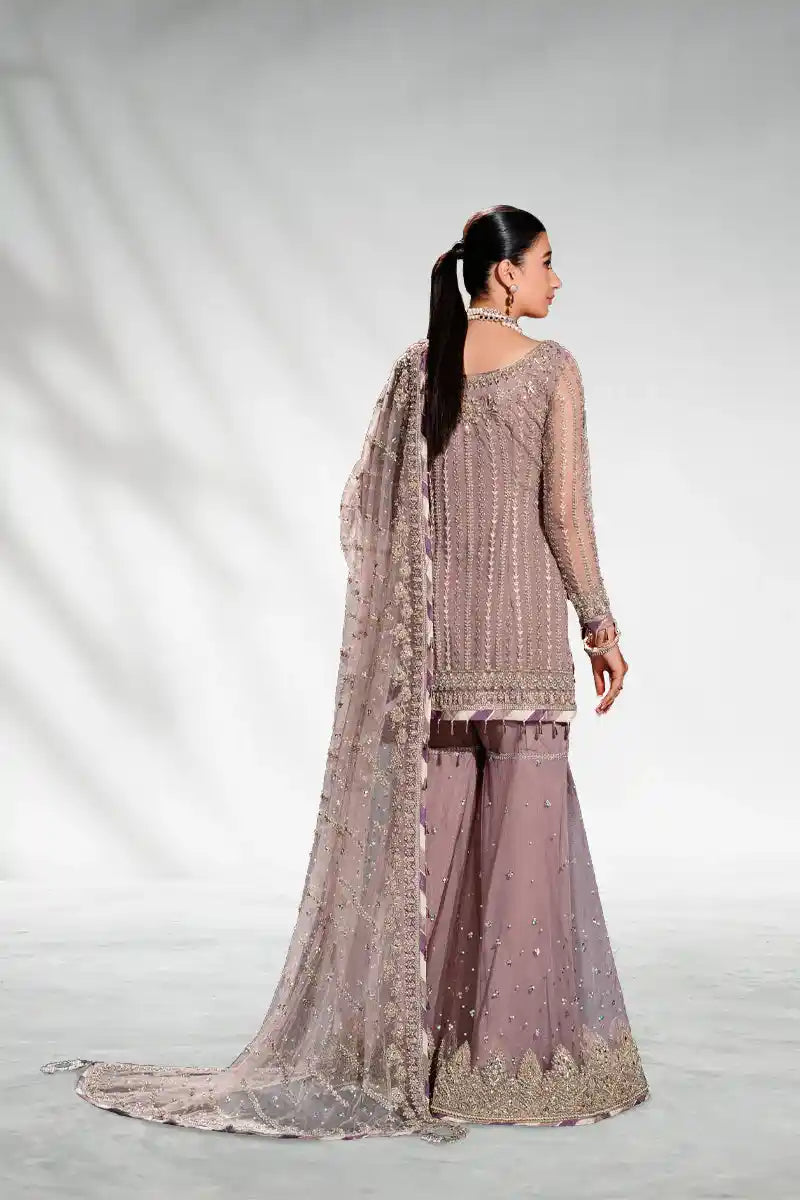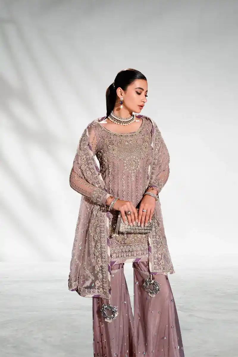 :Standout in this stunning silhouette. Gharara and shirt that are heavily embellished with predominantly gota, dabka, sequins bethki and crystals. The lilac color adds some modern oomph to the outfit. The spectacular back, hand crafted with crystals will make you shine at any occasion. The beautiful motifs and hand embroidery give the bride a regal look. The dupatta in net features a beautiful border hand crafted with exquisite adda work. Densely embellished with beautiful geometrical lines add extra sparkle to this silhouette. The chatapatti border on the dupatta gives it the elegant and traditional feel. The most perfect ensemble to create a stir and have heads turning wherever you choose to wear it.