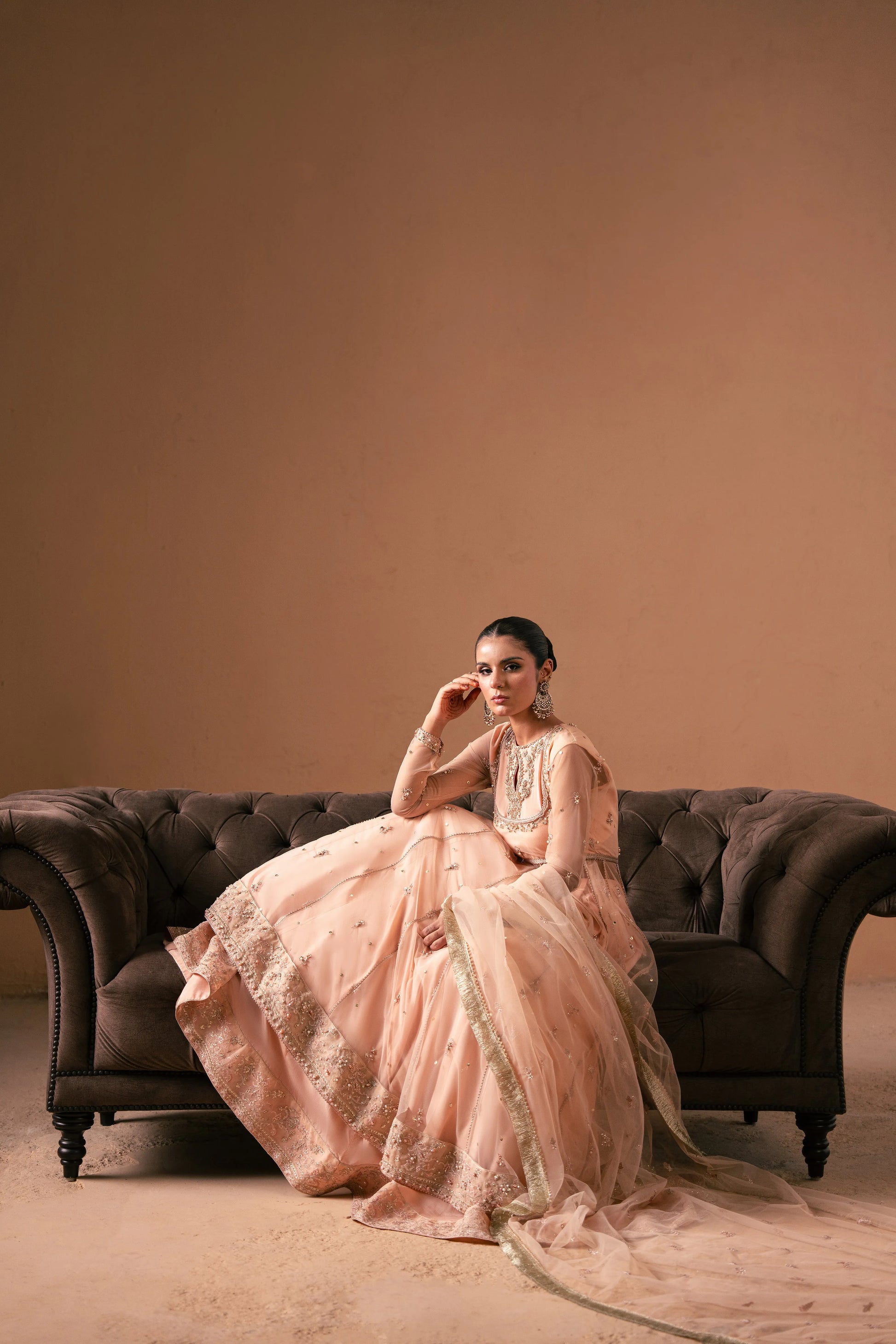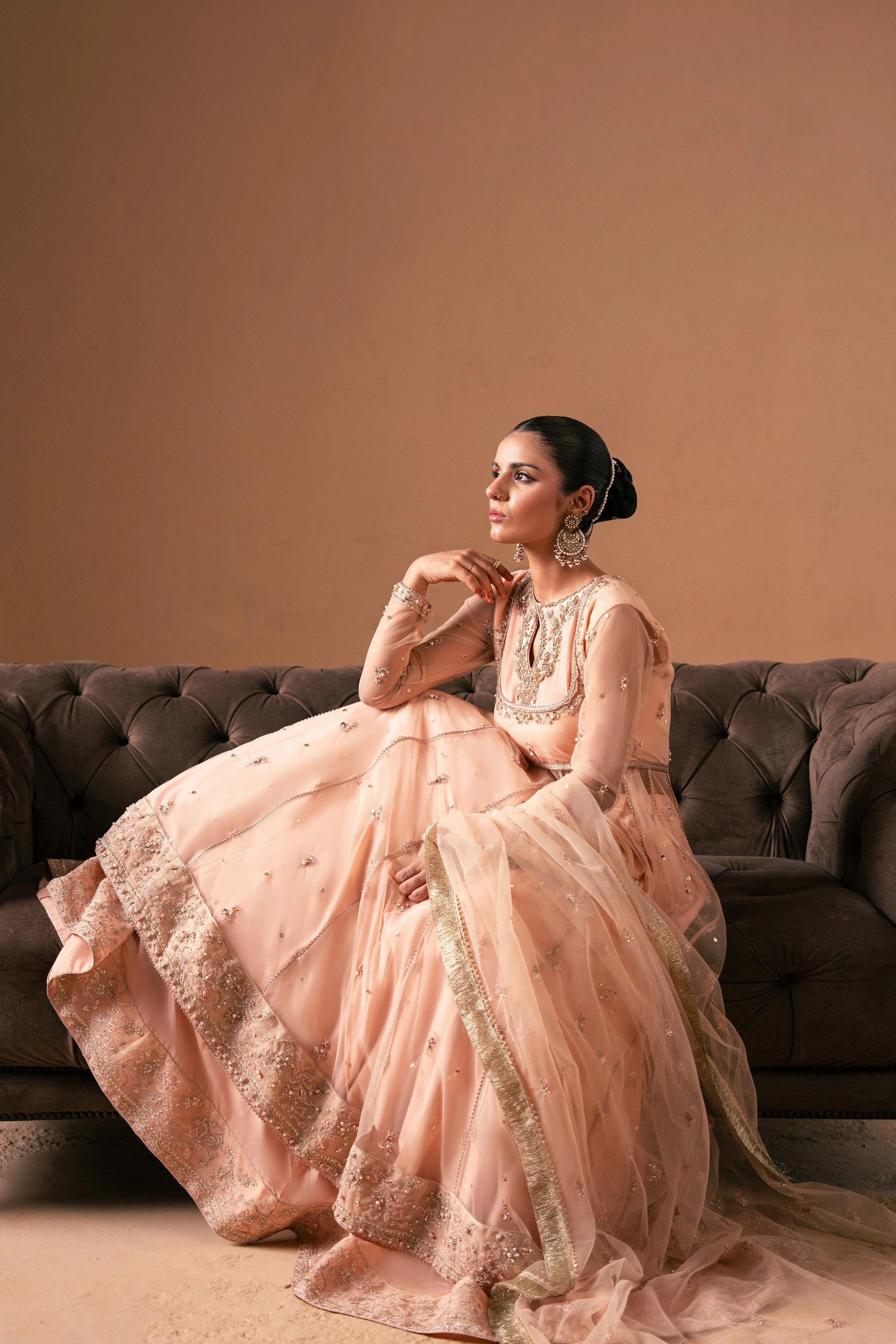 This powder pink pishwas is a true masterpiece, adorned with stunning embellishments and a beautifully detailed border. Paired with a plain raw silk lehenga featuring a coordinating border and a lightly embellished dupatta, this ensemble is perfect for weddings or any formal occasion, offering the perfect balance of grace and glamour.