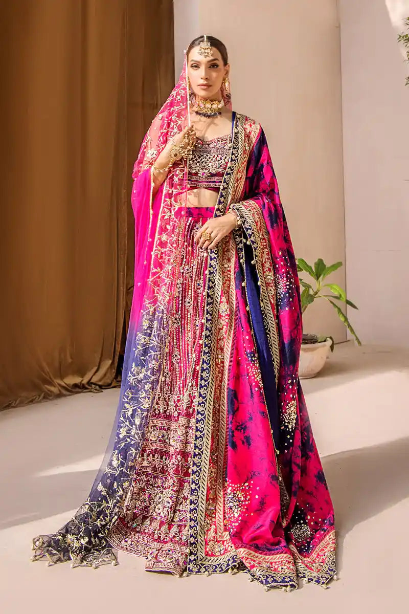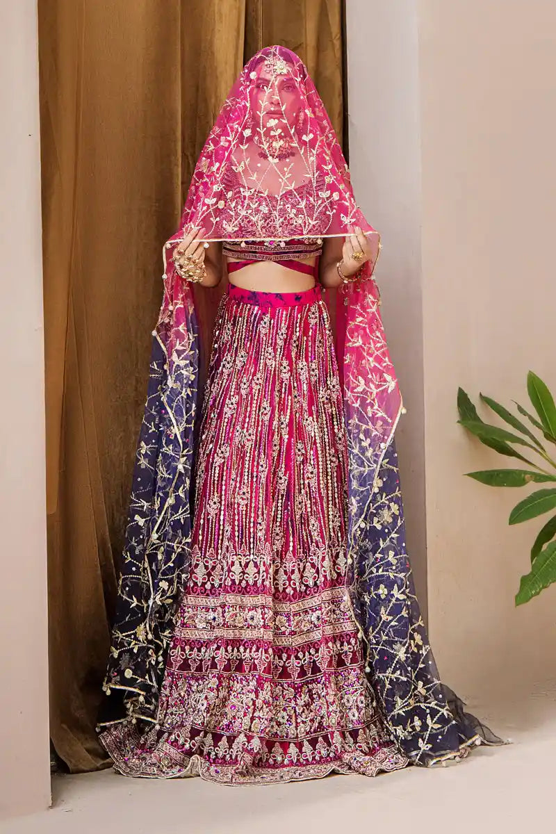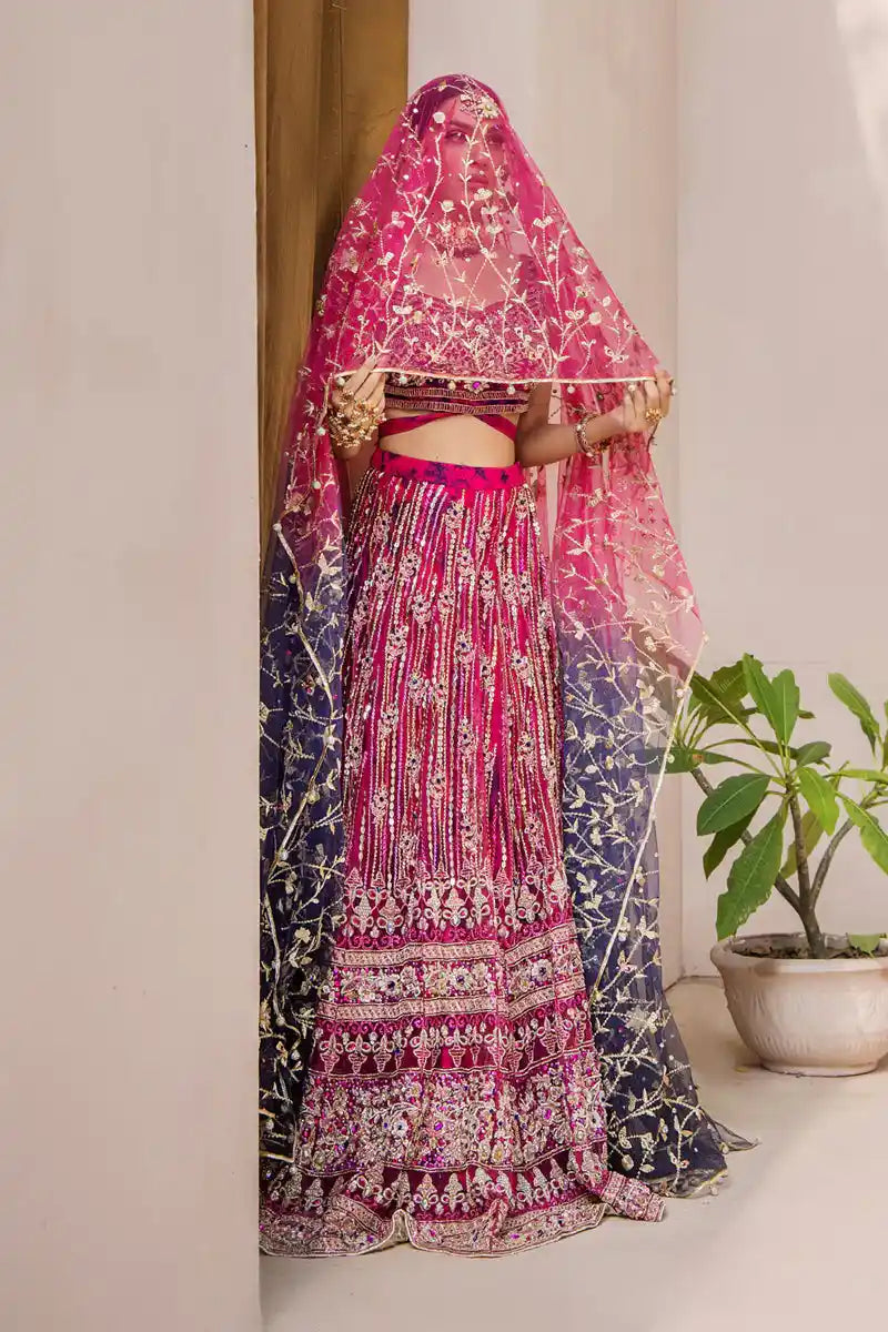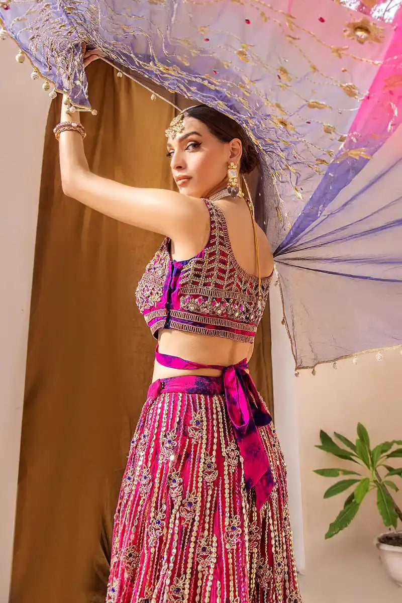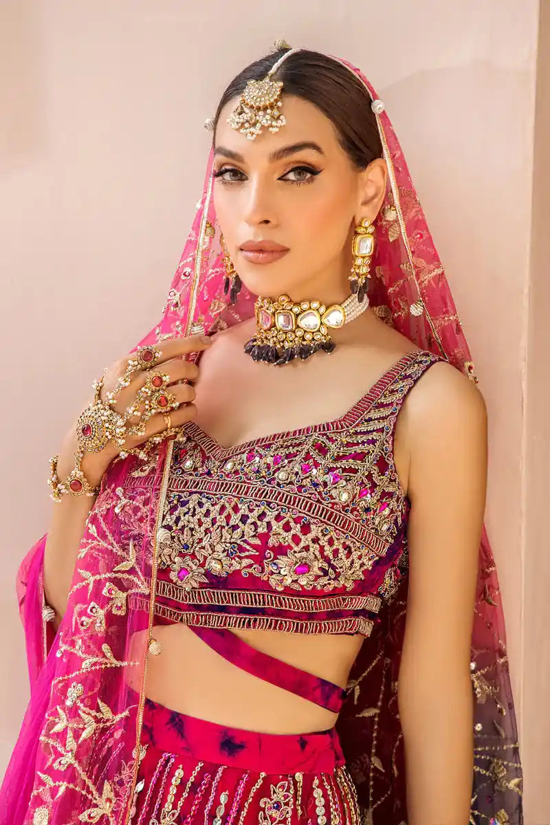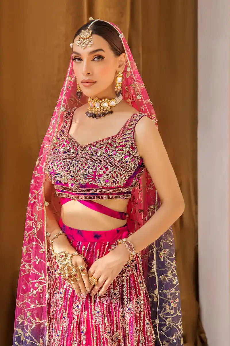 Tabeer is a gateway of timeless allure and romance. The net lehnga and silk choli is a mesmerizing opus of regal splendor. The tie and dye choli drapes you in an intricate masterpiece embellished with sequins, stones, zardozi work, crystals, indian pearl, embroidery and tilla., transforming you into a walking canvas of exquisite artistry. Adorned with the ethereal net dupatta, this ensemble orchestrates a harmonious symphony that pays tribute to the indomitable strength and grace of femininity, embodying the very essence of eternal royalty.