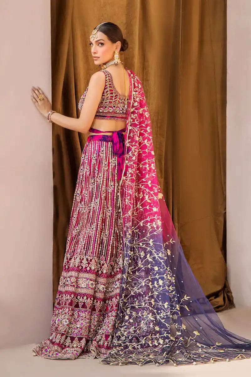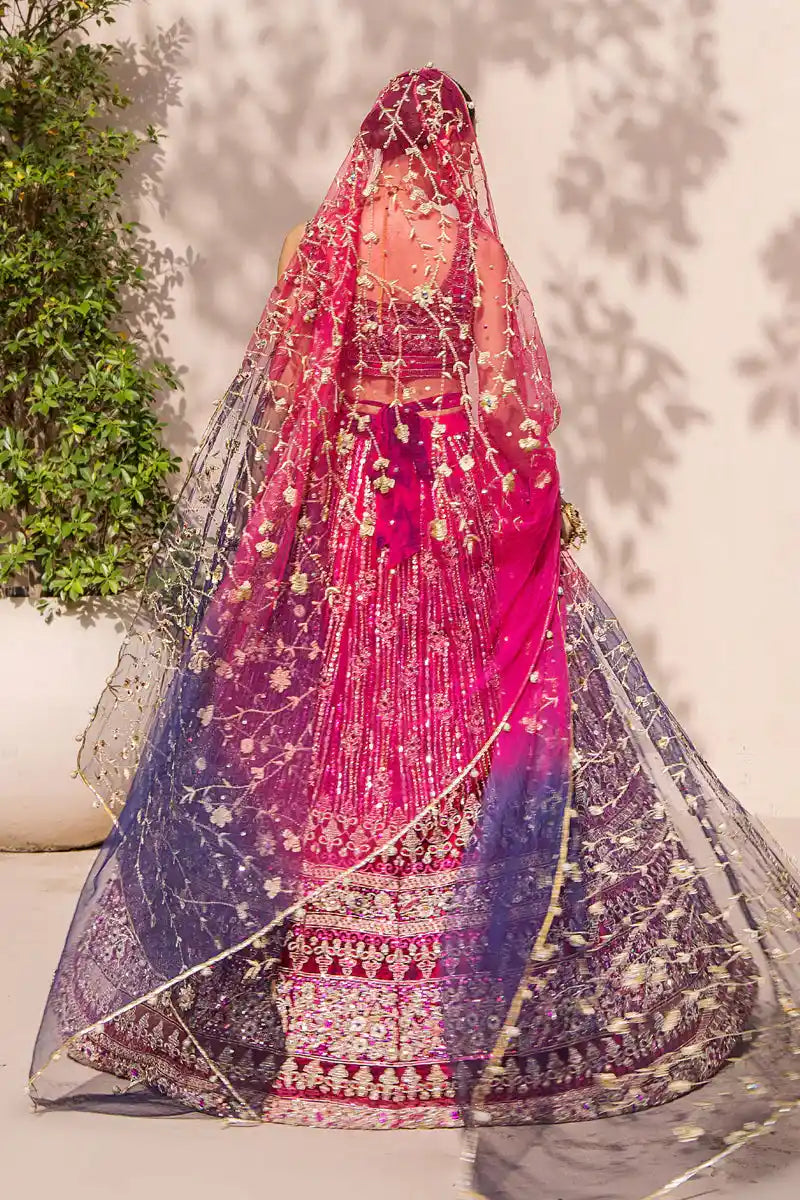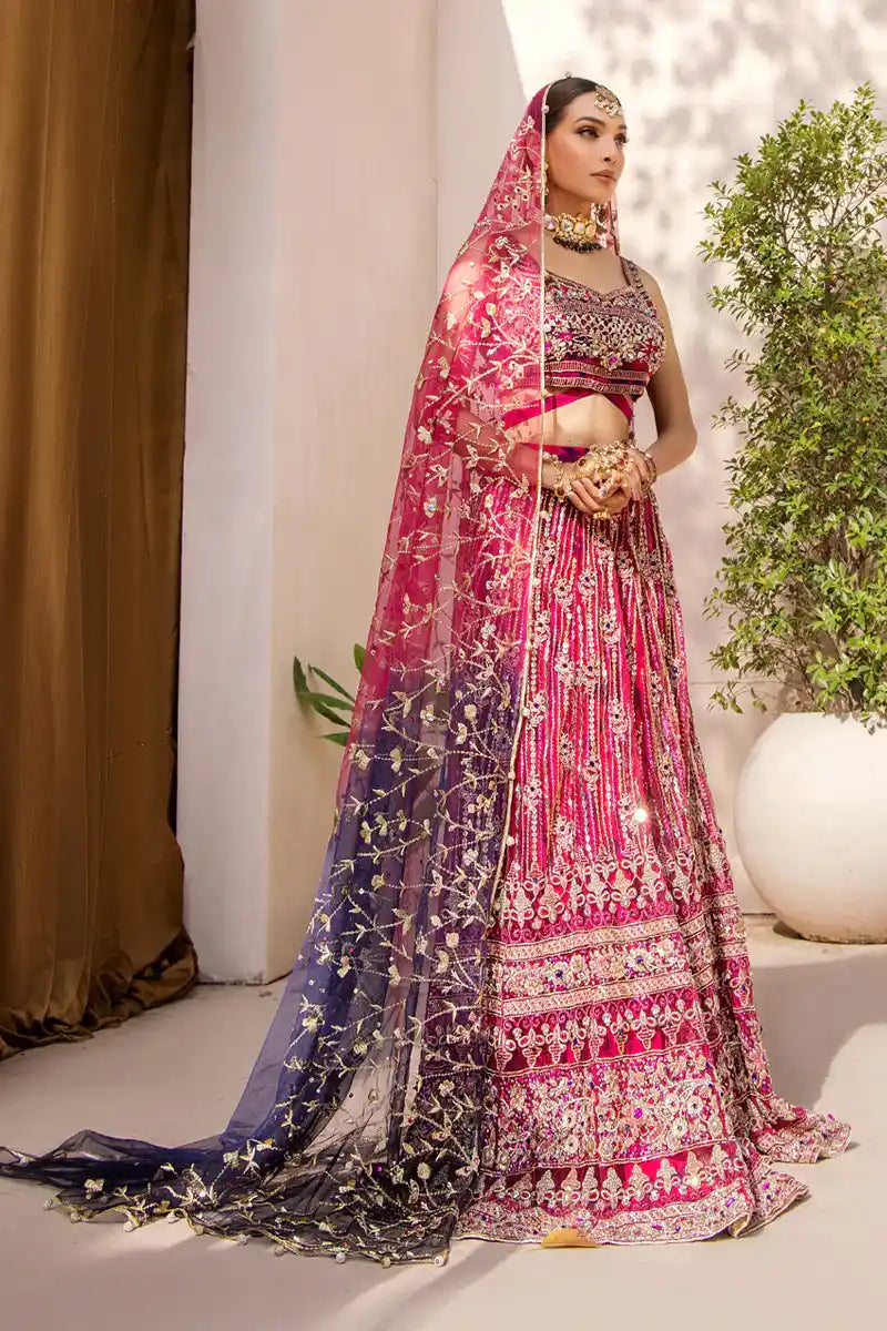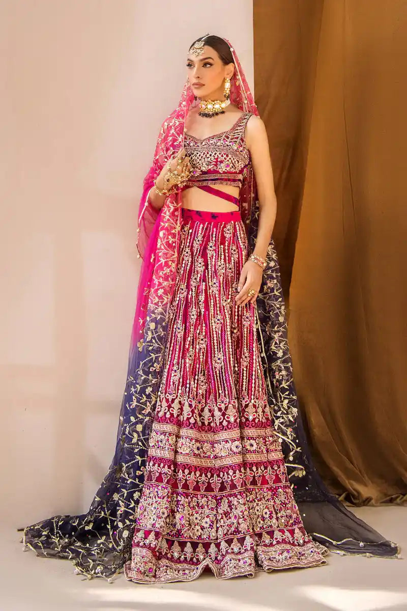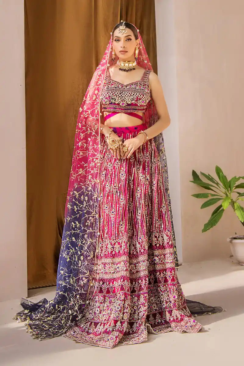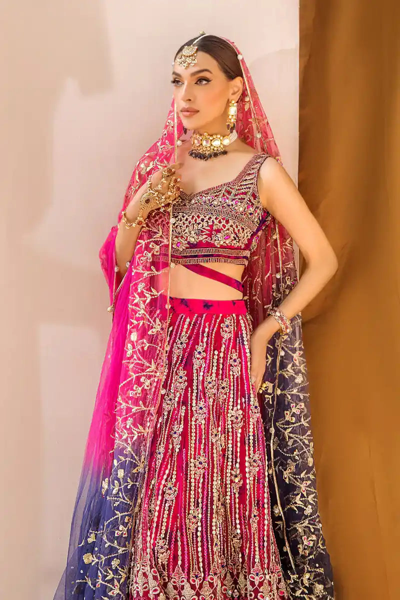 Tabeer is a gateway of timeless allure and romance. The net lehnga and silk choli is a mesmerizing opus of regal splendor. The tie and dye choli drapes you in an intricate masterpiece embellished with sequins, stones, zardozi work, crystals, indian pearl, embroidery and tilla., transforming you into a walking canvas of exquisite artistry. Adorned with the ethereal net dupatta, this ensemble orchestrates a harmonious symphony that pays tribute to the indomitable strength and grace of femininity, embodying the very essence of eternal royalty.