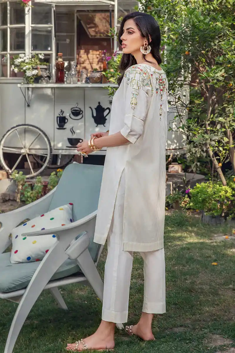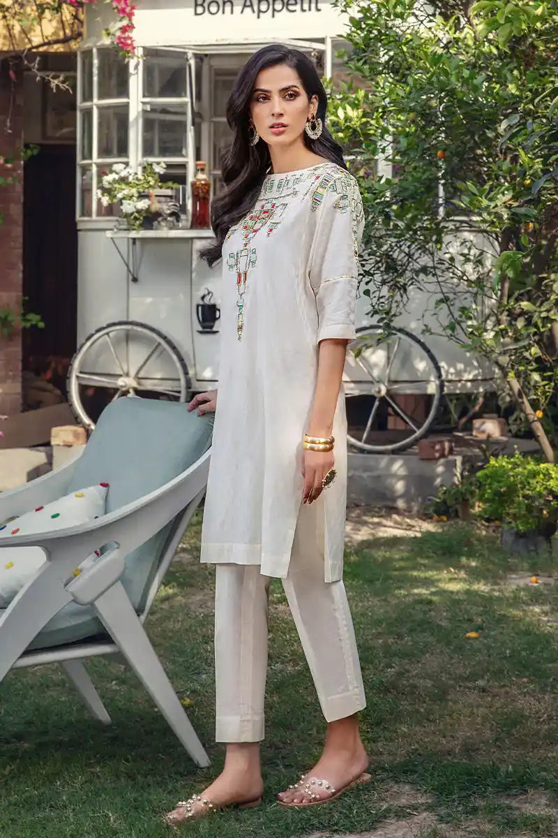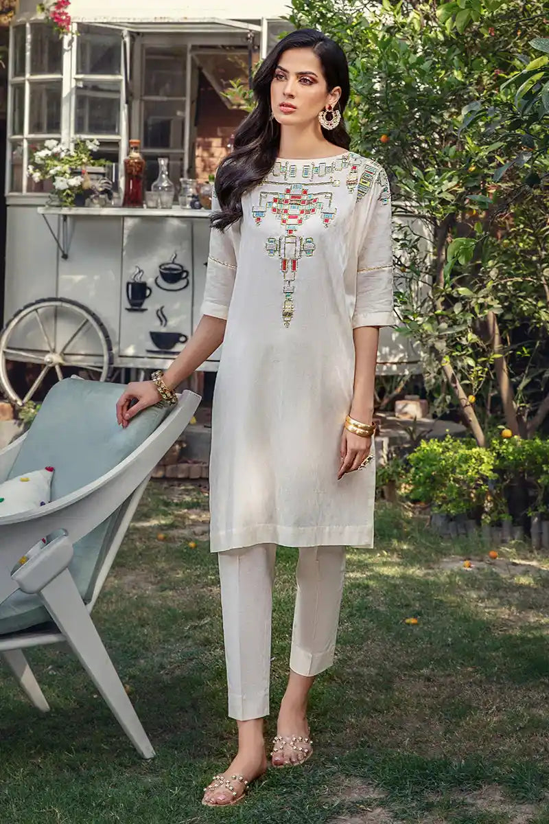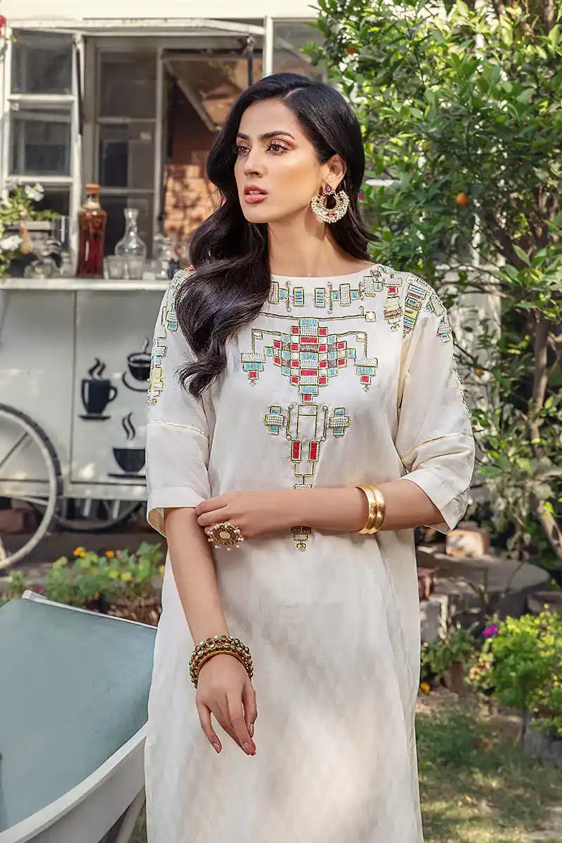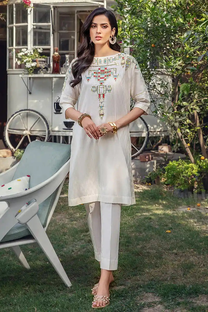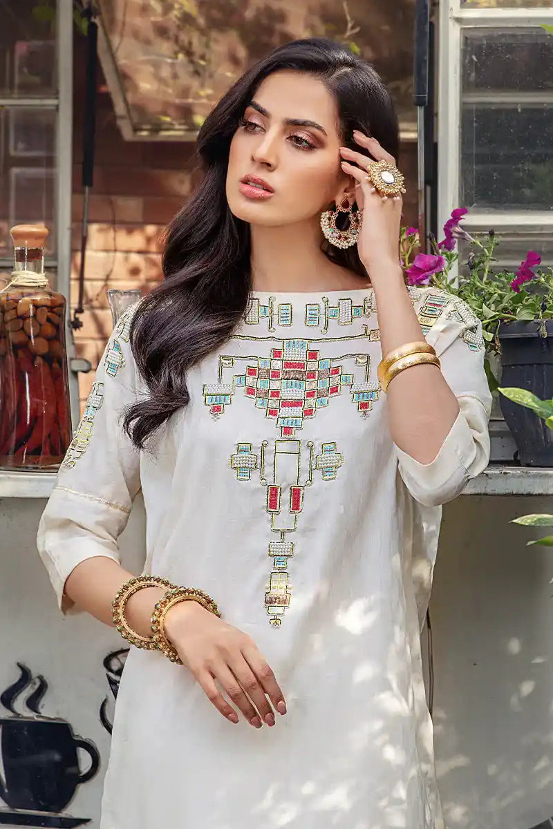 Amp your wardrobe with this beautiful outfit in shades of red, blue and gold embroidery with off white base, adorned with hand embellished pearls, naqshi and gota on front and back upper body. Paired with off white trouser.