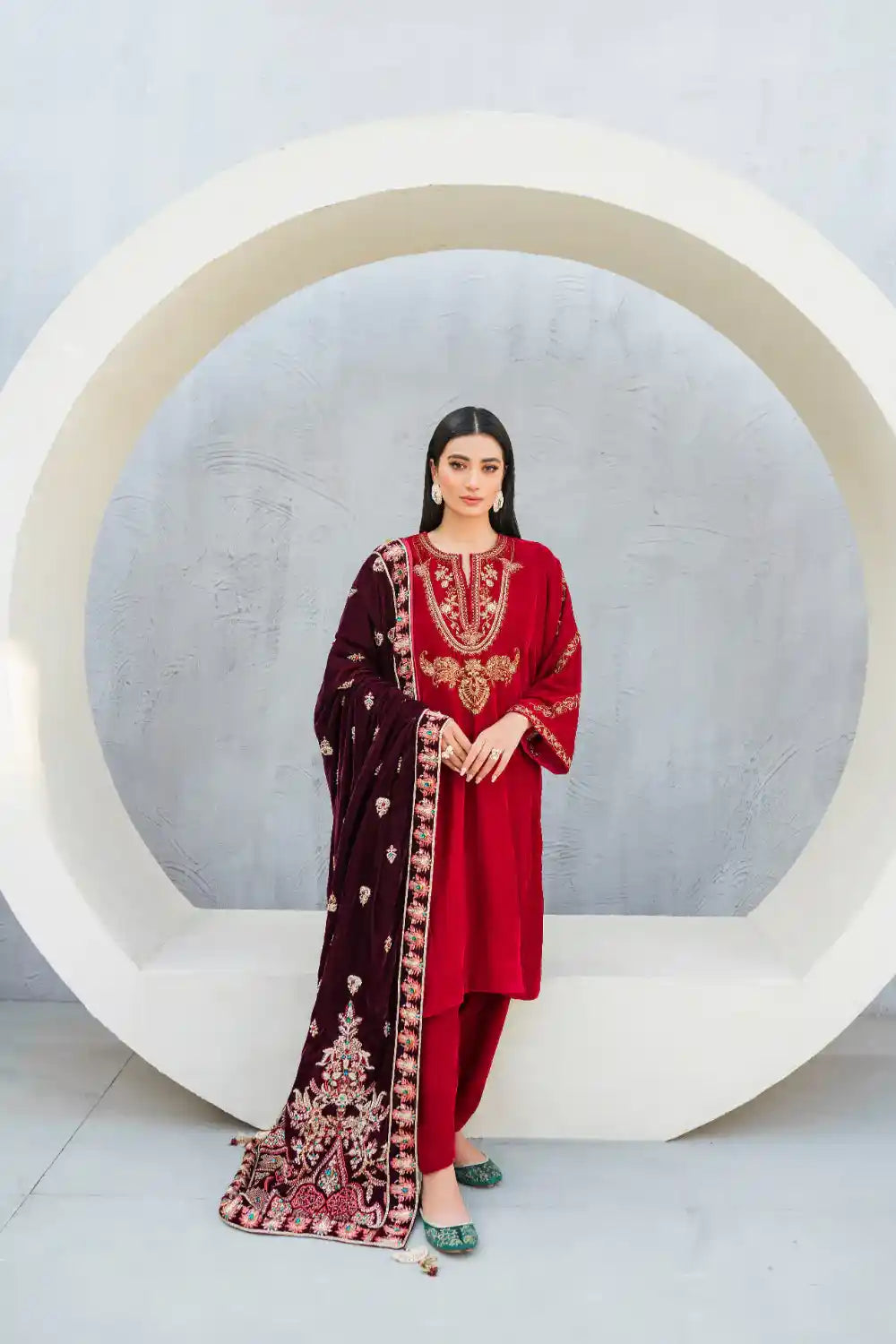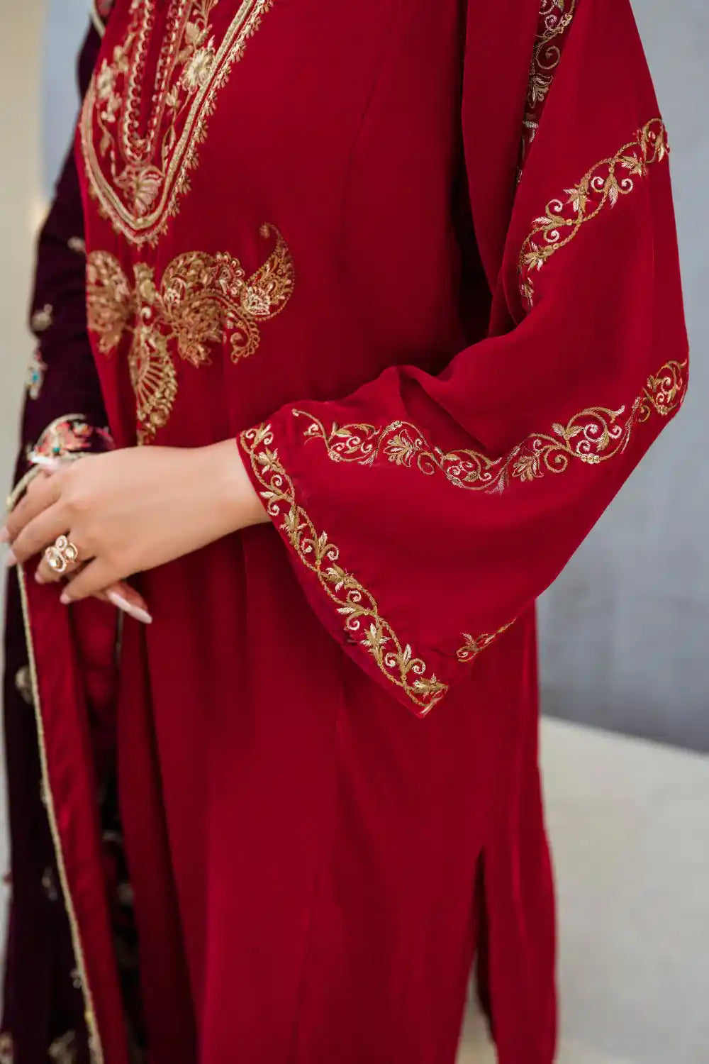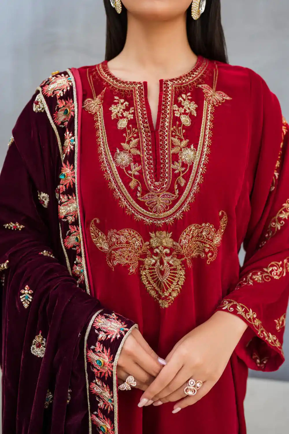 A vibrant red loose cut velvet kurta, paired with shalwar, is delicately embroidered with tilla and sequins on neckline and sleeves. The Jacobean and paisley motives add oomph to this statement. This ensemble brings the perfect look to your eastern winter wardrobe.