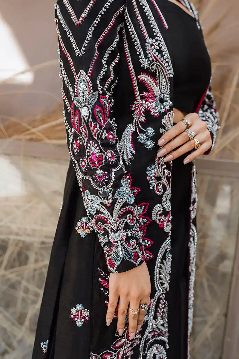 Modernize your wardrobe with this black long jacket set, embellished with cutdana, dabka, pearls, crystals, stones and delicate embroidery. The black long jacket with contrast of shocking pink lining gives it an amazing look. The beautiful paisley and floral motives in pink, white and blue hues enhance the look of the jacket. Complete this classic black look with black raw silk flared trouser and bustier/ inner.
