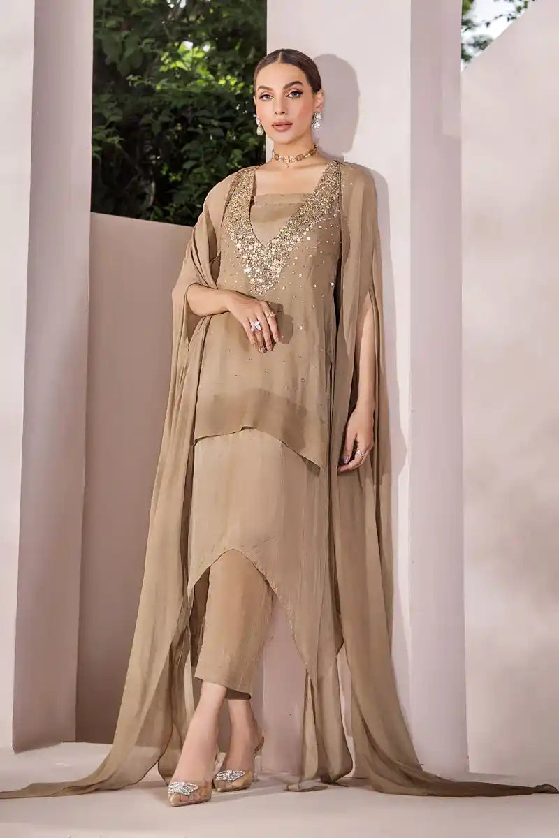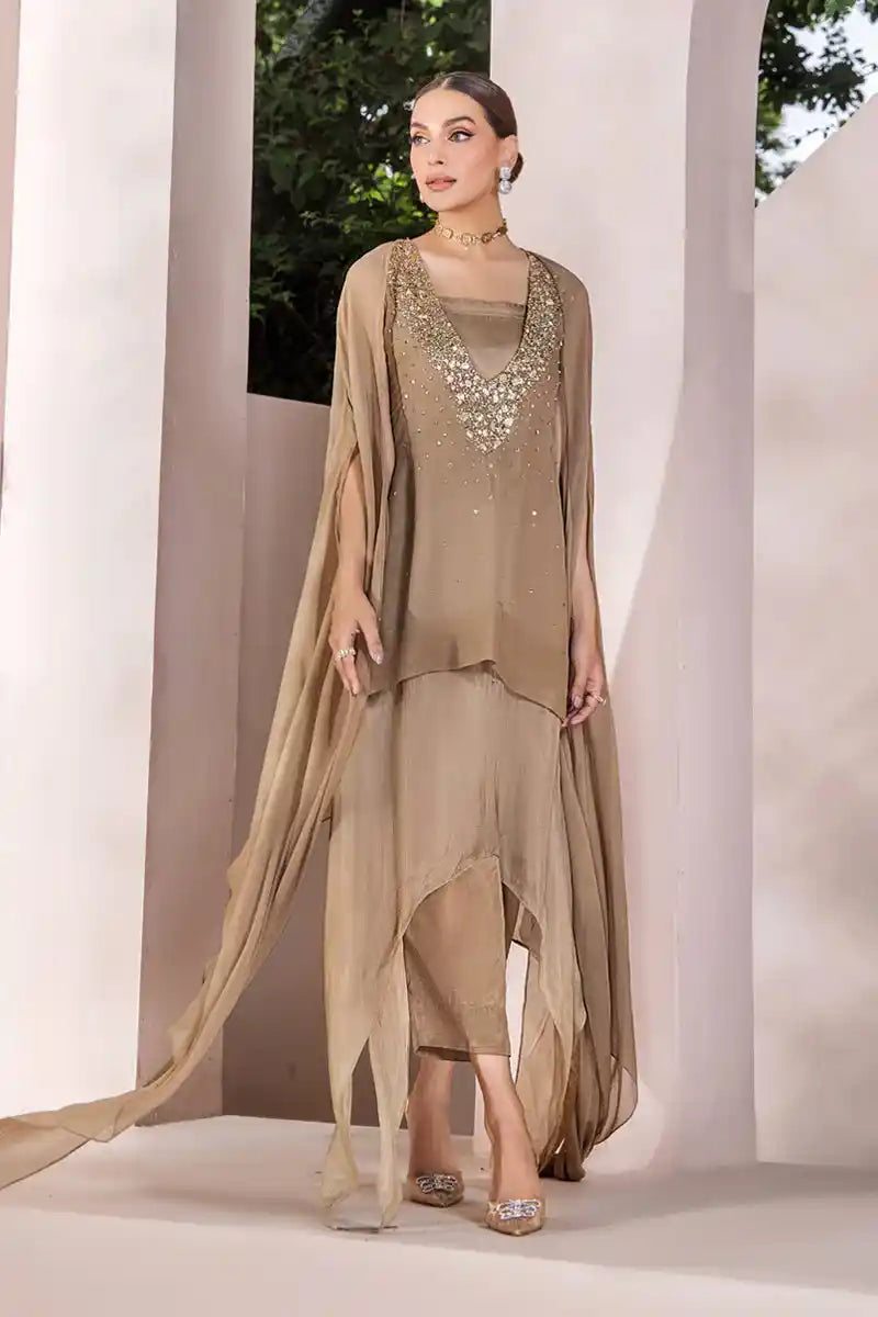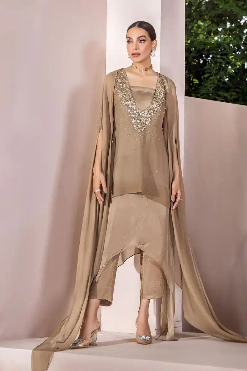 Zaria merges supreme design understanding with the artistry of sequins adornments and gotta work. Radiating opulence in every drape, the sweeping chiffon shirt silhouette and the rich beige hue silk trouser are reminiscent of vintage glamour.
