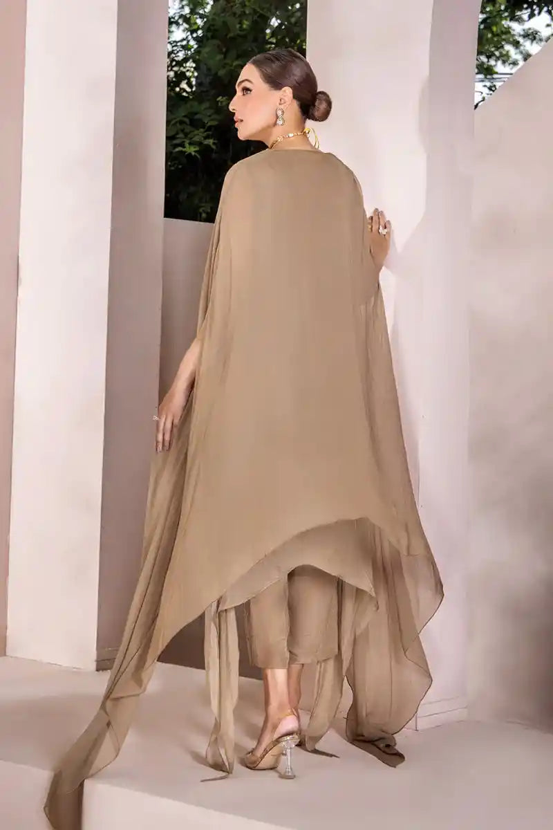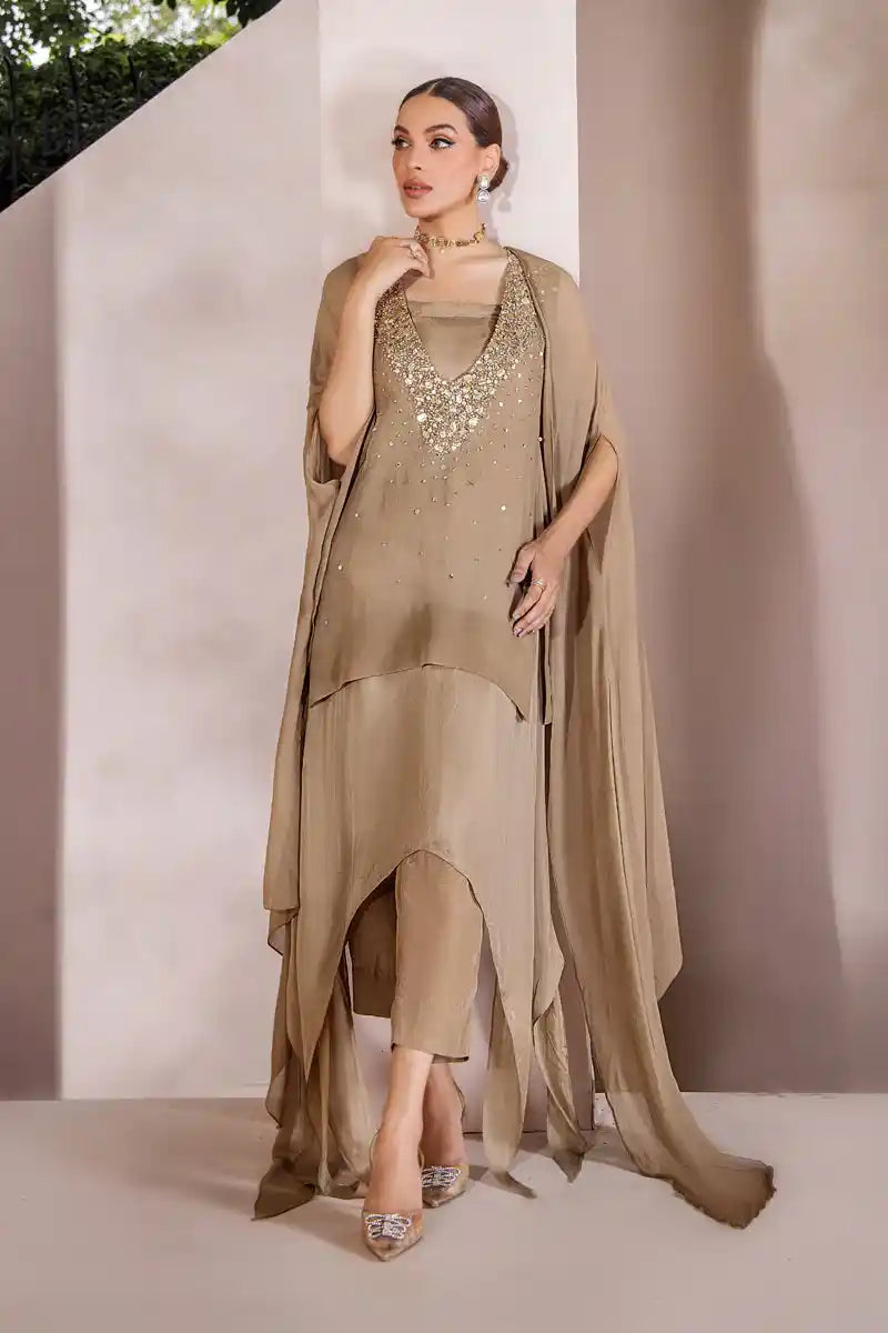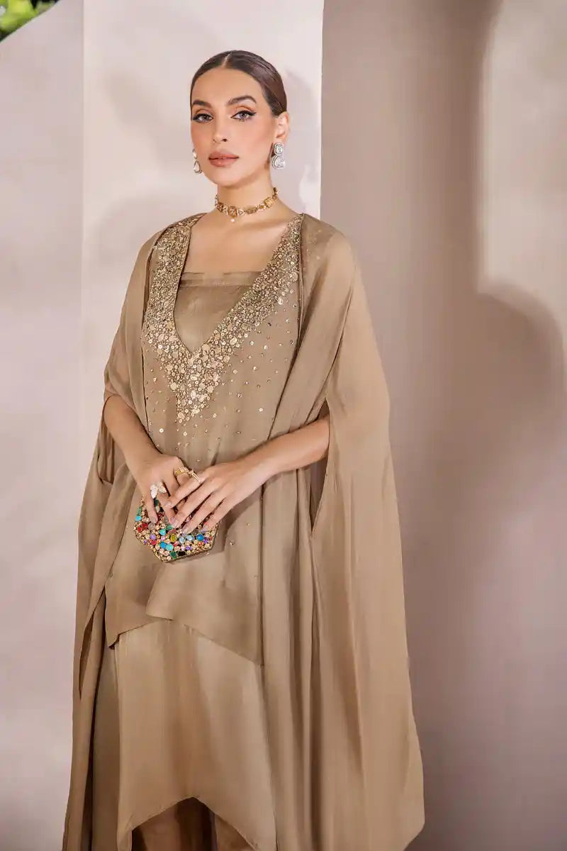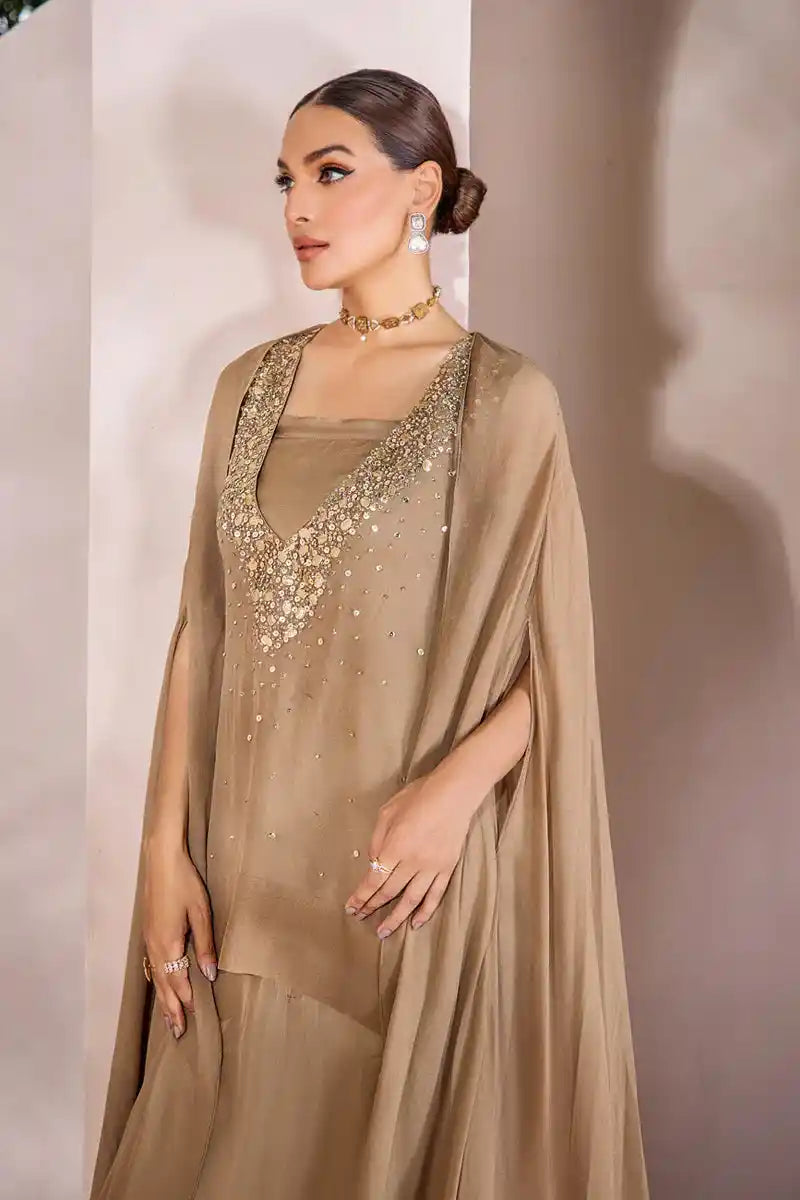 Zaria merges supreme design understanding with the artistry of sequins adornments and gotta work. Radiating opulence in every drape, the sweeping chiffon shirt silhouette and the rich beige hue silk trouser are reminiscent of vintage glamour.