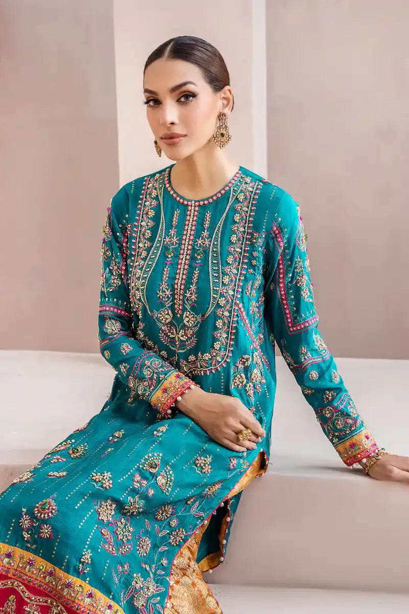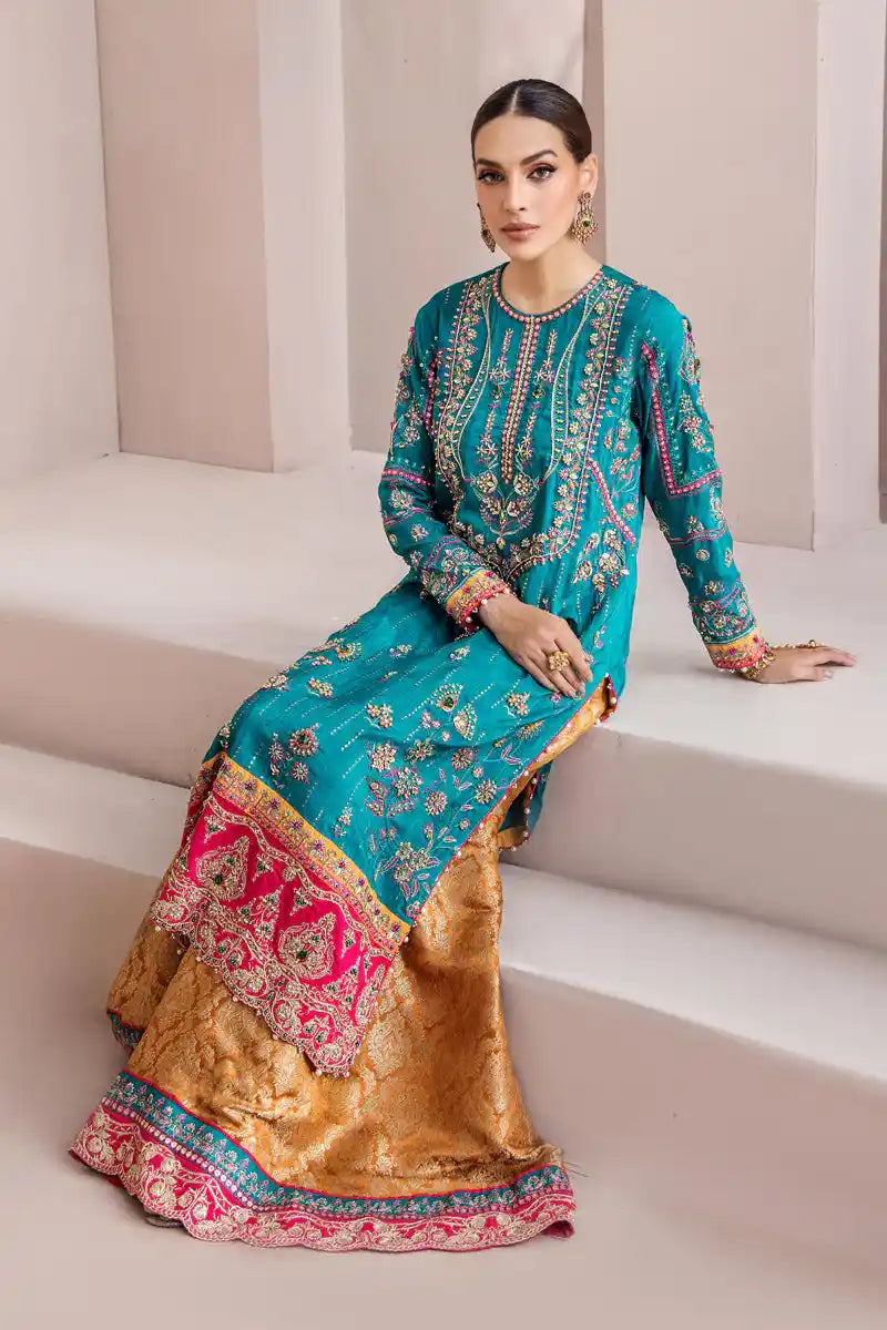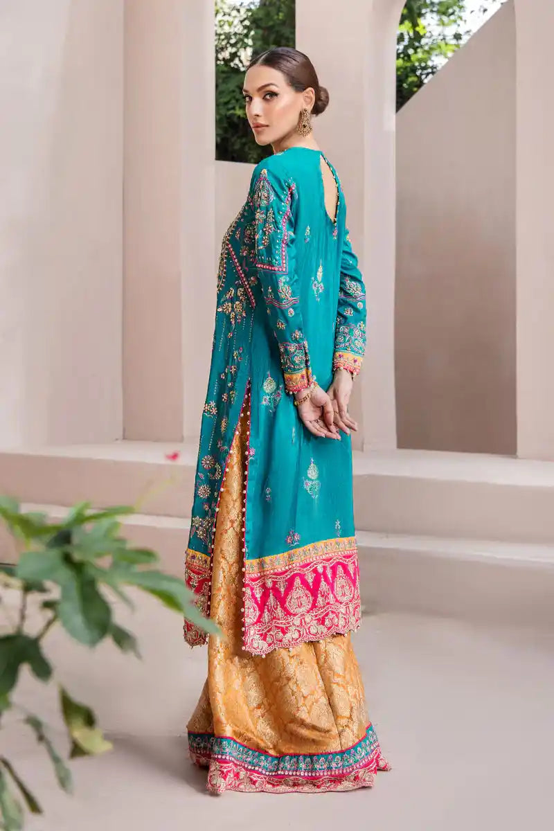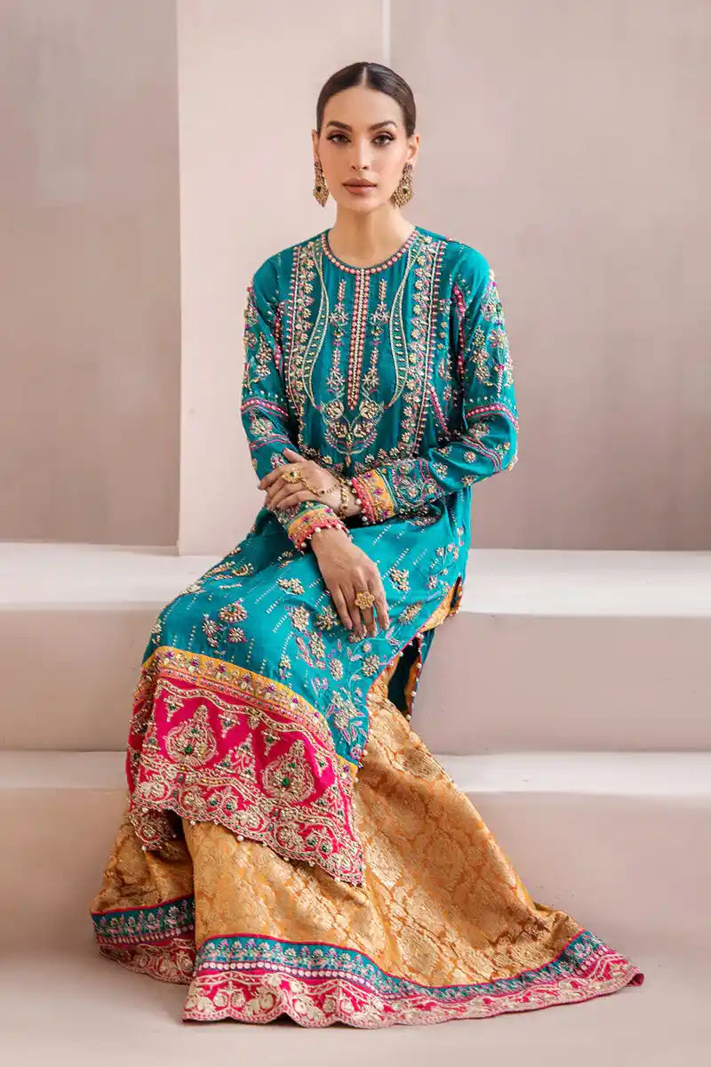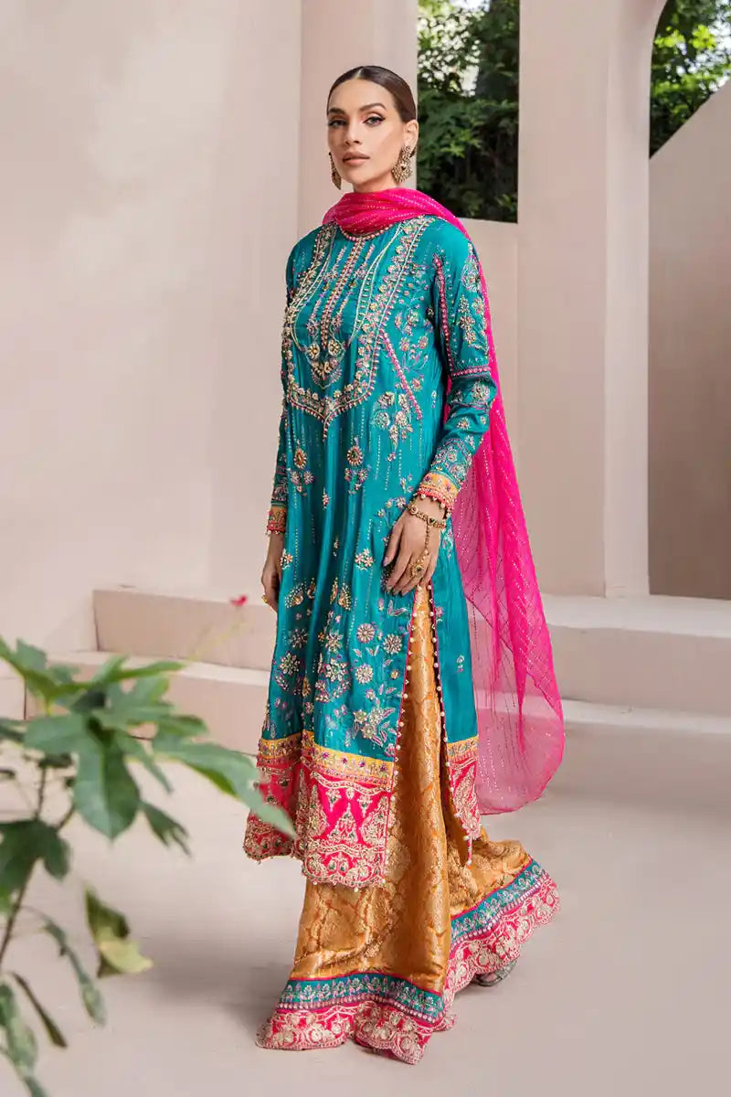 Zeenia channels the brilliance of exclusively sequins, pearls, pipes, zardozi work and embroidery. Captured in the iconic jamawar trouser silhouette synonymous with the brand, the pulsating emerald green hue sparks magic on the silk embellished shirt. The ensemble comes paired with a dainty pink embellished organza dupatta for a truly opulent look.