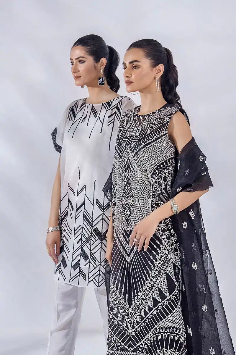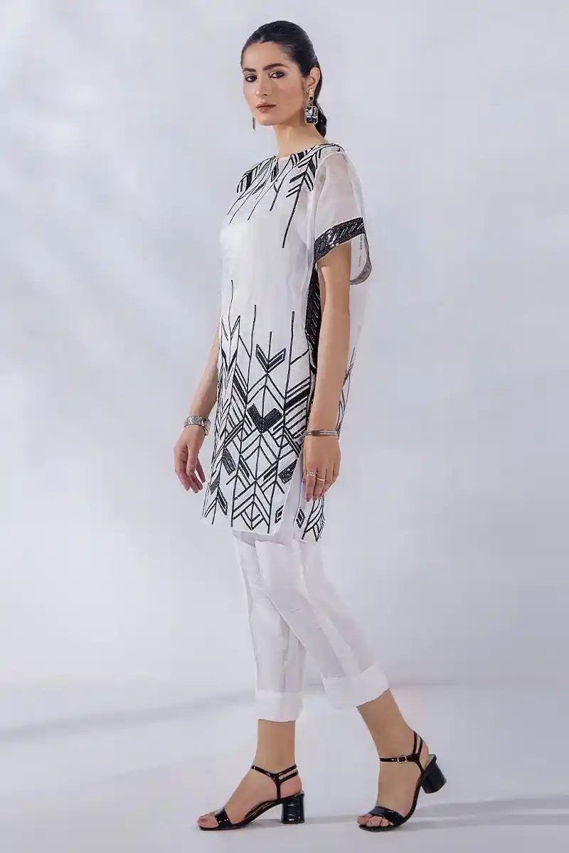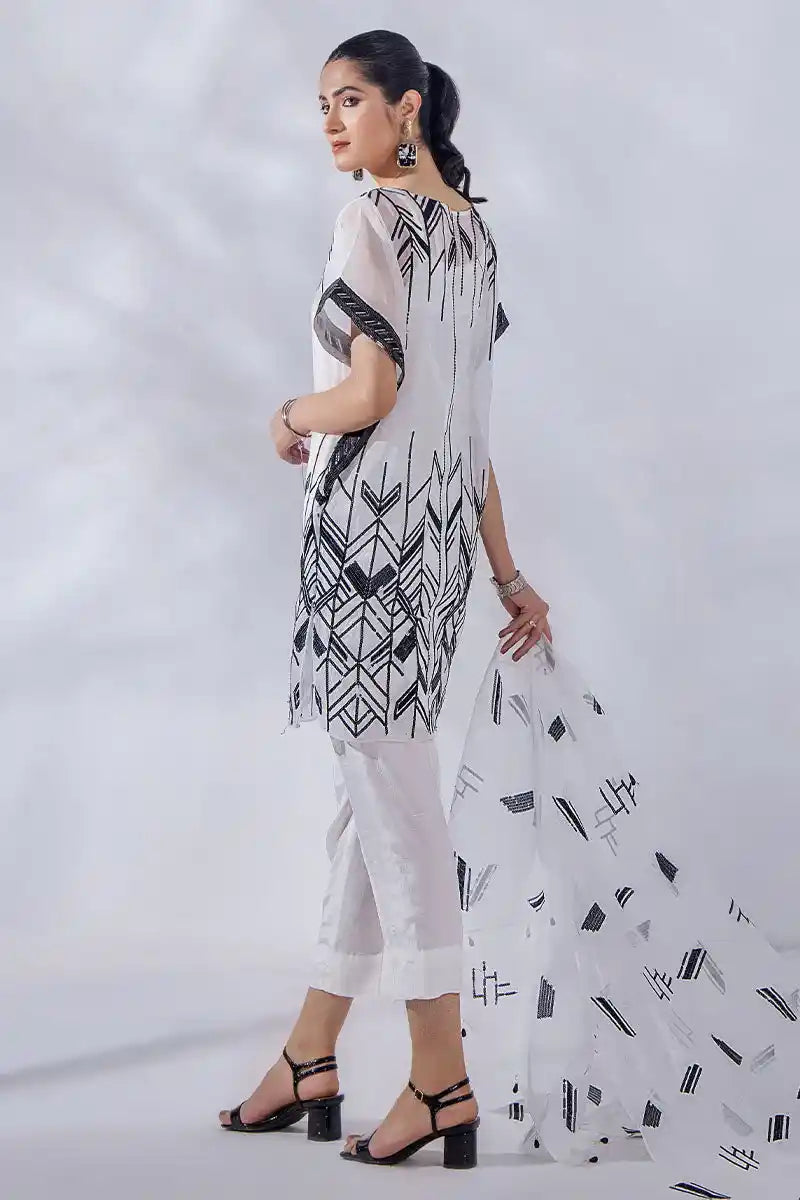 Dress up in the vivid hues of white and black. Zoya is accented with beautiful cut and embroidery. This amazing modern cut is artfully crafted with sequins and embroidery. The entire ensemble exudes an amalgamation of modern and classy looks.