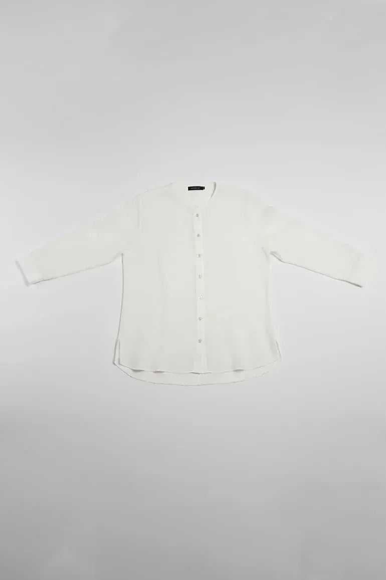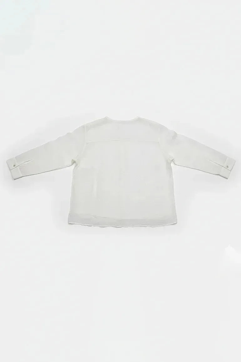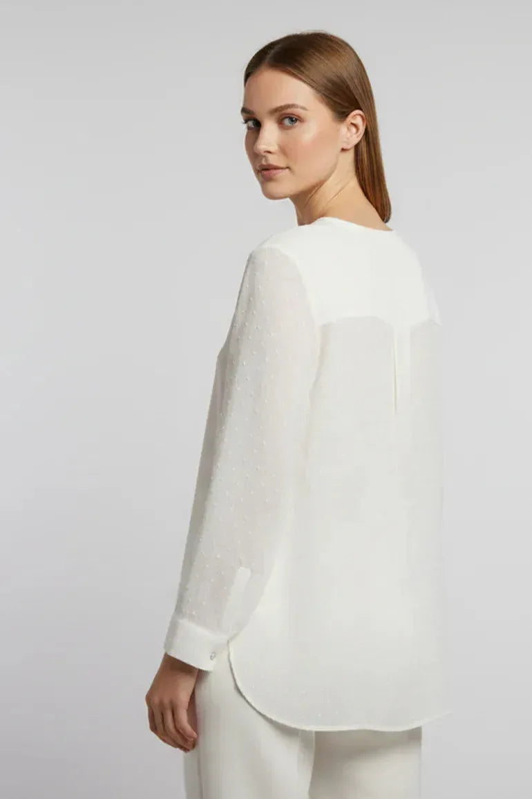 Elevate your everyday look with this elegant white textured shirt, designed with a relaxed silhouette and refined detailing. The soft fabric features a subtle dotted texture that adds depth while keeping it lightweight and breathable. A full button-down front with delicate buttons enhances its classic charm, while the long sleeves and curved hem ensure effortless sophistication. Perfect for pairing with tailored trousers or jeans, this shirt transitions seamlessly from workwear to weekend chic.