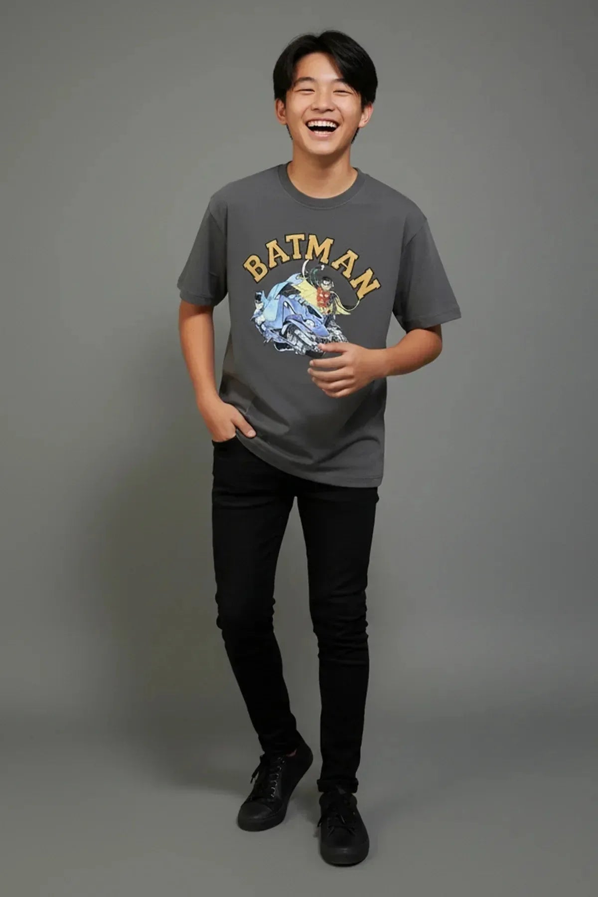 Show off your fandom with this charcoal grey Batman & Robin t-shirt, featuring vintage-inspired “BATMAN'' typography and a bold superhero illustration. Crafted from soft, breathable cotton-blend fabric, it delivers all-day comfort with effortless street-style energy.