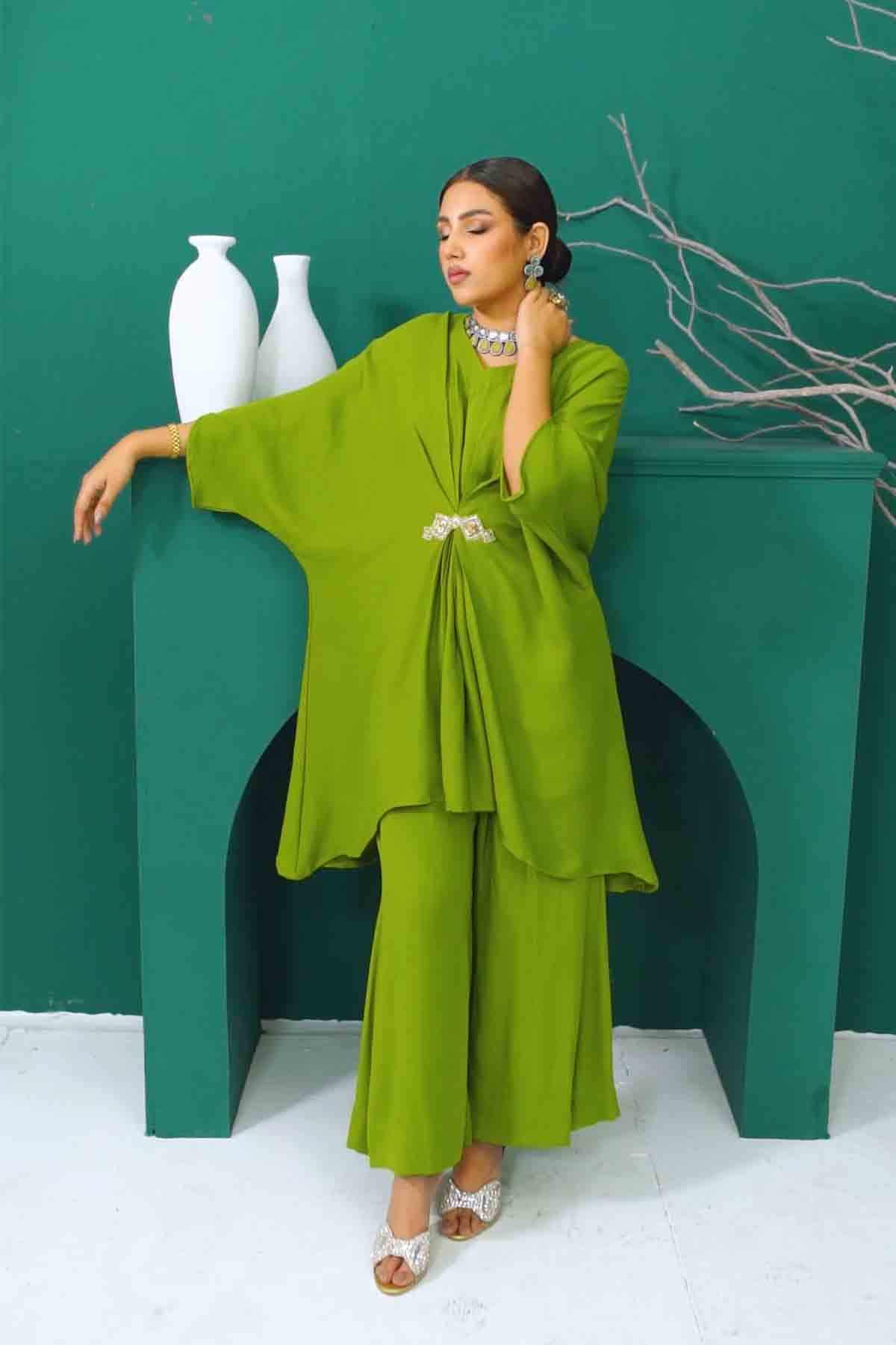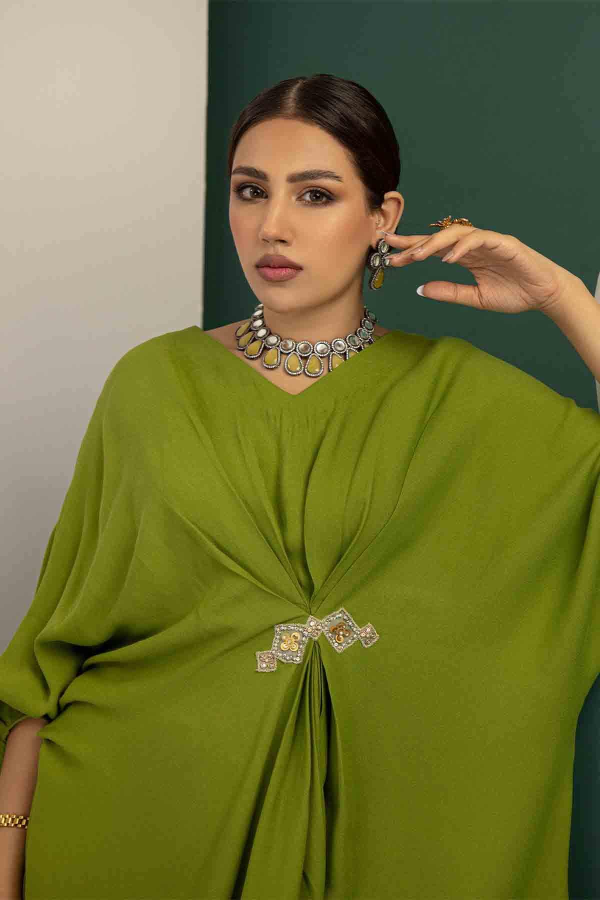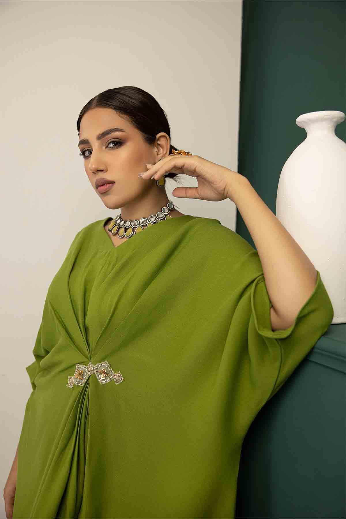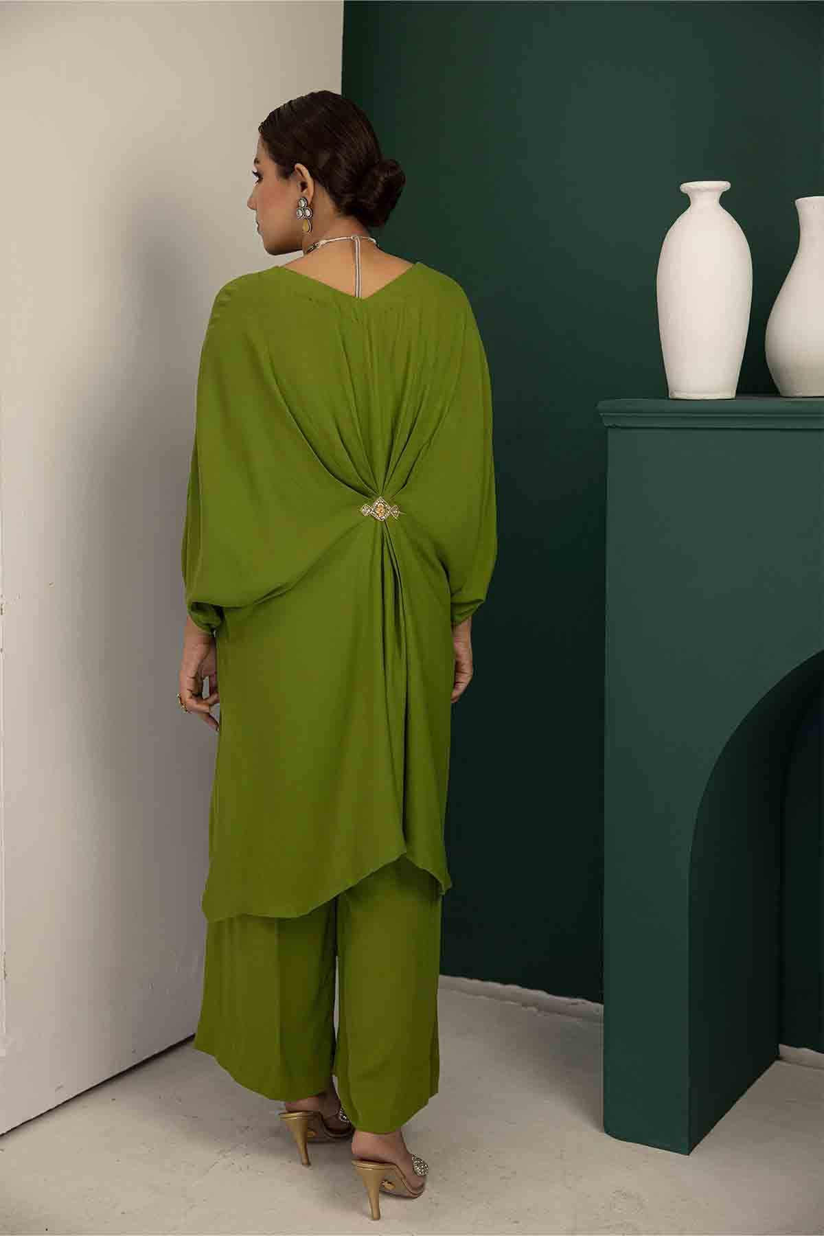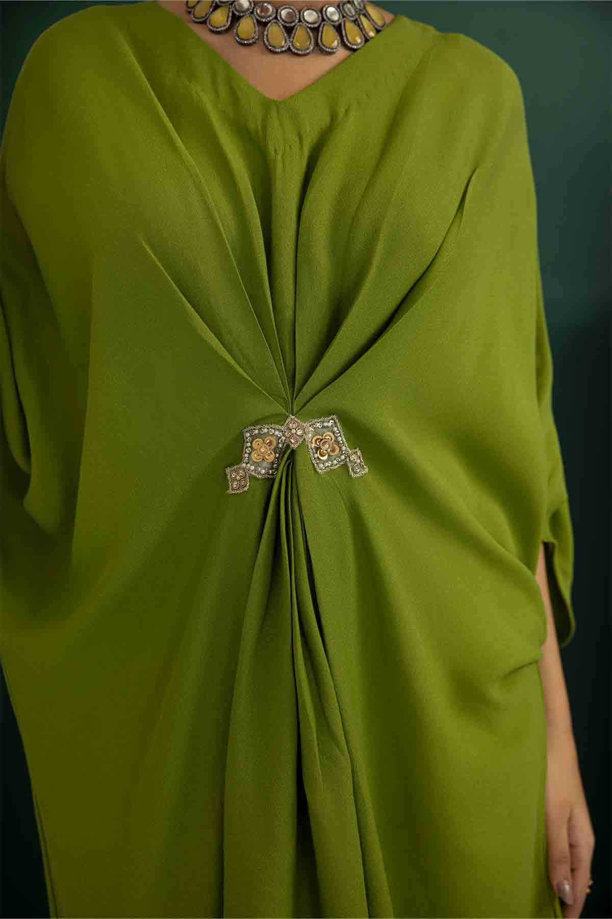 The Ensemble Features An Olive Green Knee-Length Kaftan Tunic Embellished With Hand Embroidered Motif. Paired Up With Olive Green Culottes To Create A Sophisticated And Classic Look.