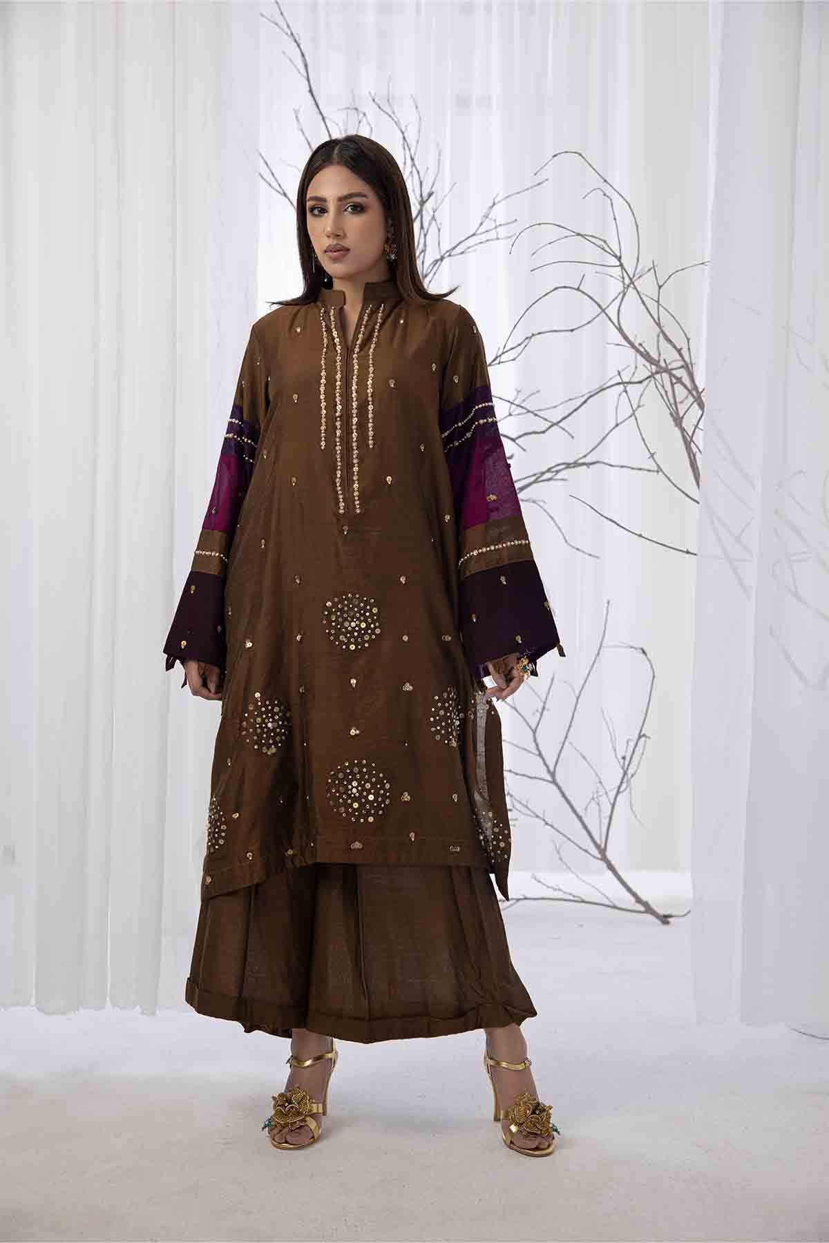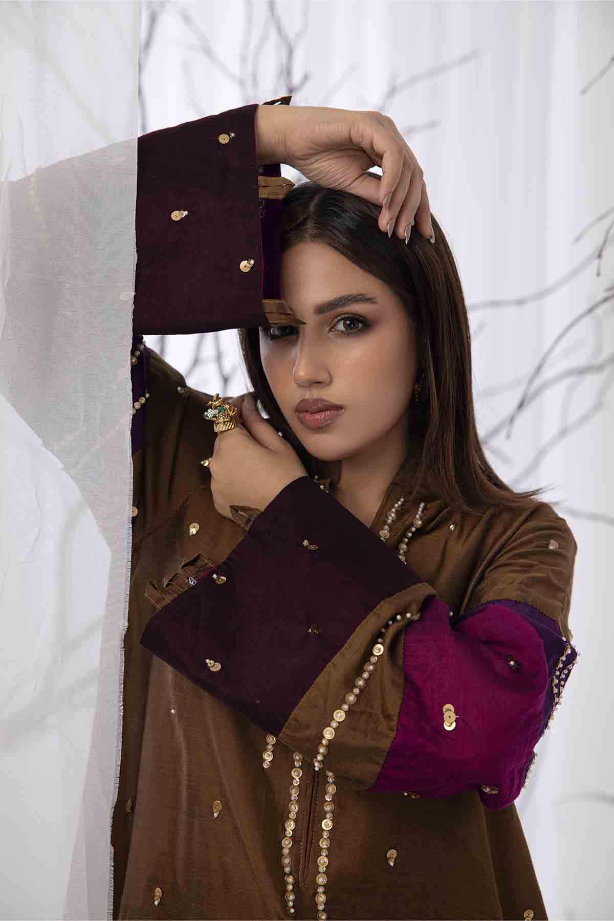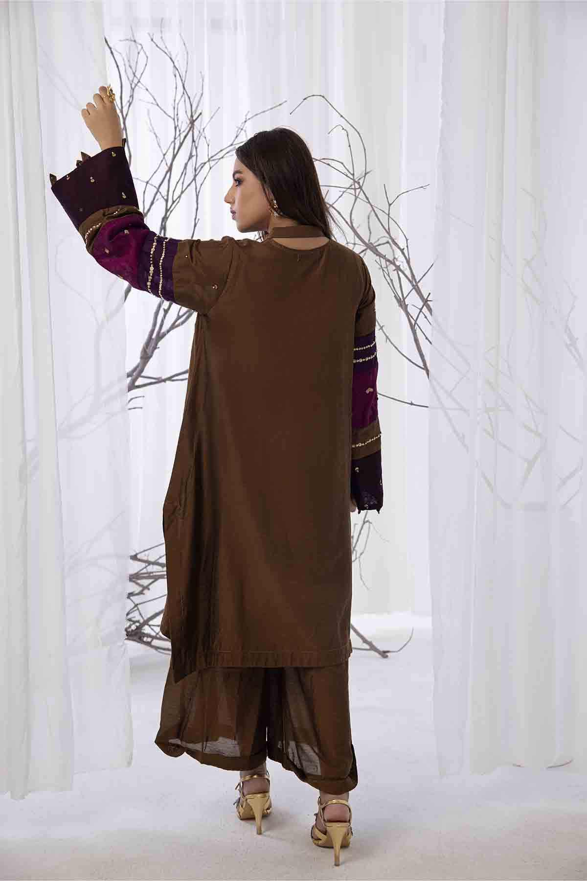 Jahaan 23: Color-Blocked Katan Silk Copper Gold Shirt With Shades Of Plum. A Line Shirt Adorned With Pearls & Sequins Hand Embroidery All Over. Paired Up With Katan Silk Copper Gold Straight Culottes. A Perfect Chic Look For This Festive Season.