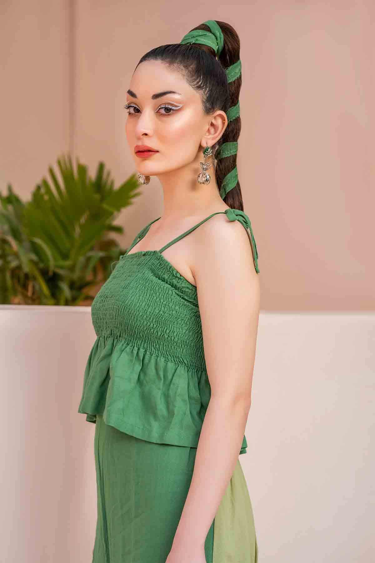 Solids: Green Cord Set With A Long Jacket And Inverted Pleat At The Back. Its Statement High-Waisted Color-Blocked Pants Make It A Must-Have Summer Essential For Your Wardrobe.