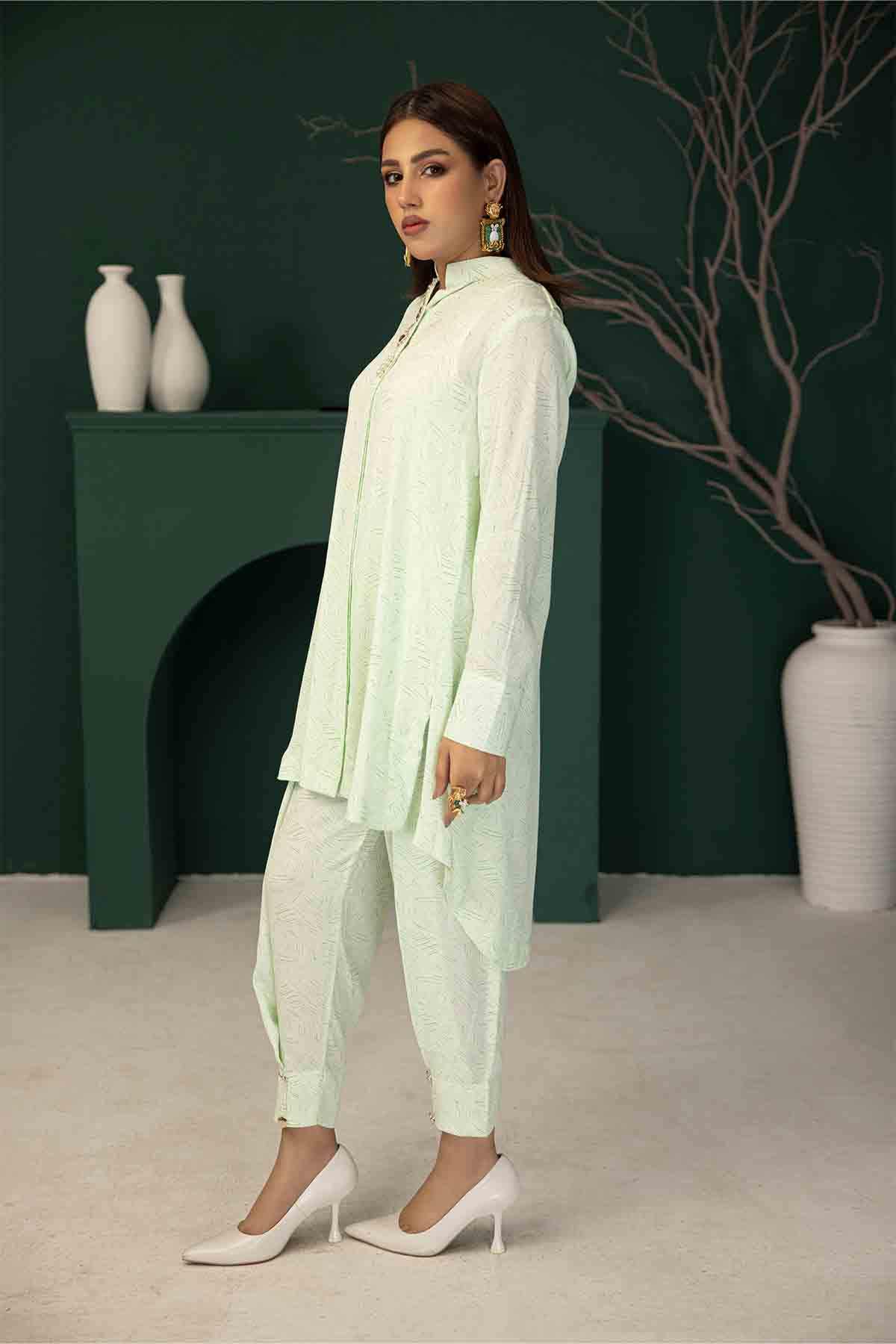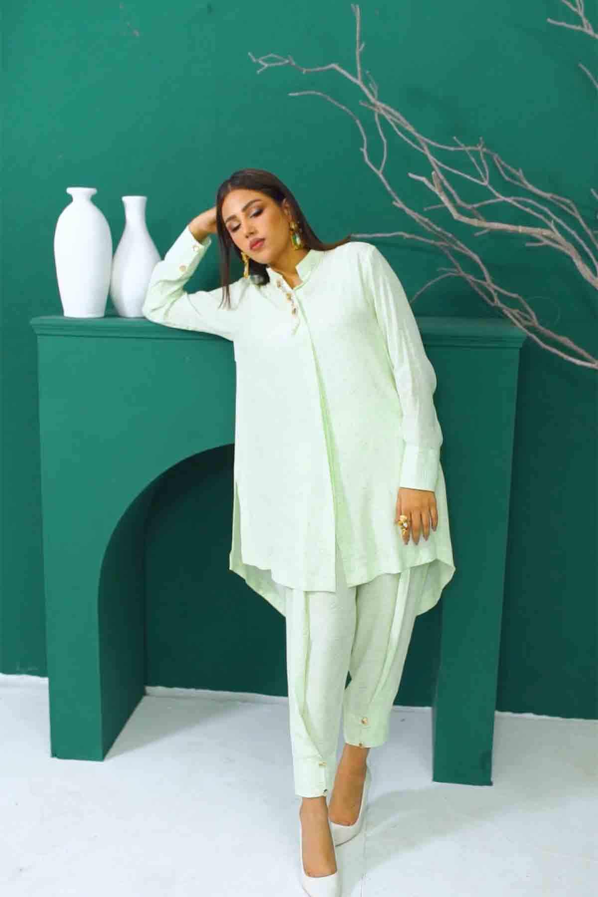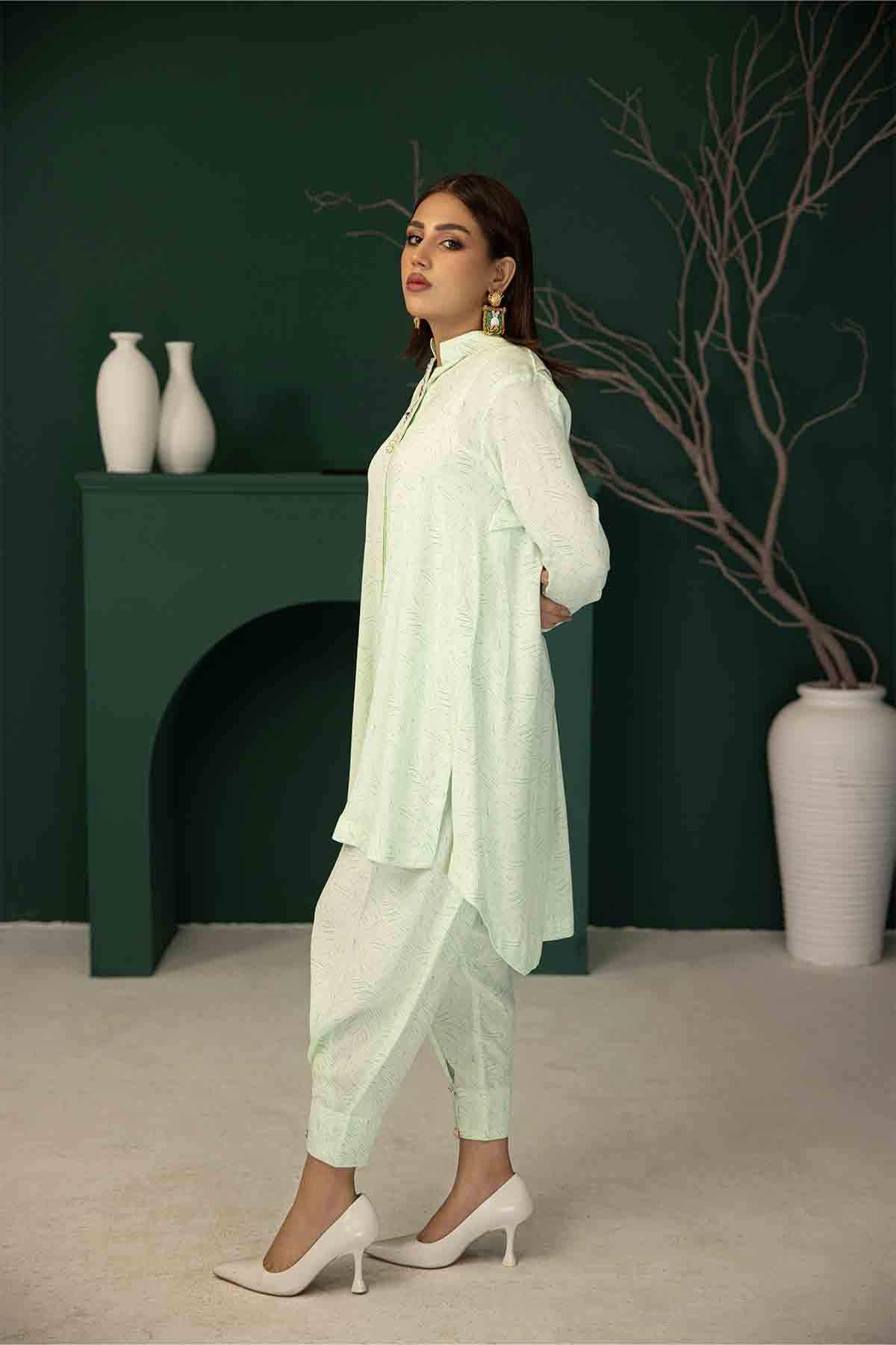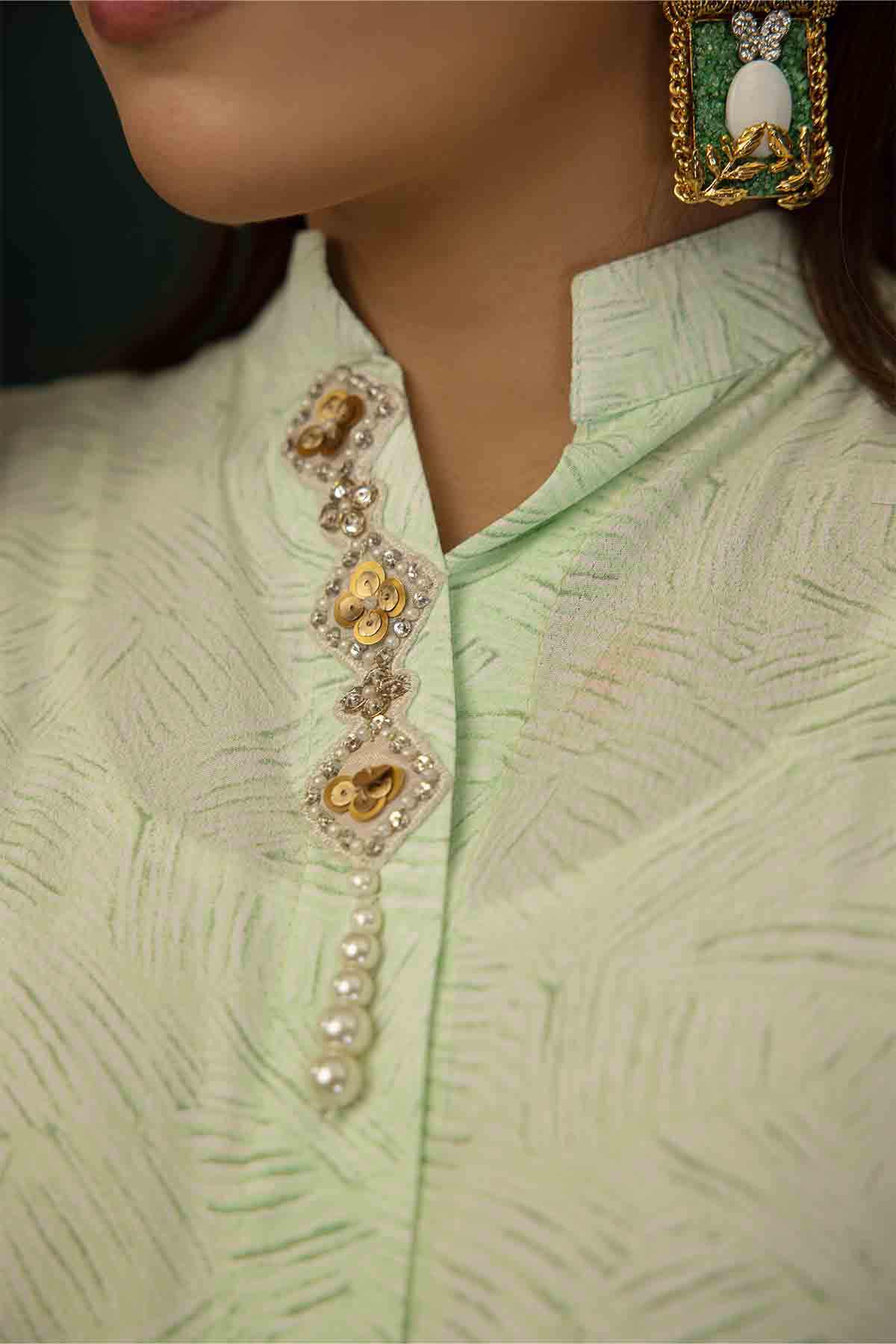 The Ensemble Features A Mint Green Printed Knee-Length Button-Down Tunic With Cuff Sleeves. Neckline Embellished With Hand-Embroidered Motifs. Paired With A Mint Green Pleated Pant With Round Button Finishings To Create A Sophisticated And Classic Look.