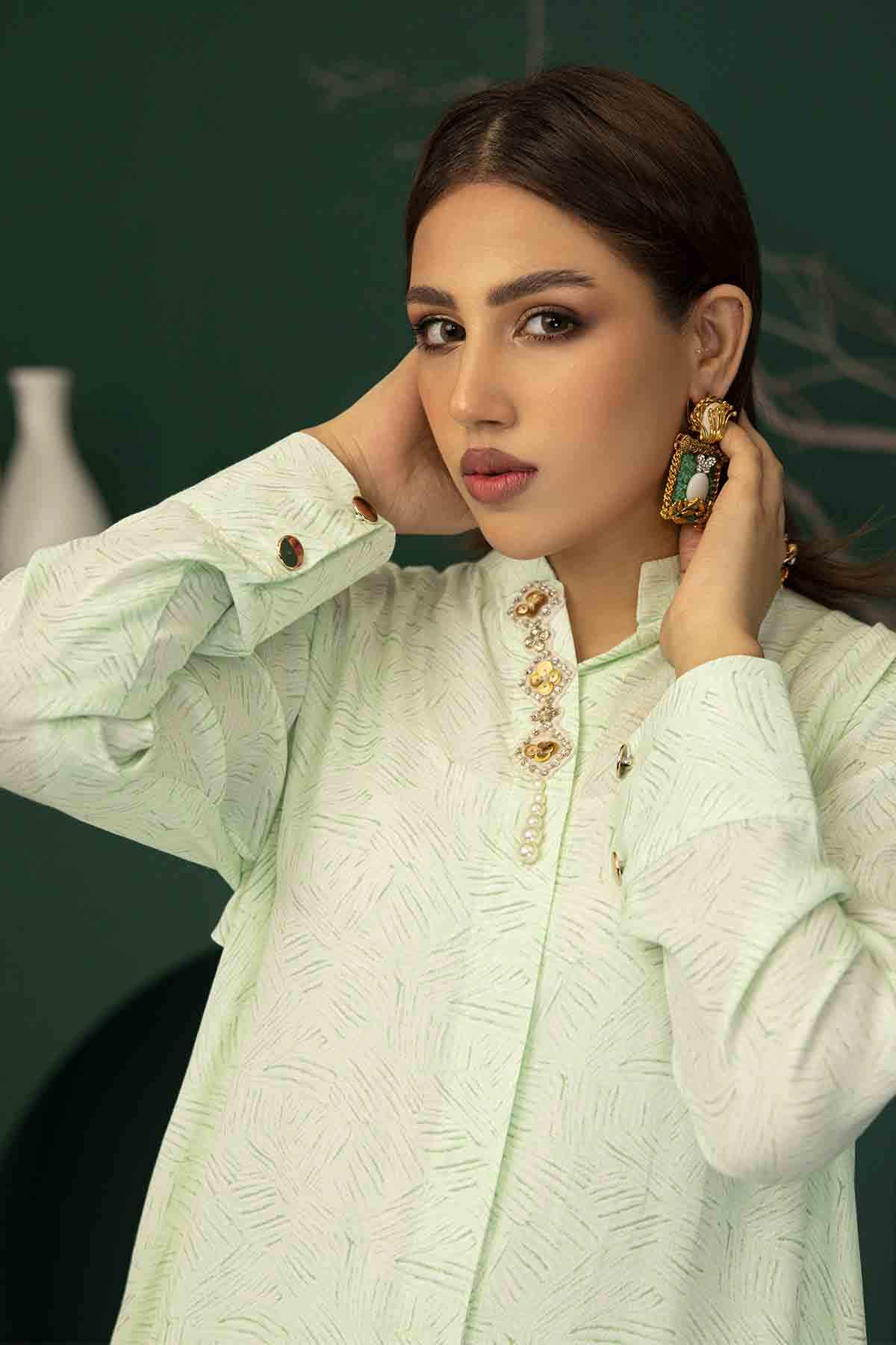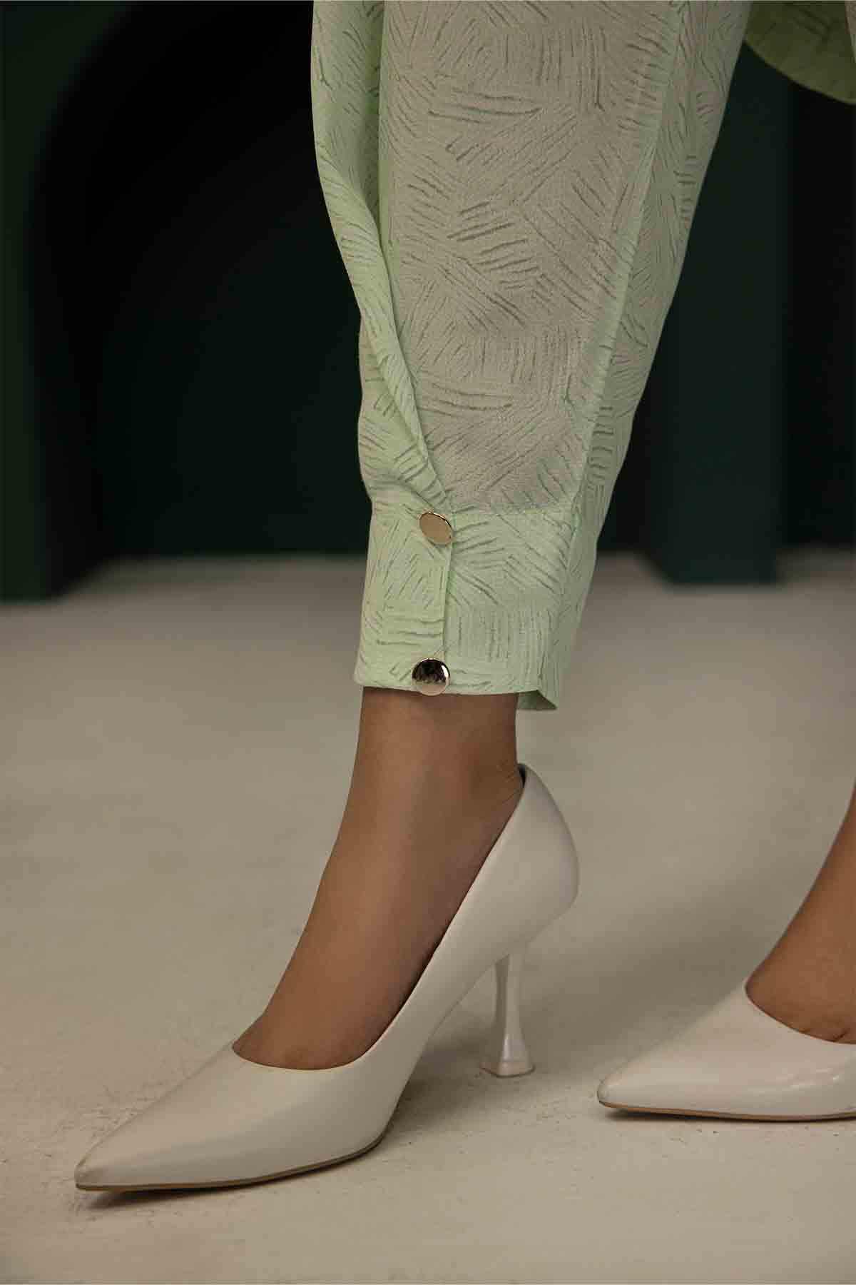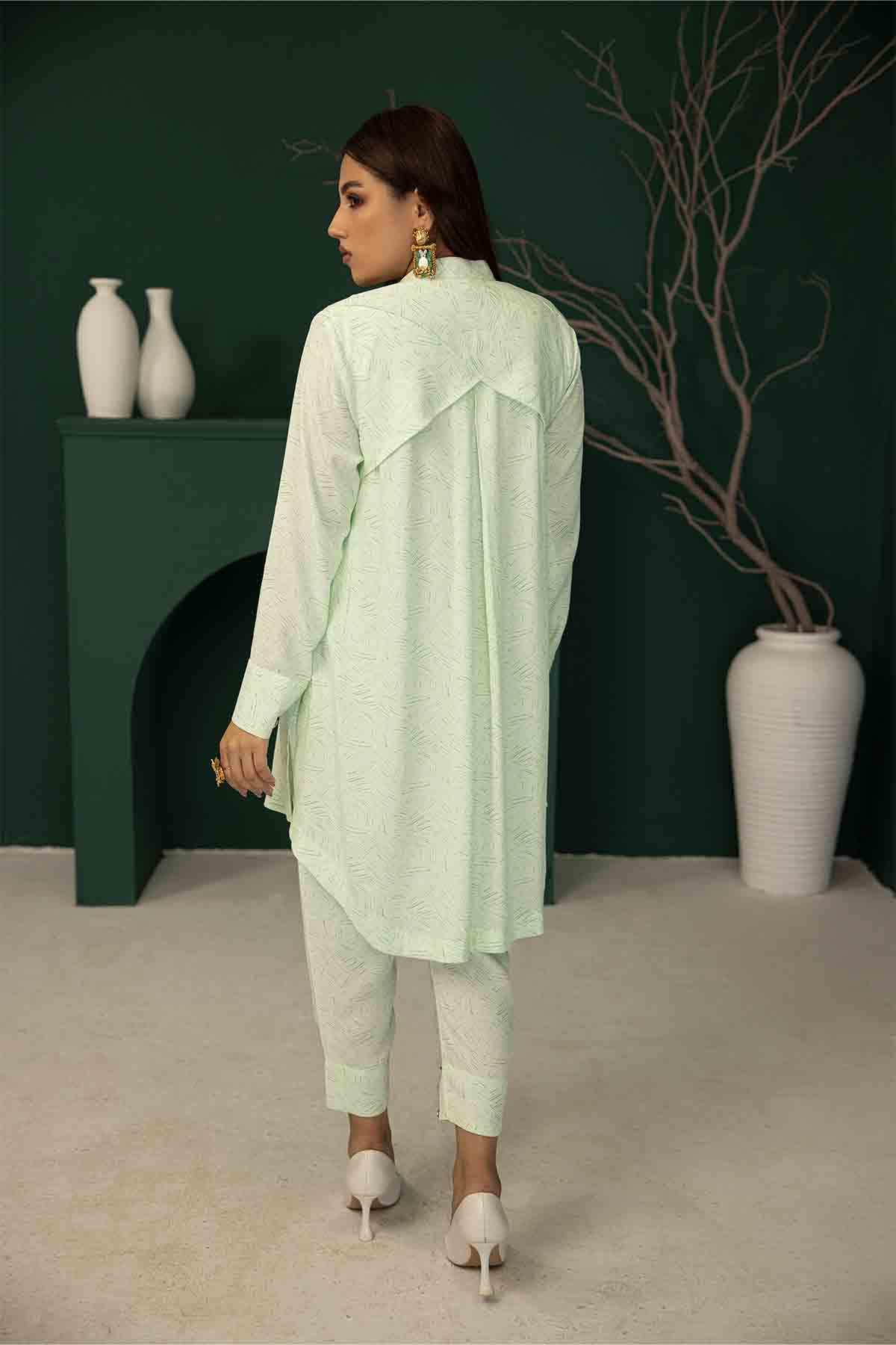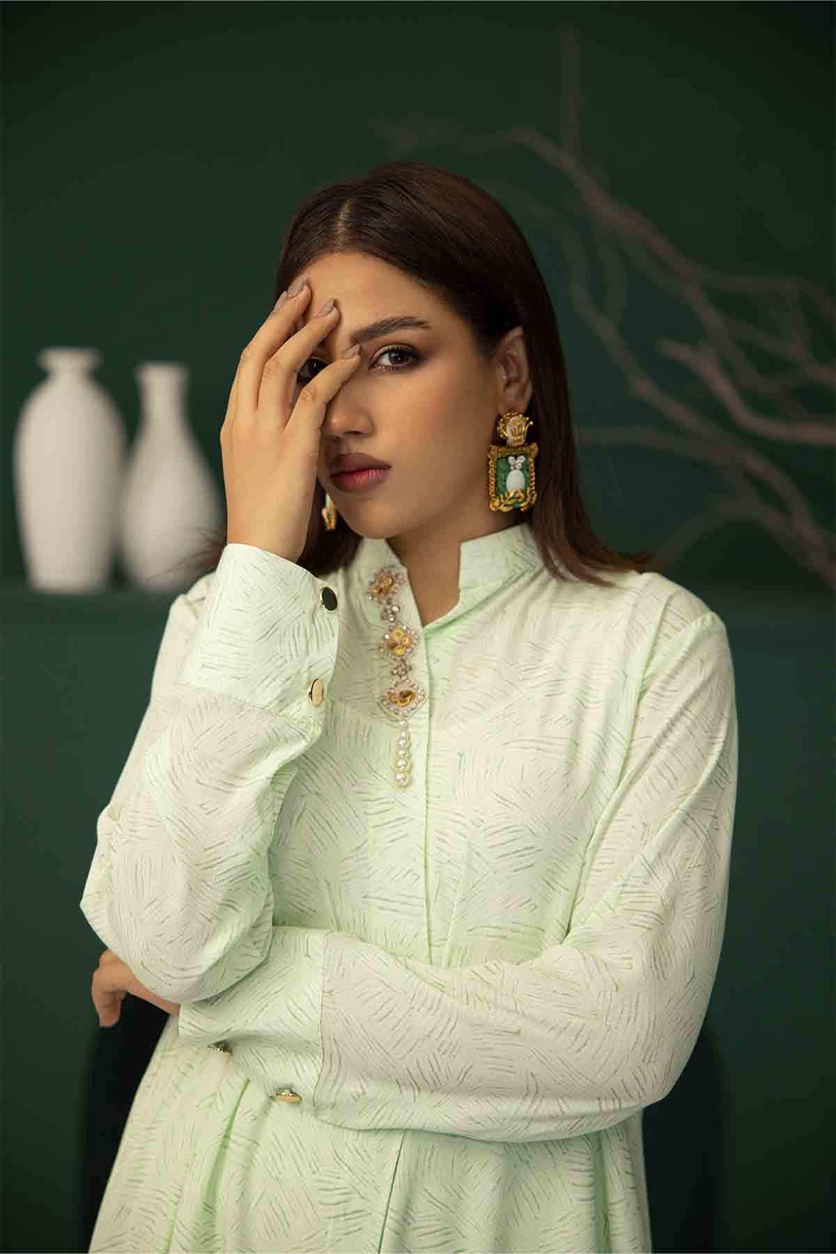 The Ensemble Features A Mint Green Printed Knee-Length Button-Down Tunic With Cuff Sleeves. Neckline Embellished With Hand-Embroidered Motifs. Paired With A Mint Green Pleated Pant With Round Button Finishings To Create A Sophisticated And Classic Look.
