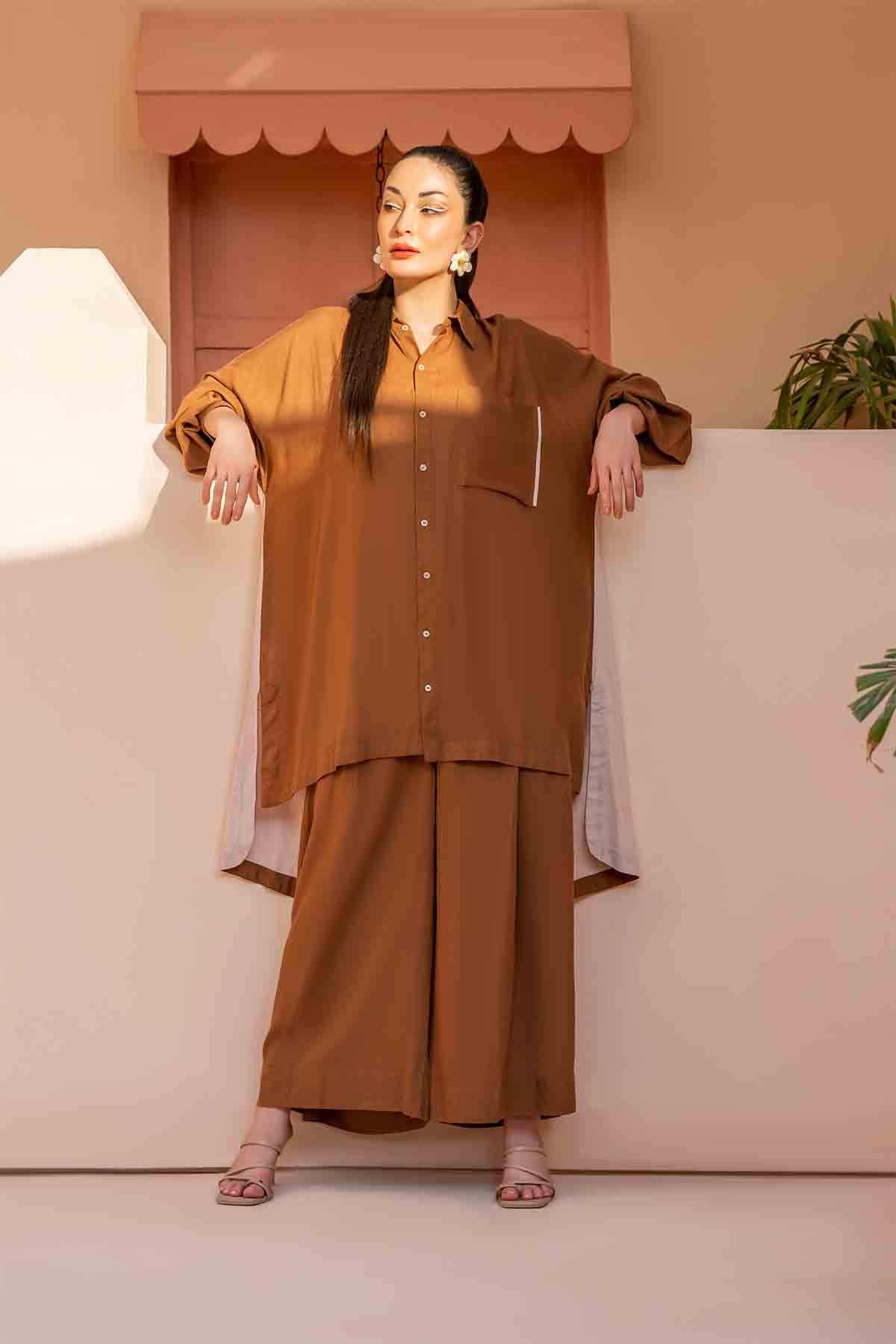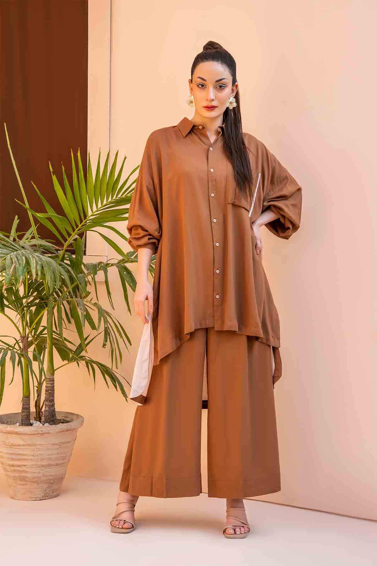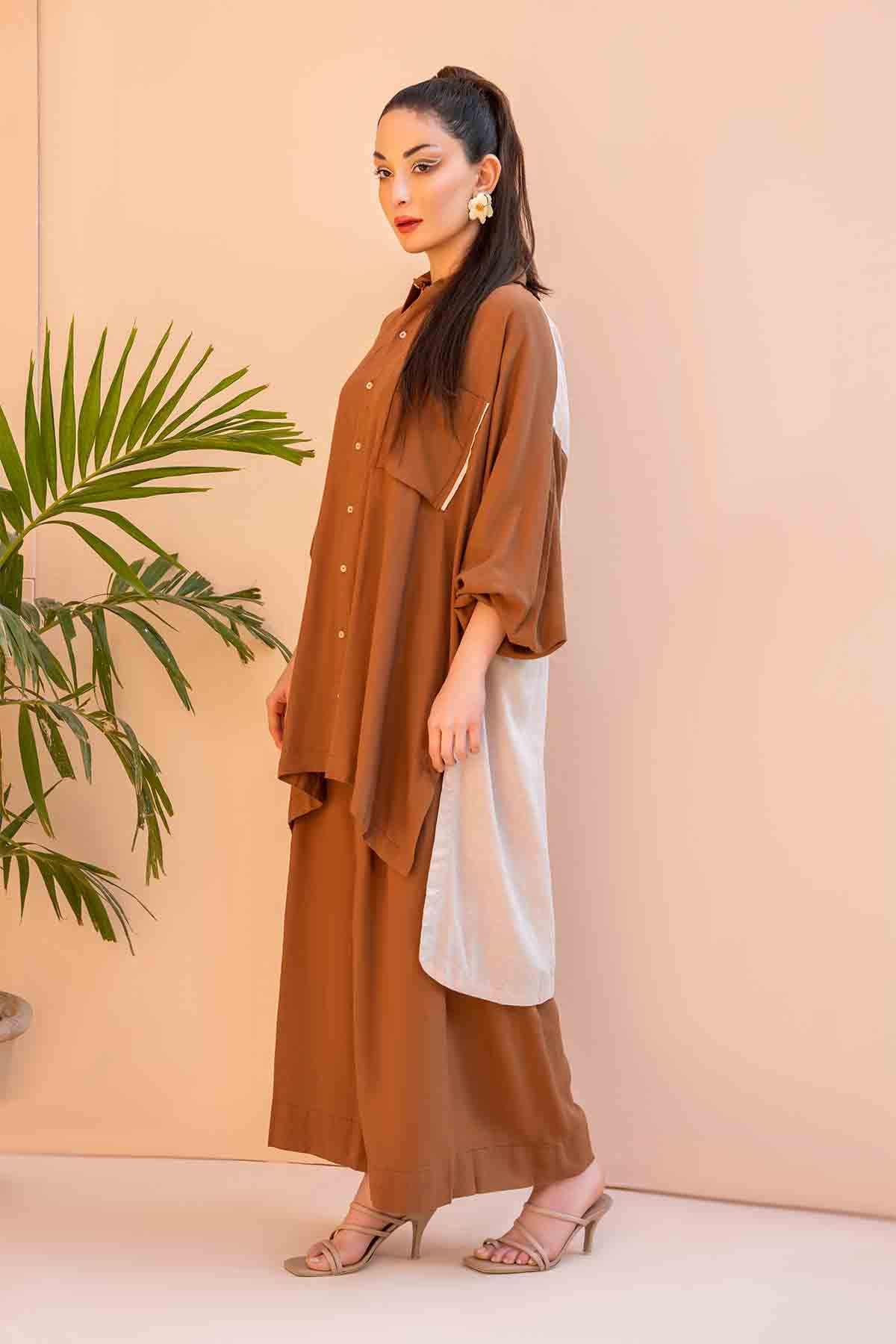 Solids: Pecan Brown Color-Blocked Oversized Cord Set. Button-Down High-Low Shirt Paired Up With Loose Culottes. Its Statement Bishop Sleeves Make It A Must-Have Summer Essential For Your Wardrobe.