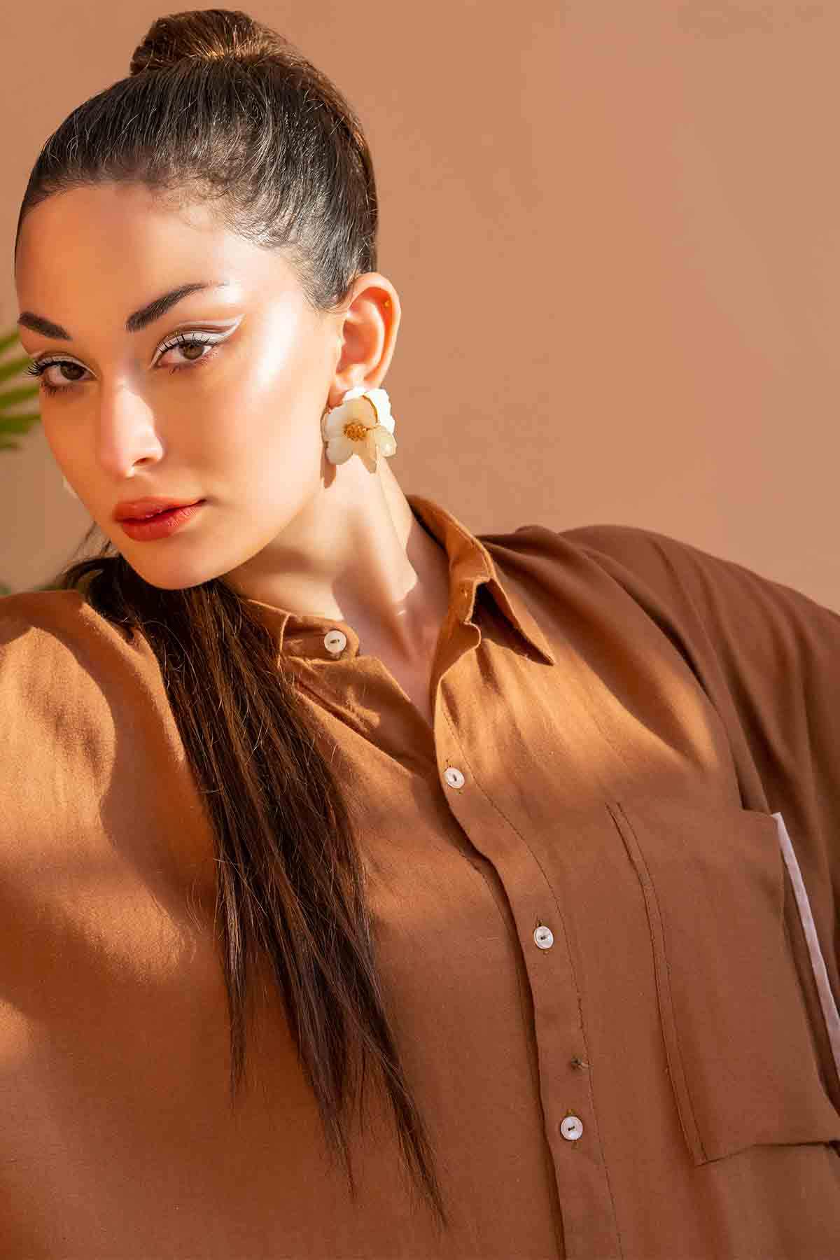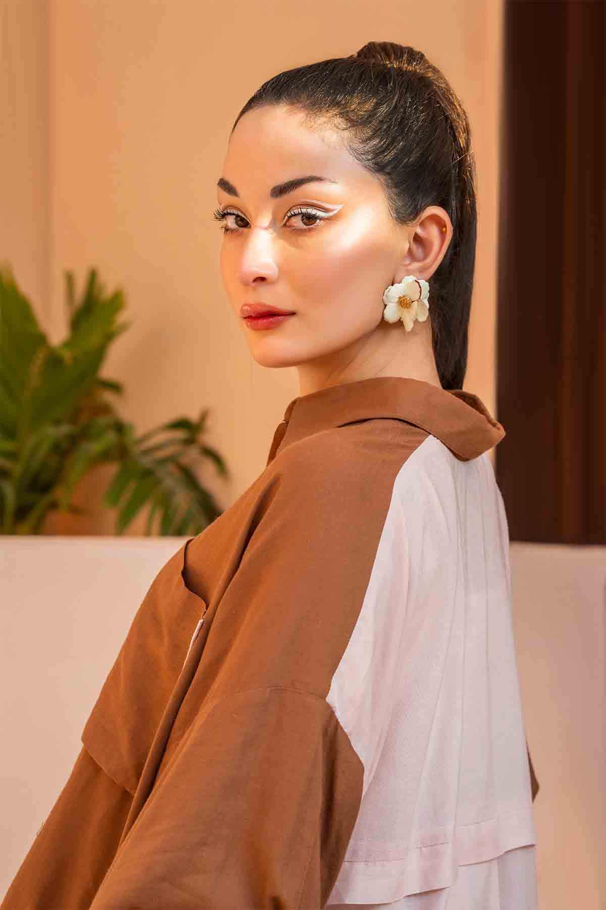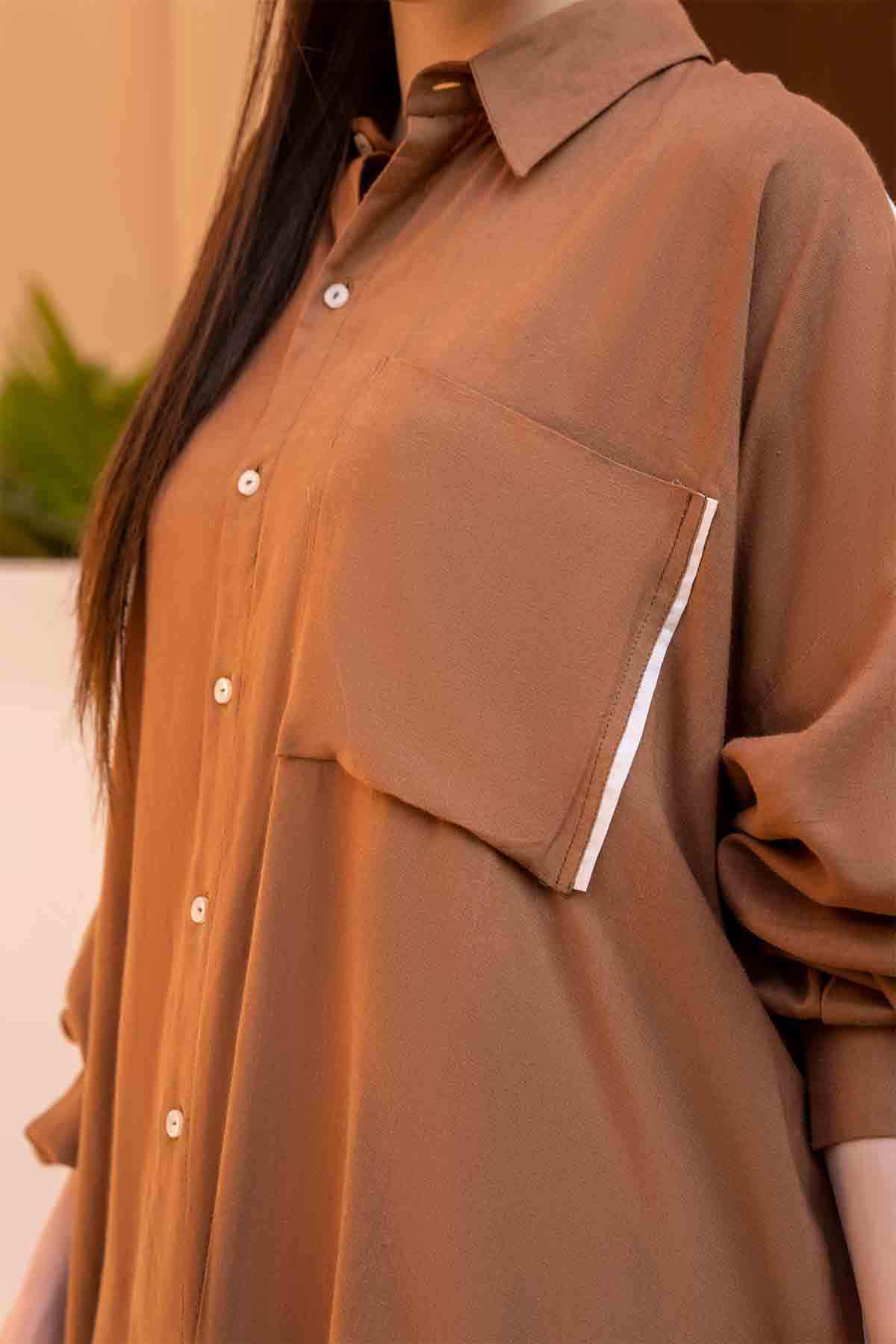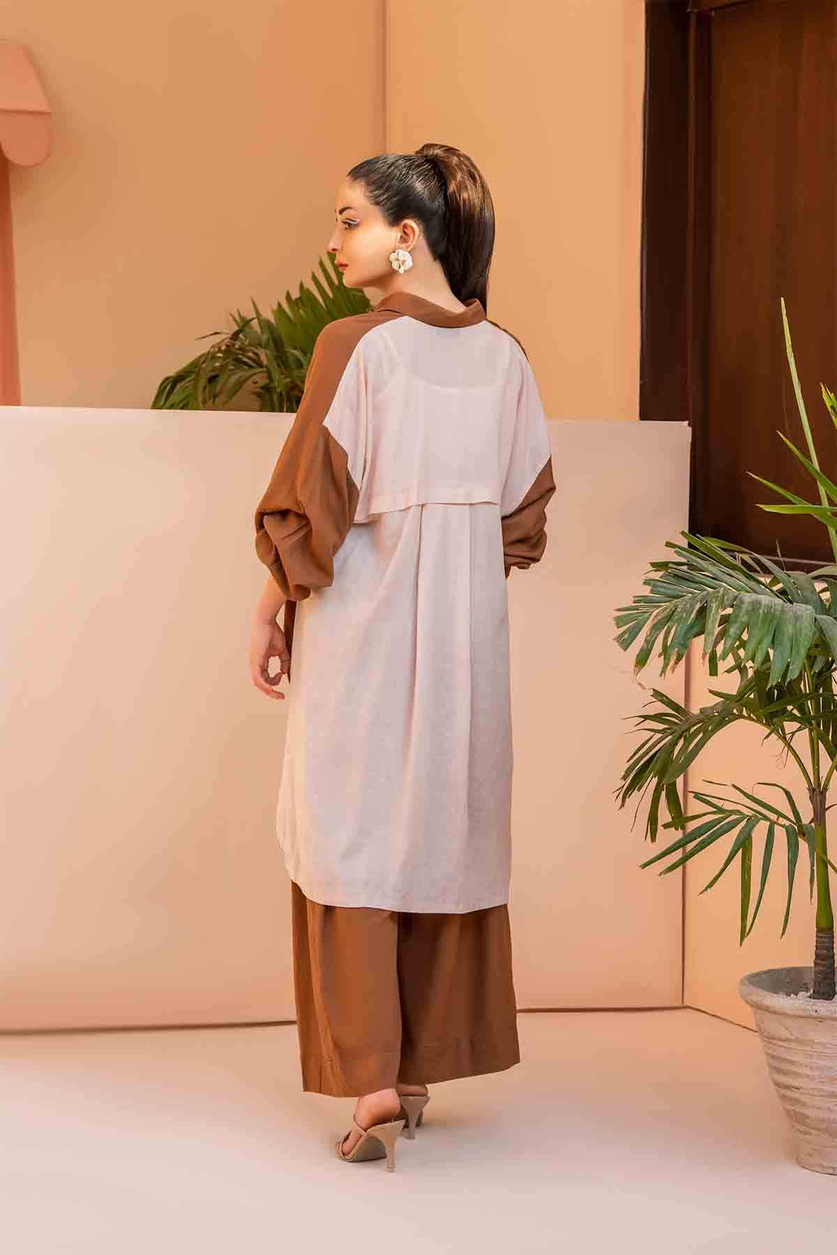 Solids: Pecan Brown Color-Blocked Oversized Cord Set. Button-Down High-Low Shirt Paired Up With Loose Culottes. Its Statement Bishop Sleeves Make It A Must-Have Summer Essential For Your Wardrobe.
