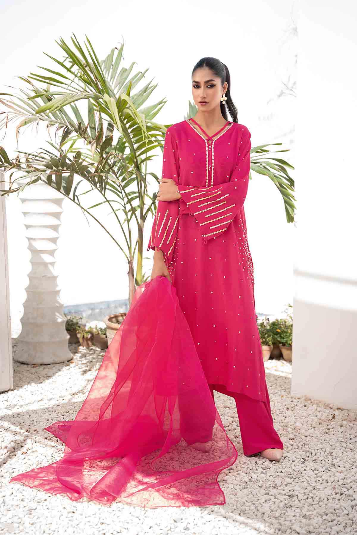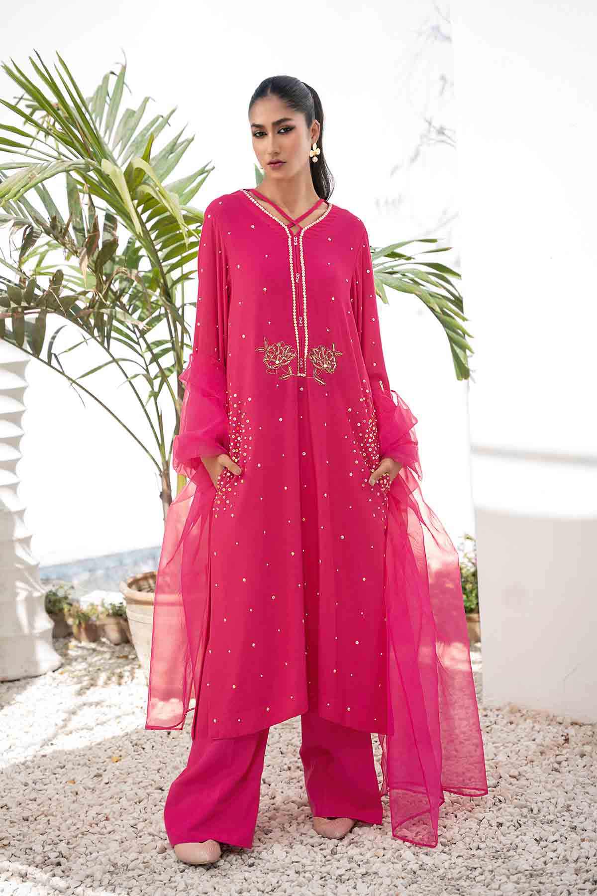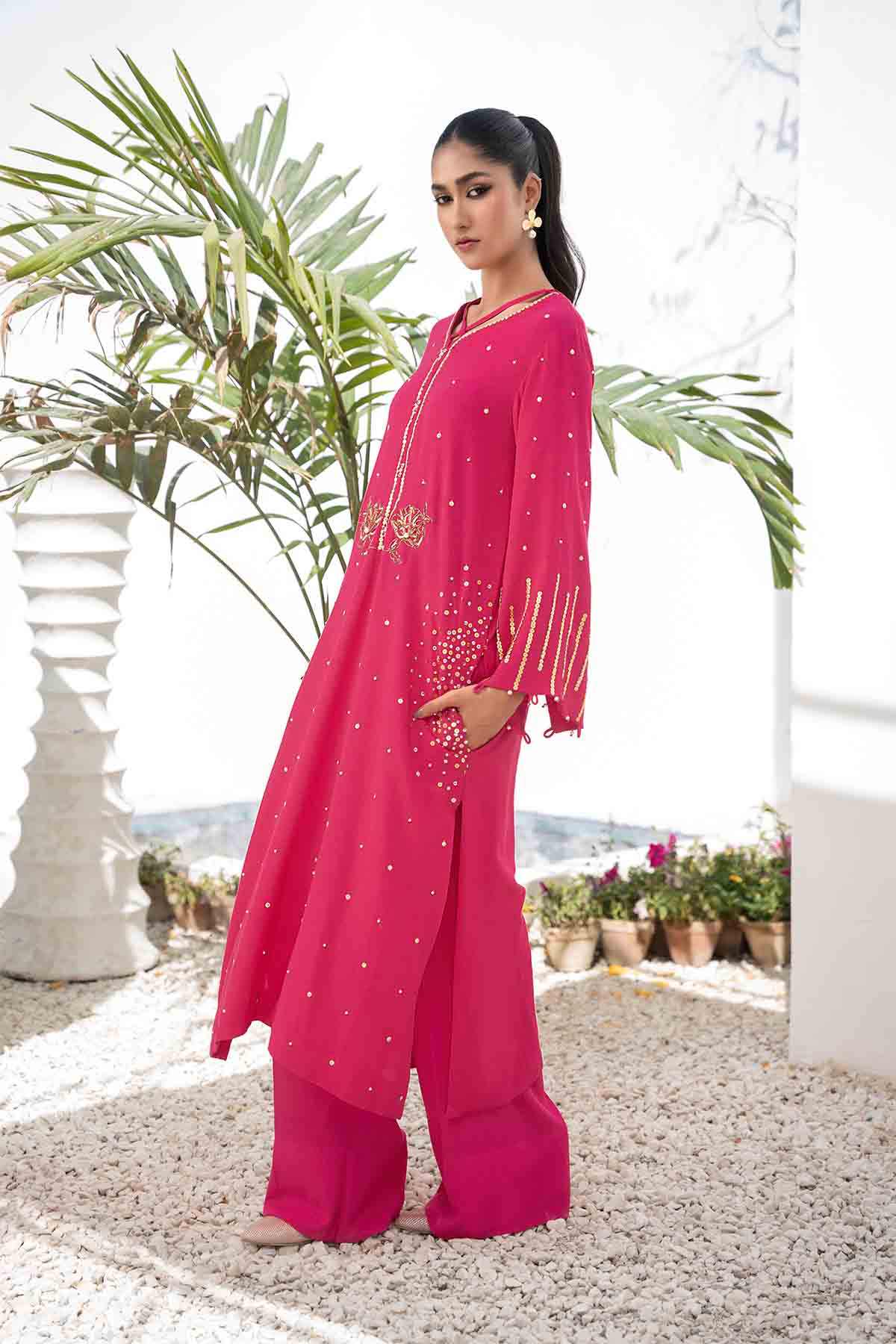 Melia 24:Â The Ensemble Features Fuchsia Pink Pure Crepe Georgette Long Tunic With Plain Organza Dupatta. Tunic Embellished With Sequins Bugle Beads And Crystals Hand Embroidery All Over. Embroidered Slit Sleeves And Pockets. Paired Up With Matching Coloured Culottes To Create An Elegant And Classic Look.