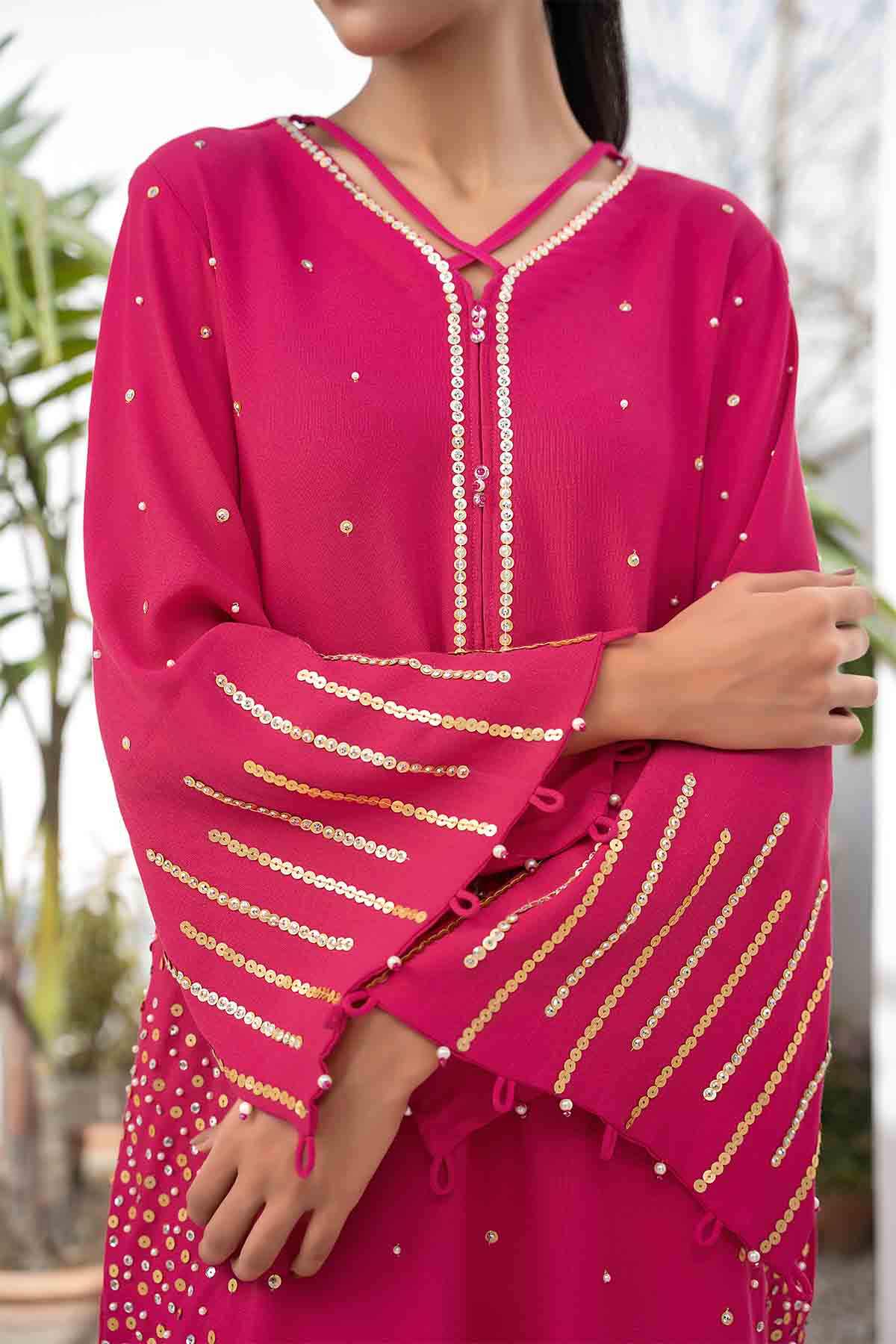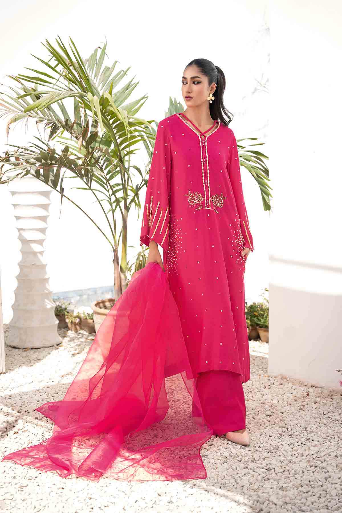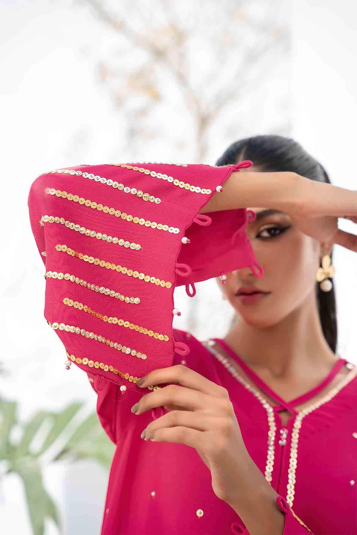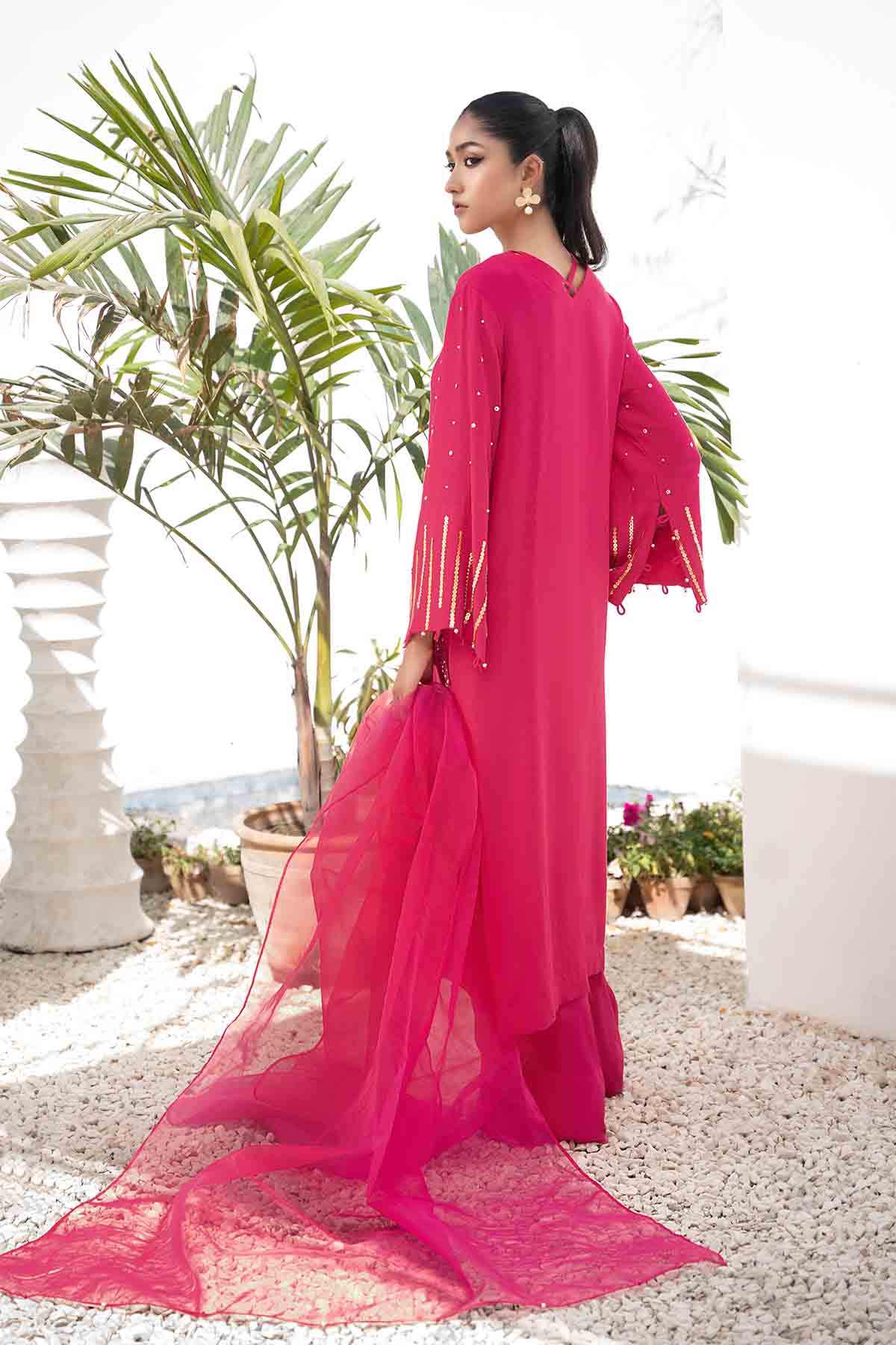 Melia 24:Â The Ensemble Features Fuchsia Pink Pure Crepe Georgette Long Tunic With Plain Organza Dupatta. Tunic Embellished With Sequins Bugle Beads And Crystals Hand Embroidery All Over. Embroidered Slit Sleeves And Pockets. Paired Up With Matching Coloured Culottes To Create An Elegant And Classic Look.