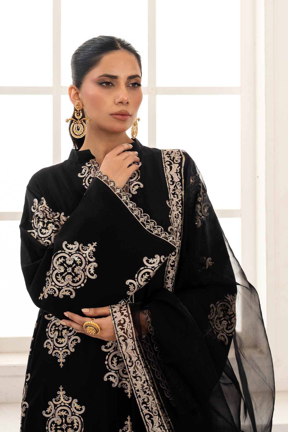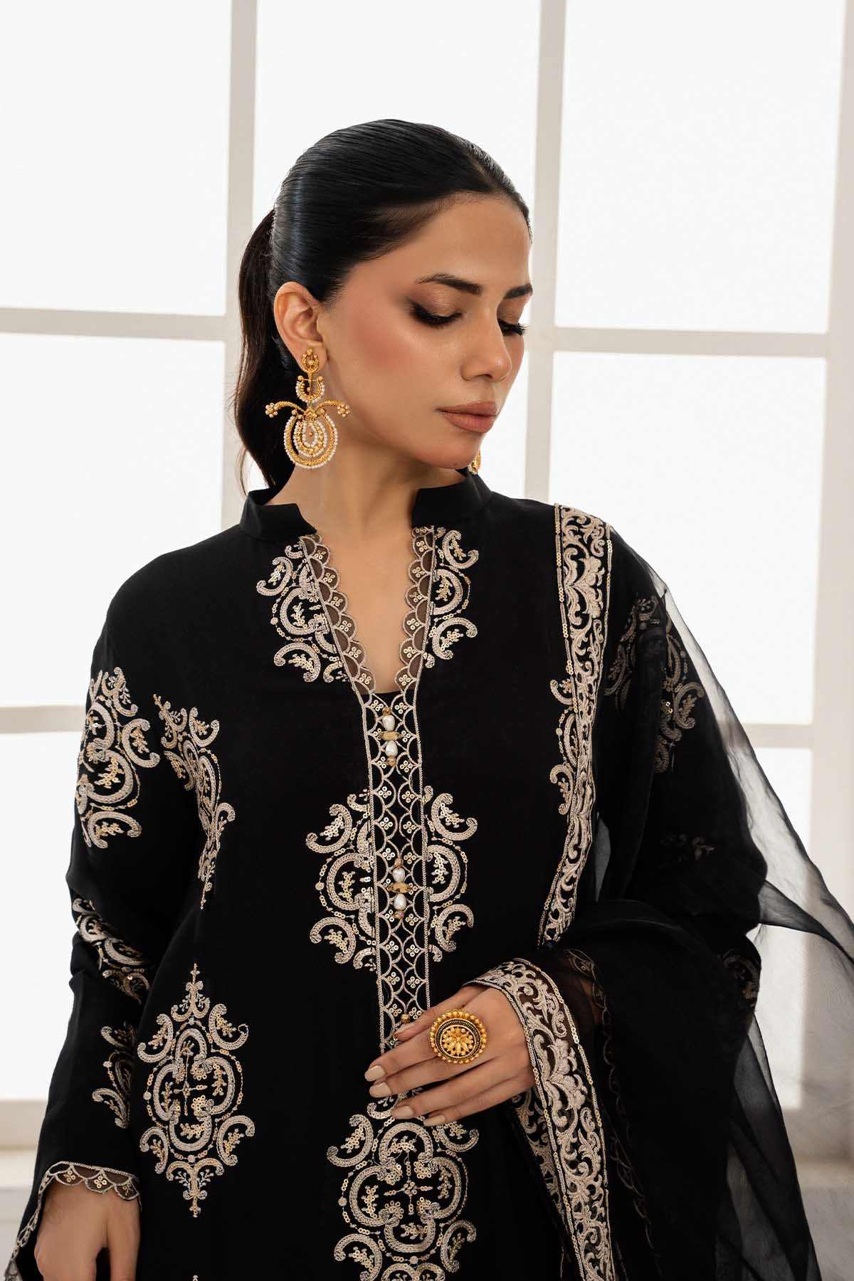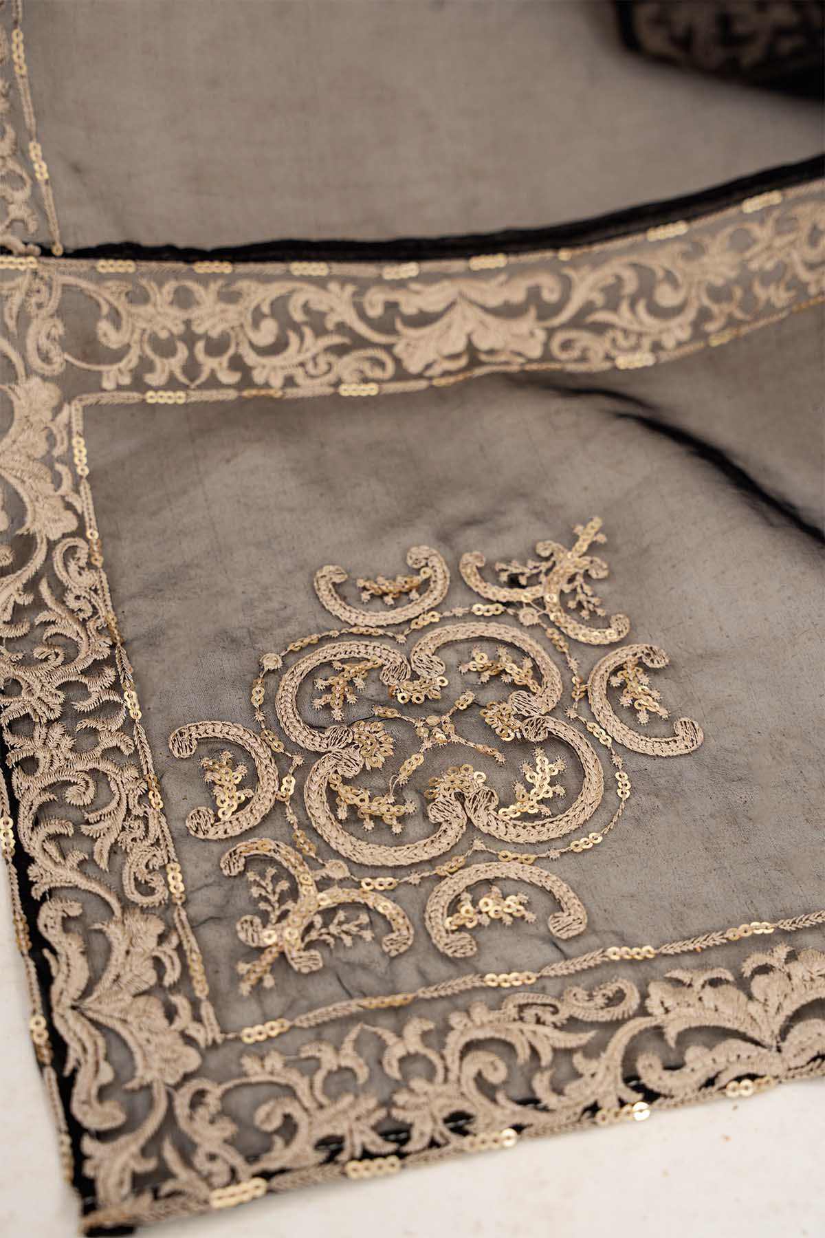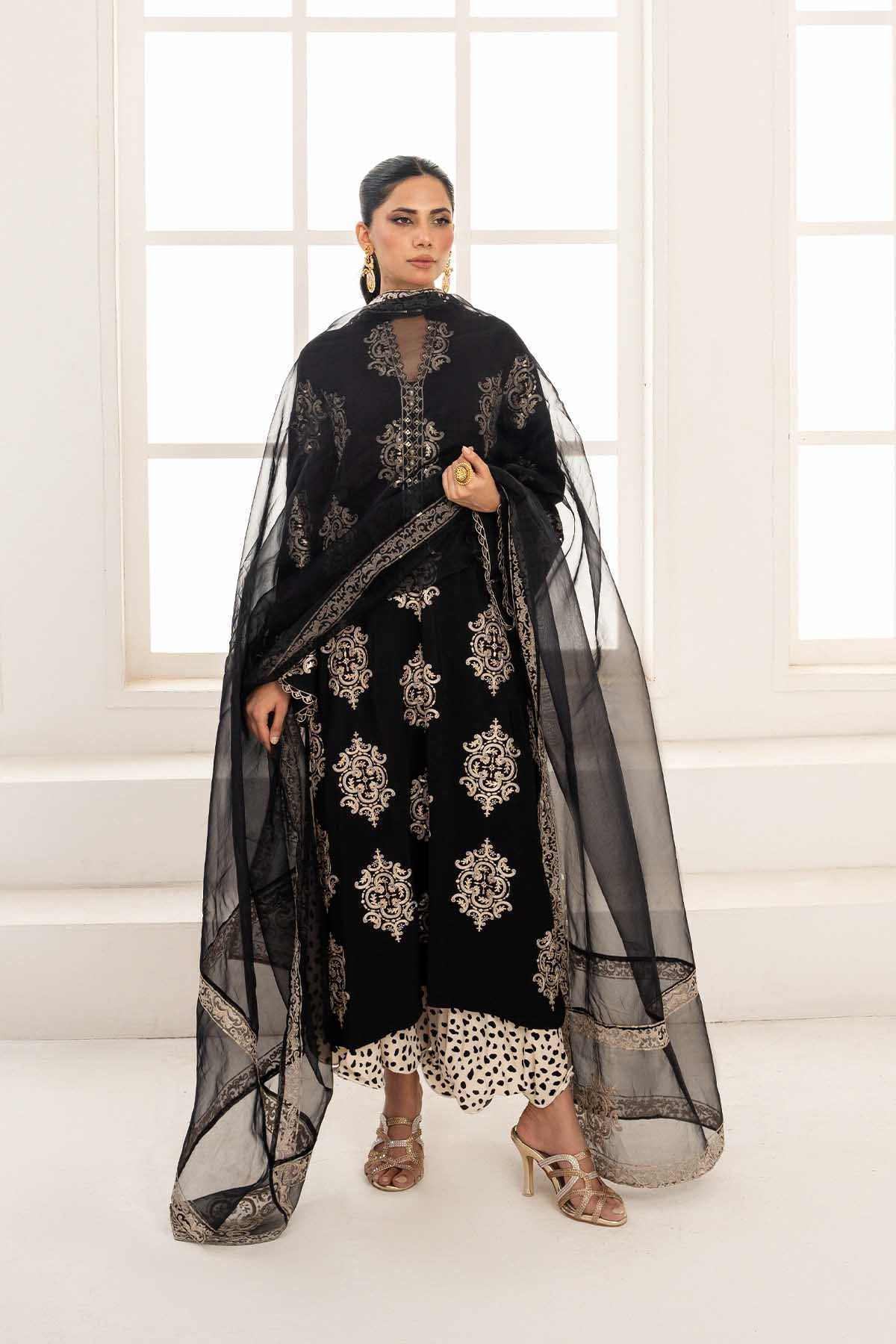 Flora & Fauna Eid Festive A Black Crepe Georgette Band Collar Long Shirt Features Detailed Thread And Sequins Embroidery.Kurta Sleeves With Organza Lace Finishing.The Printed Crepe Georgette Swirl Dhaka Pajama.Paired With Black Organza Dupatta Adorned With Thread And Sequins Embroidery Motifs And Borders.