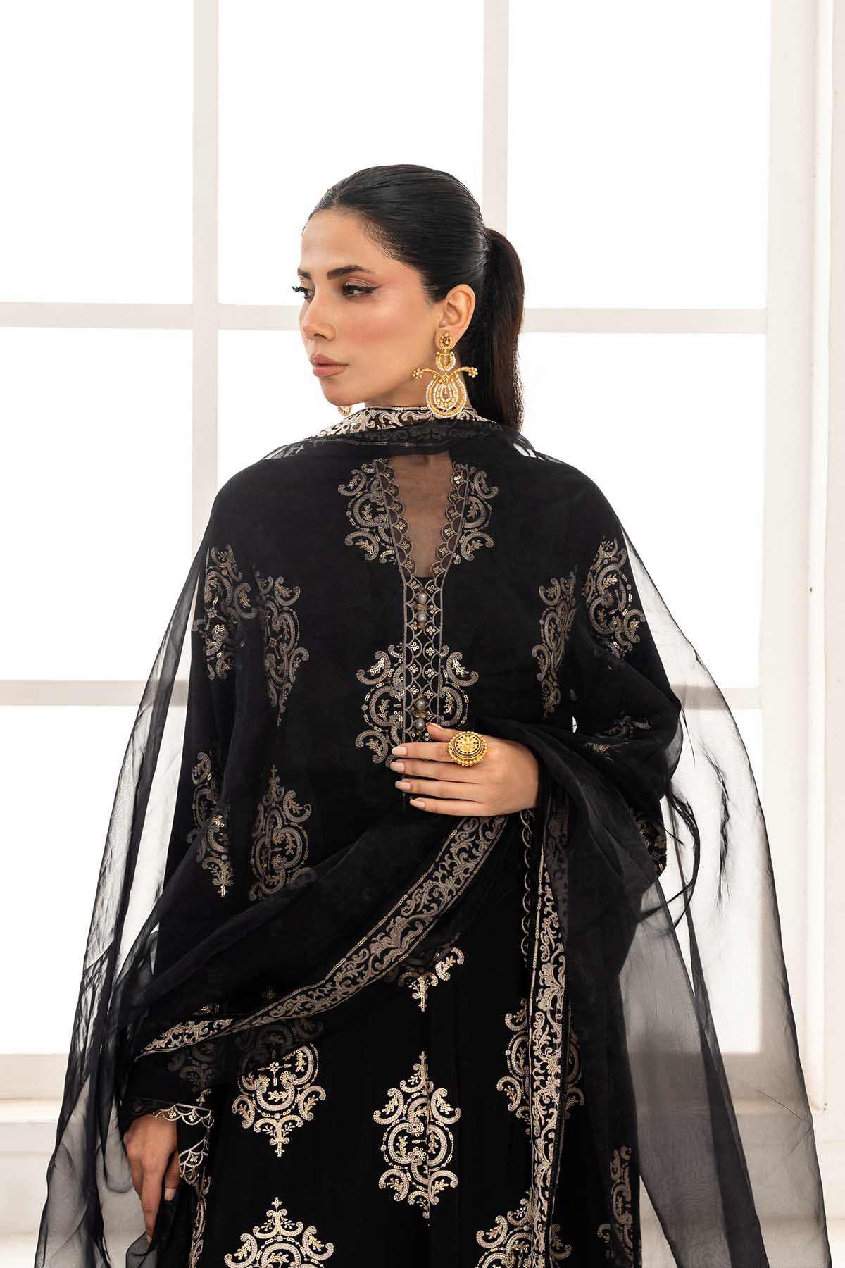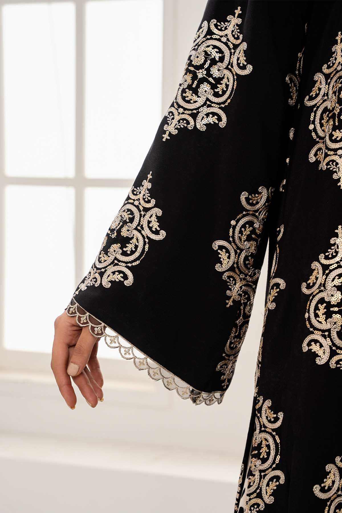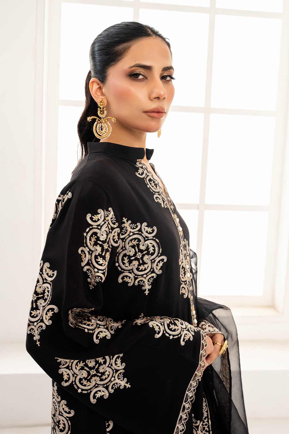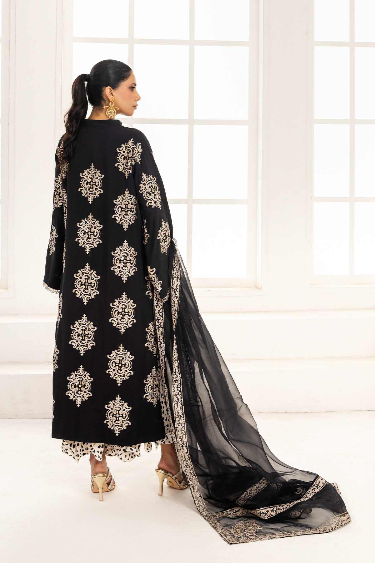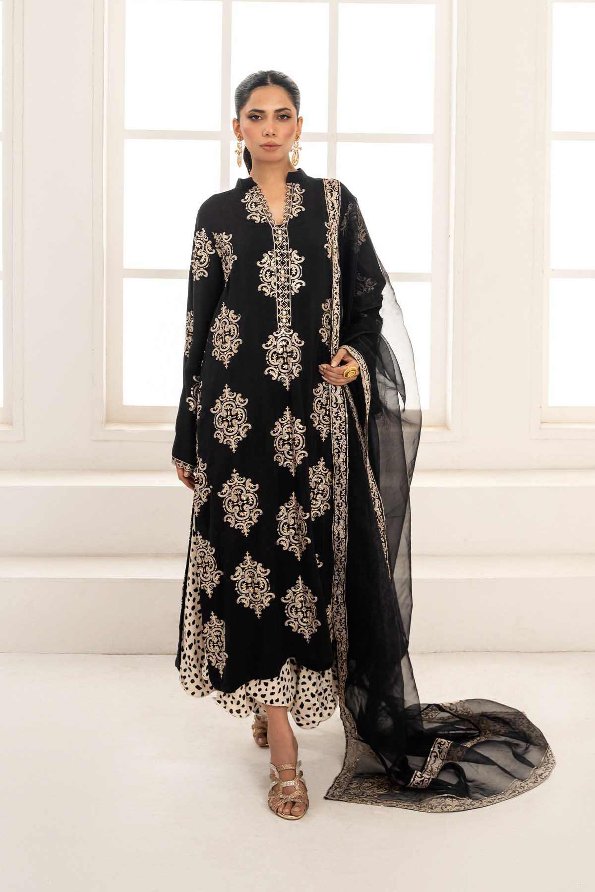 Flora & Fauna Eid Festive A Black Crepe Georgette Band Collar Long Shirt Features Detailed Thread And Sequins Embroidery.Kurta Sleeves With Organza Lace Finishing.The Printed Crepe Georgette Swirl Dhaka Pajama.Paired With Black Organza Dupatta Adorned With Thread And Sequins Embroidery Motifs And Borders.