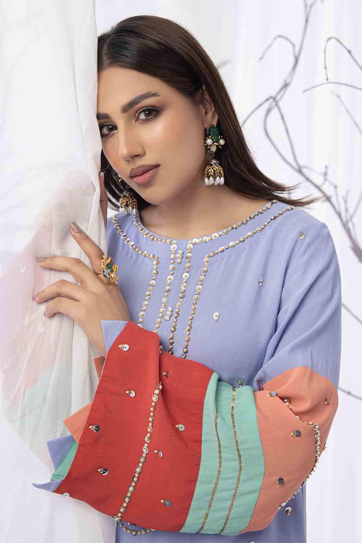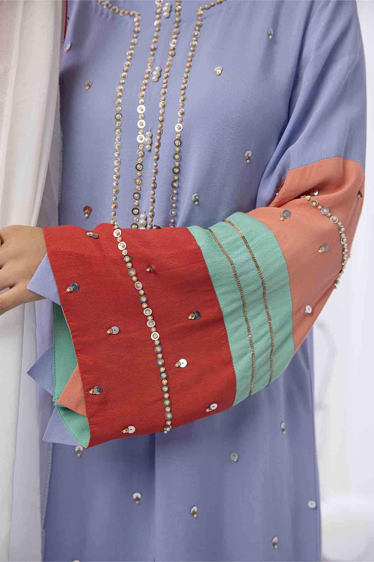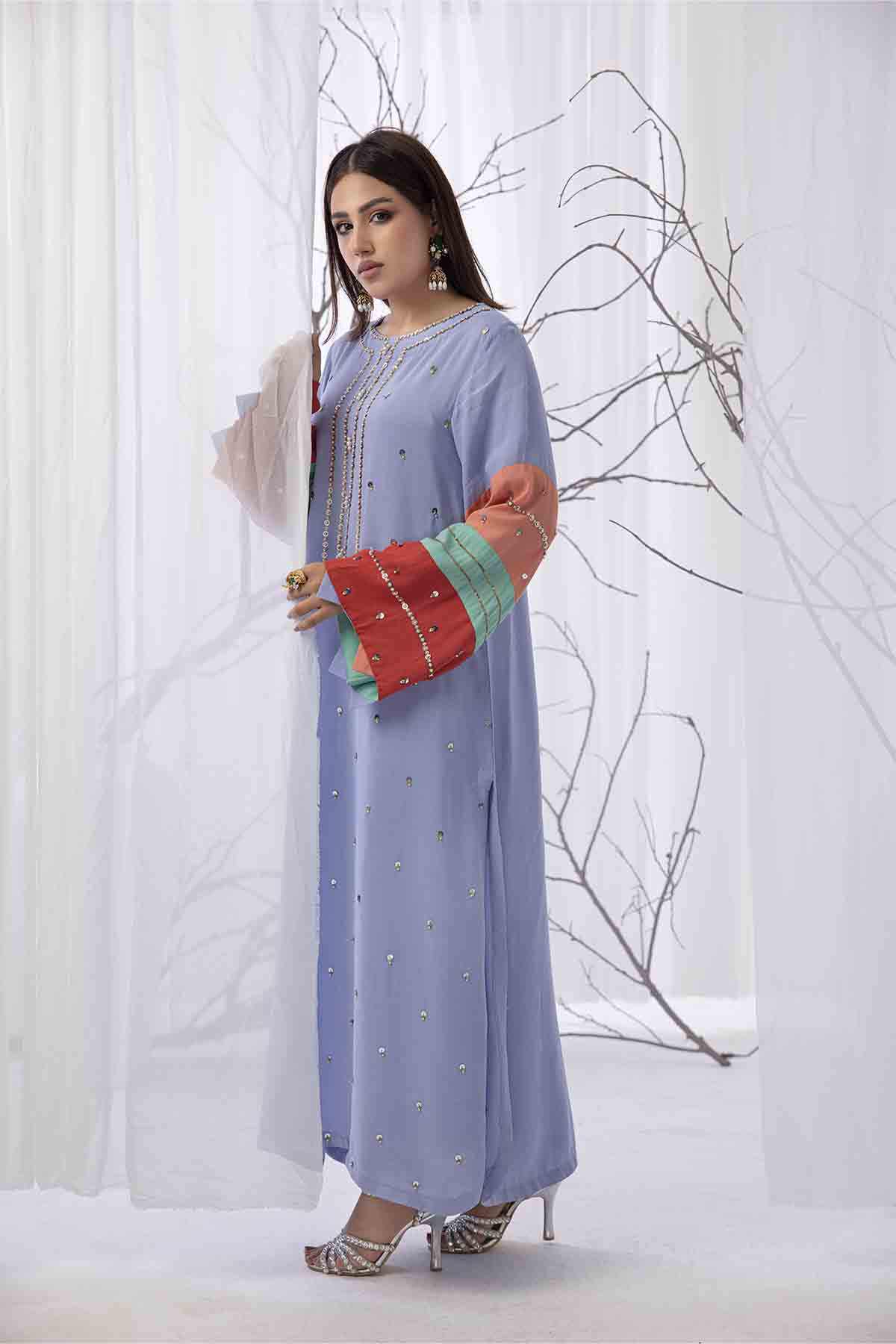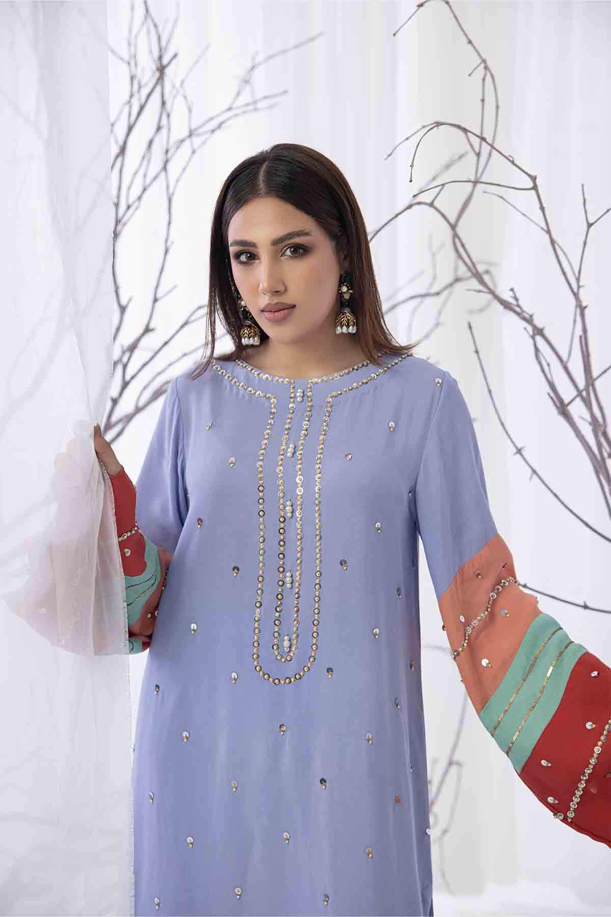 Jahaan 23: Color-Blocked Pure Crepe Georgette Light Blue Shirt. A Line Long Shirt Adorned With Pearls & Sequins Hand Embroidery All Over. Paired Up With Light Blue Pure Crepe Georgette Culottes. A Perfect Chic Look For This Festive Season.