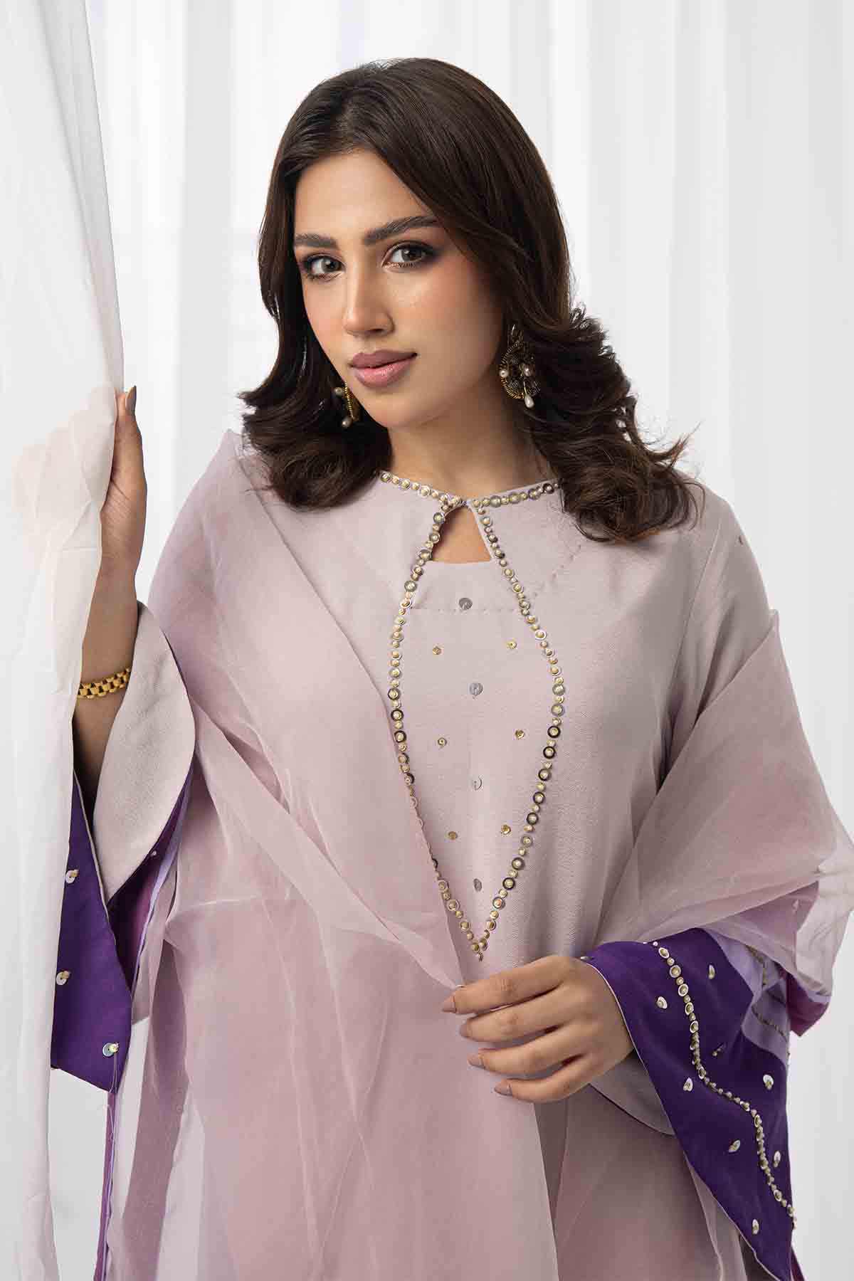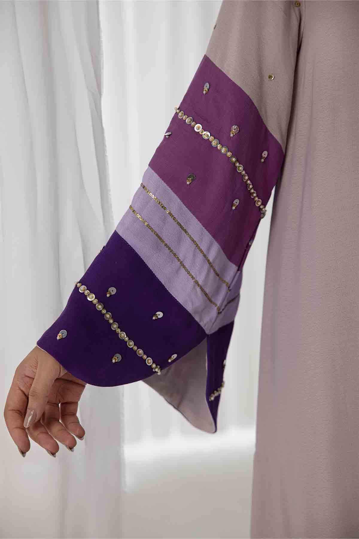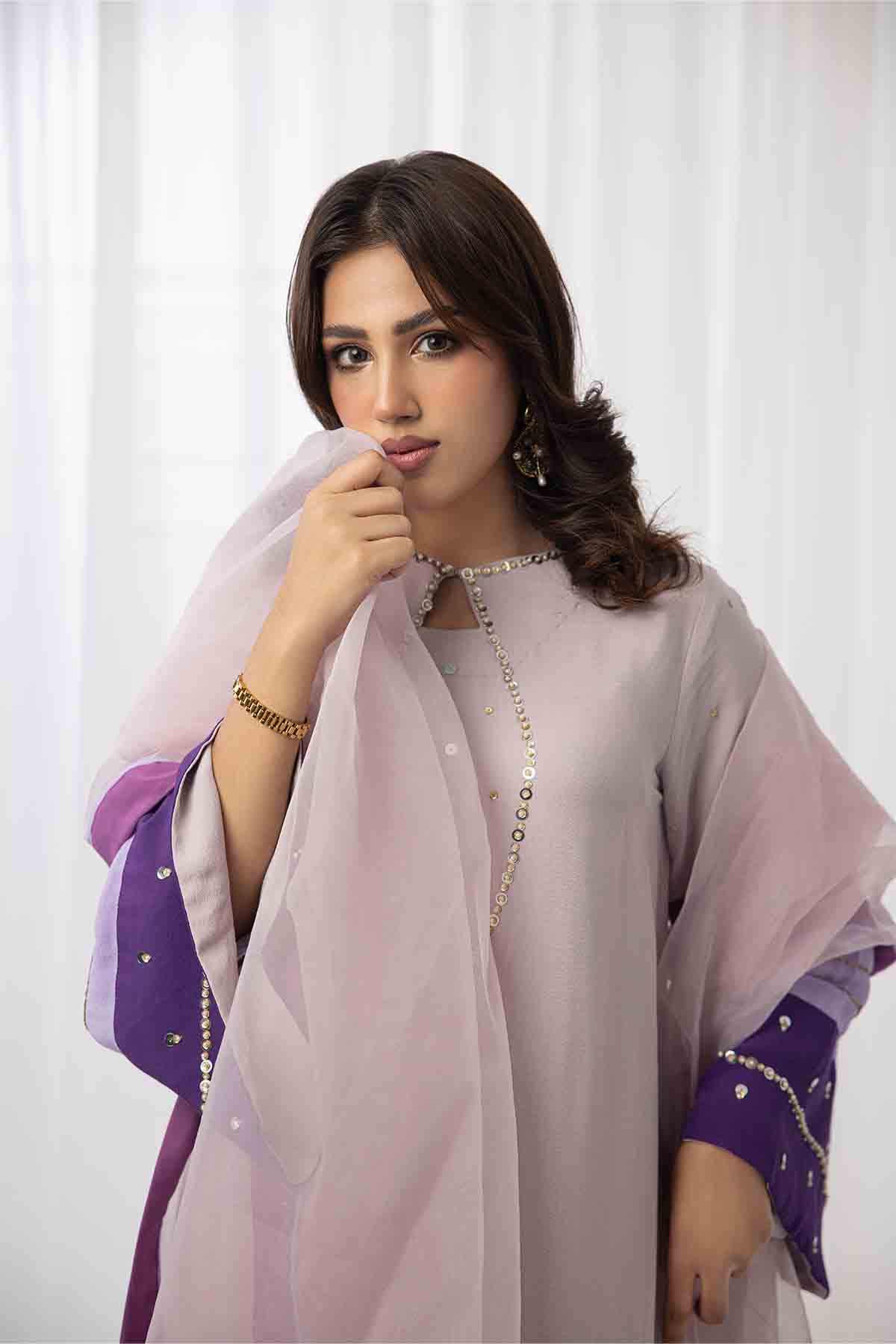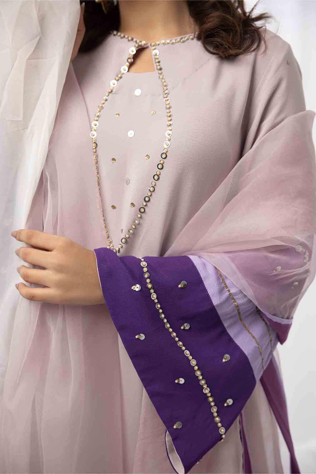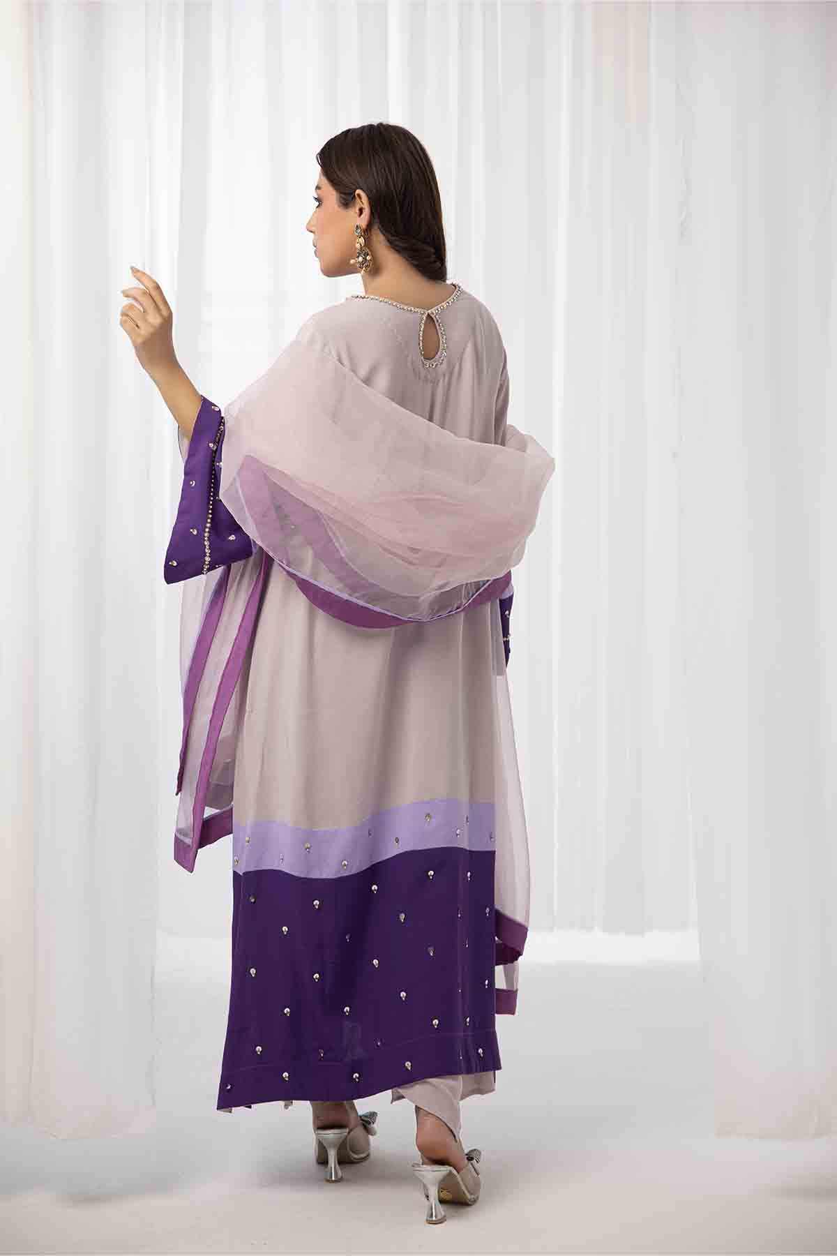 Jahaan 23: Color-Blocked Pure Crepe Georgette Lavender Shirt With Shades Of Purple. A Line Long Shirt Adorned With Pearls & Sequins Hand Embroidery All Over. Paired Up With The Same Color Fabric Asymmetrical Dhaka Pajama And Organza Dupatta. A Perfect Chic Look For This Festive Season.