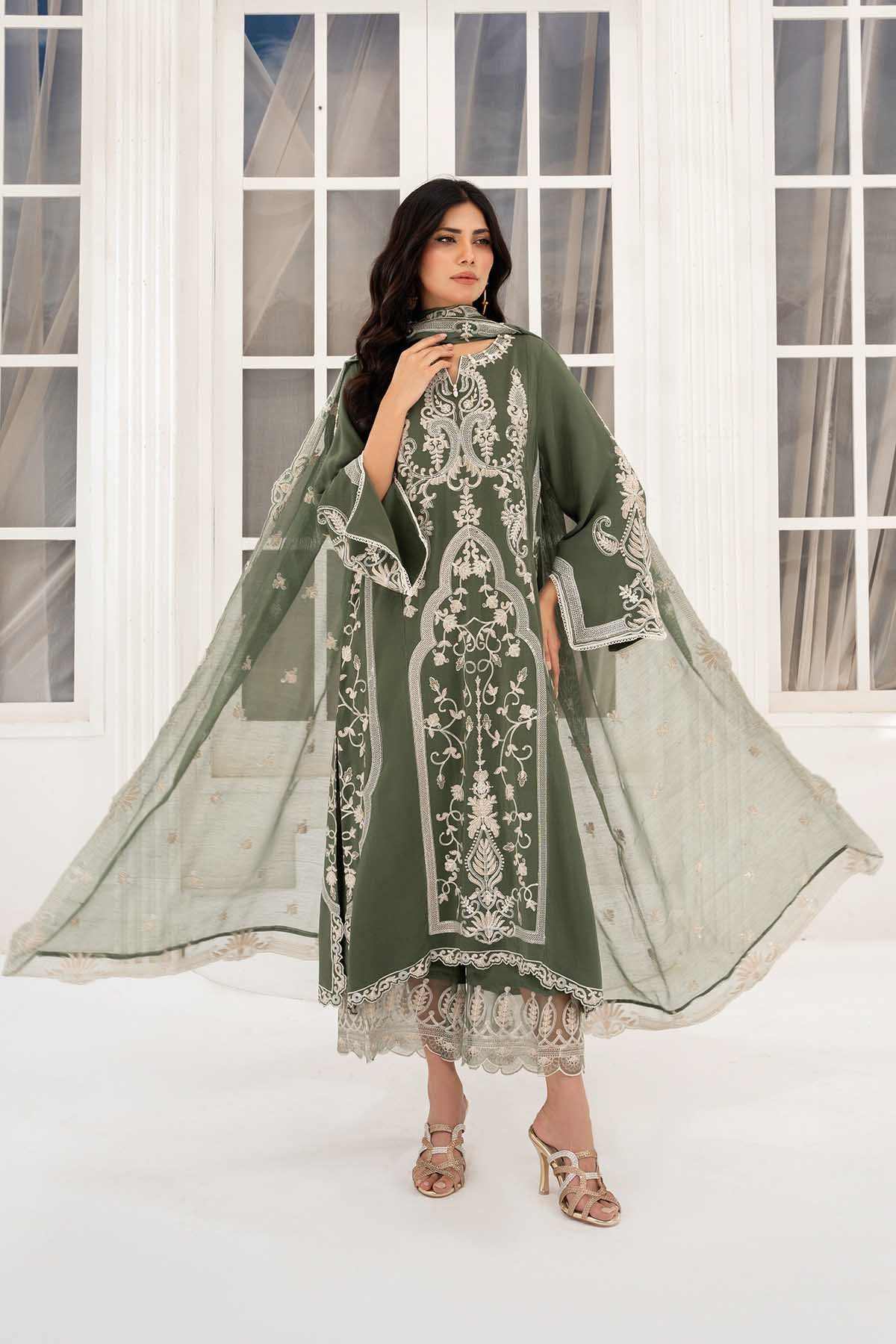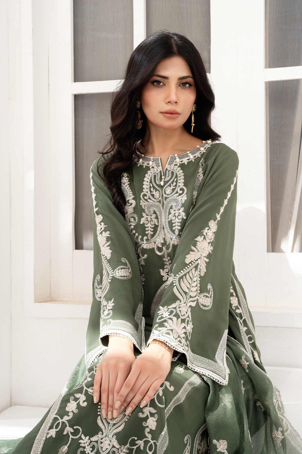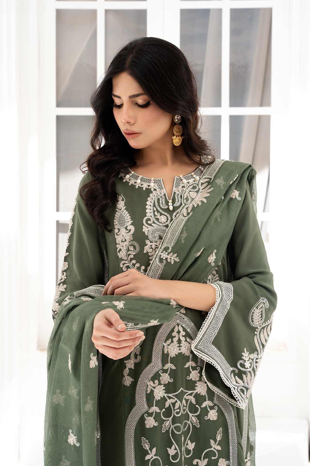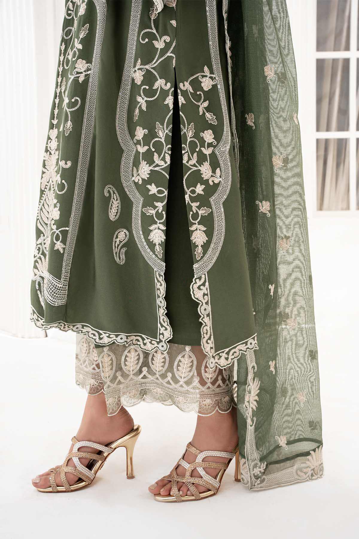 Flora & Fauna Eid Festive A Sage Green Crepe Georgette Long A Line Shirt With Round Neck Features Detailed Ivory Thread And Sequins Embroidery.Slit Sleeves With Lace Finishing.Pearls And Beads Finishing On The Neckline.Sage Green Crepe Georgette Culotte Embellished With Embroidered Organza On The Edges.Paired With Sage Green Cotton Net Dupatta Adorned With Thread And Sequins Embroidery.