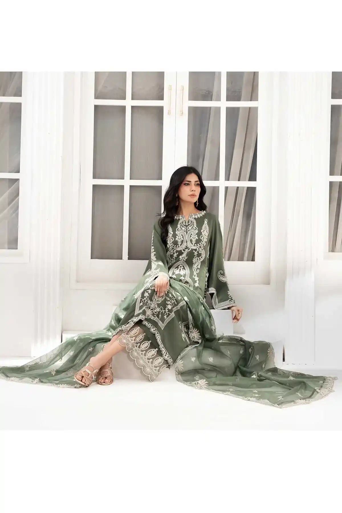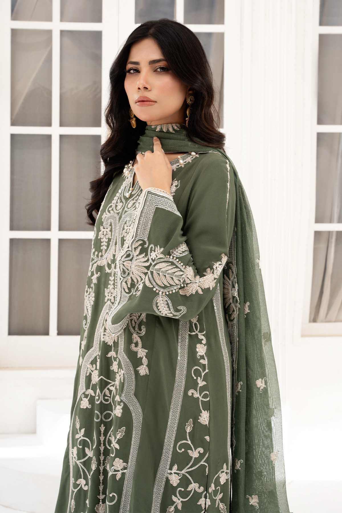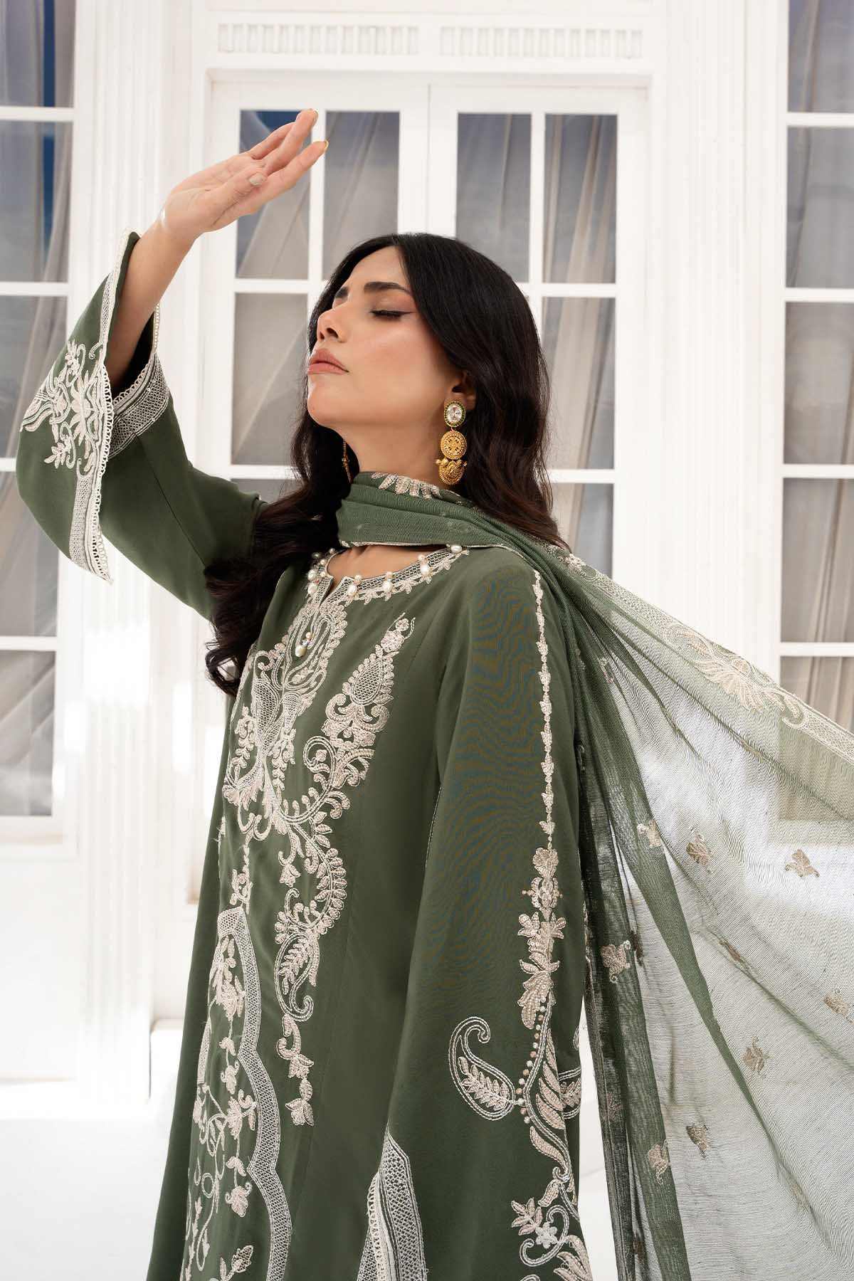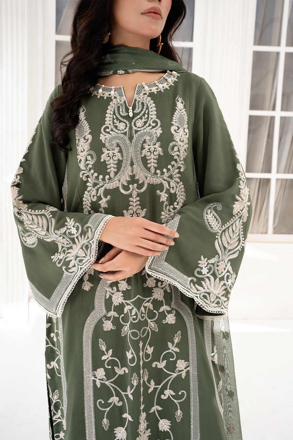 Flora & Fauna Eid Festive A Sage Green Crepe Georgette Long A Line Shirt With Round Neck Features Detailed Ivory Thread And Sequins Embroidery.Slit Sleeves With Lace Finishing.Pearls And Beads Finishing On The Neckline.Sage Green Crepe Georgette Culotte Embellished With Embroidered Organza On The Edges.Paired With Sage Green Cotton Net Dupatta Adorned With Thread And Sequins Embroidery.