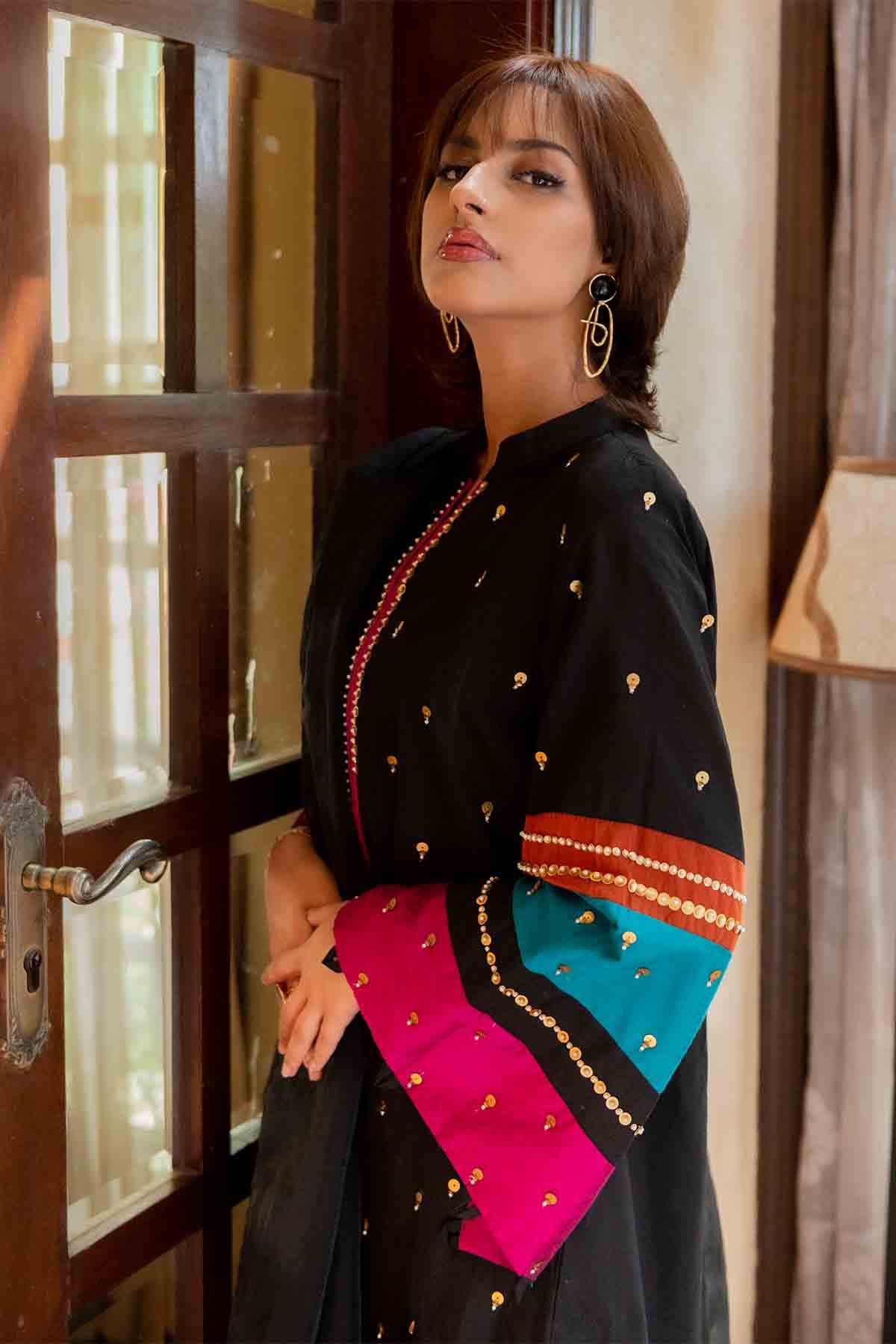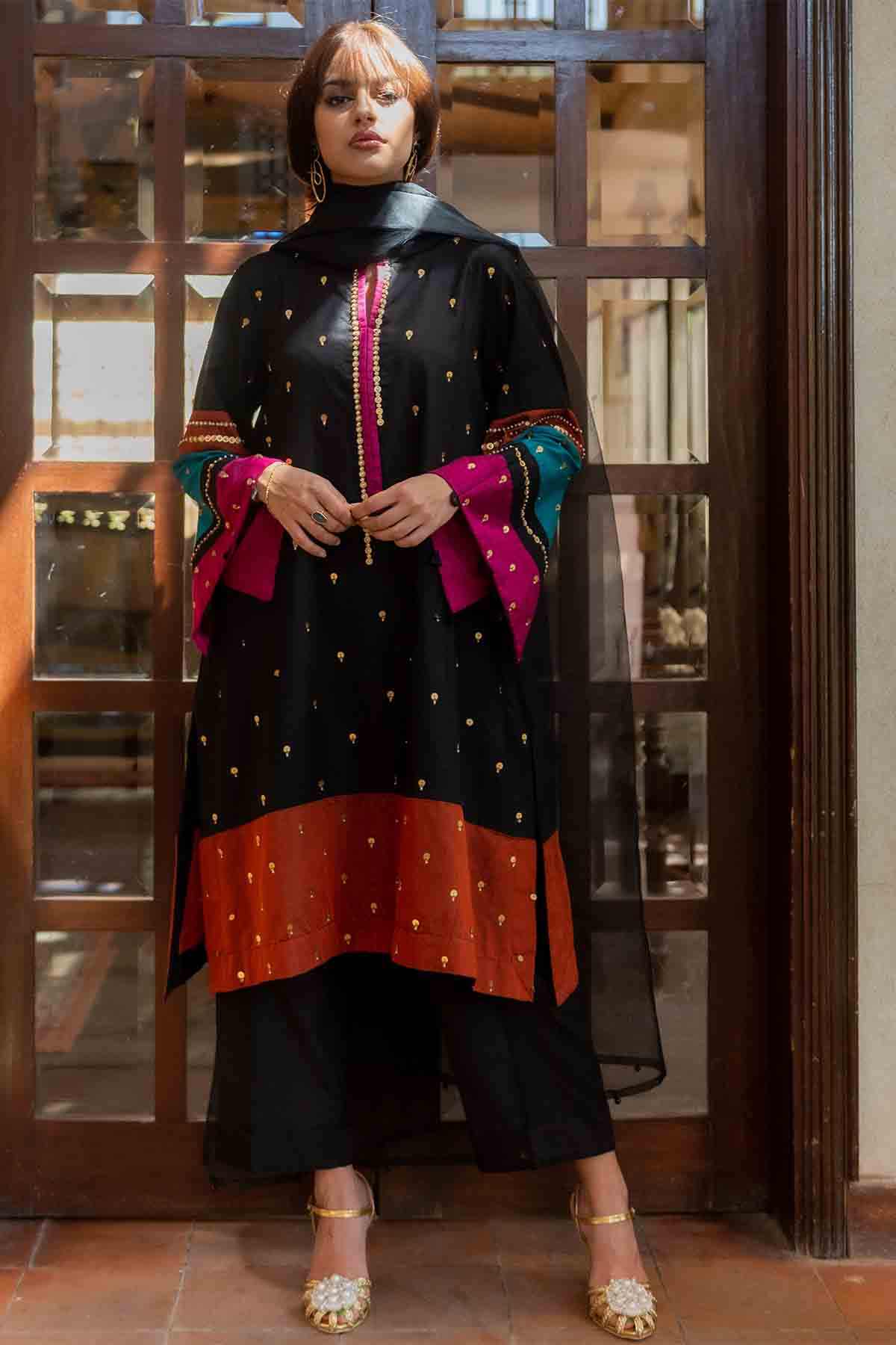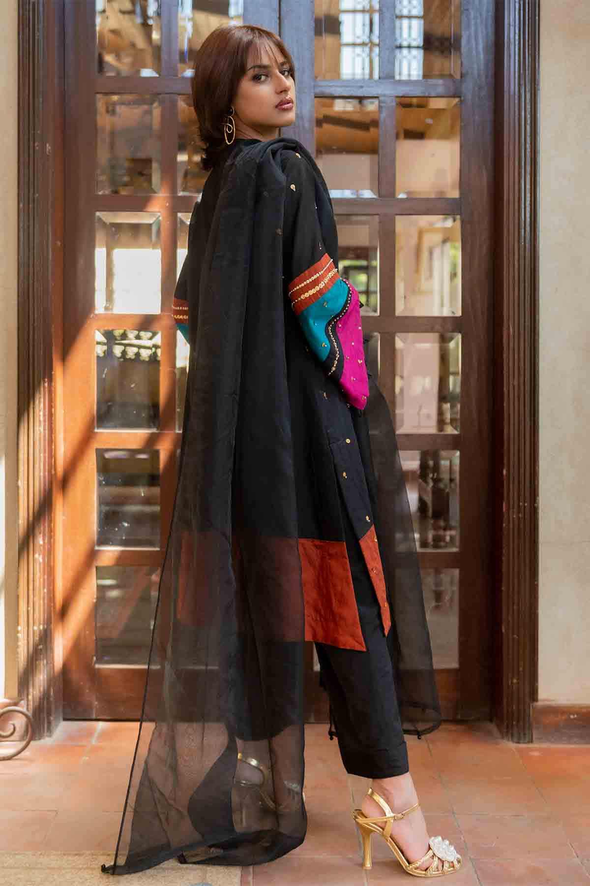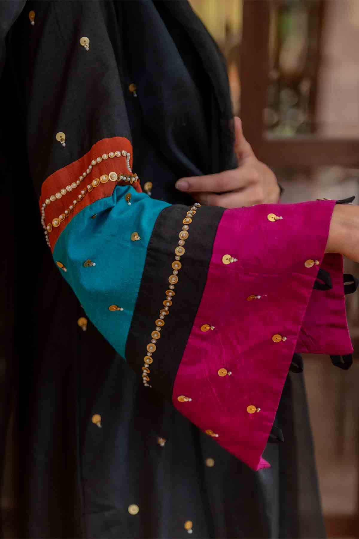 Color Blocked Katan Silk Black Shirt With Magenta, Burnt Orange And Turquoise. A Line Shirt Adorned With Pearls & Sequins Hand Embroidery All Over. Paired Up With Same Color Straight Culottes And Organza Dupatta. A Perfect Chic Look For This Eid.