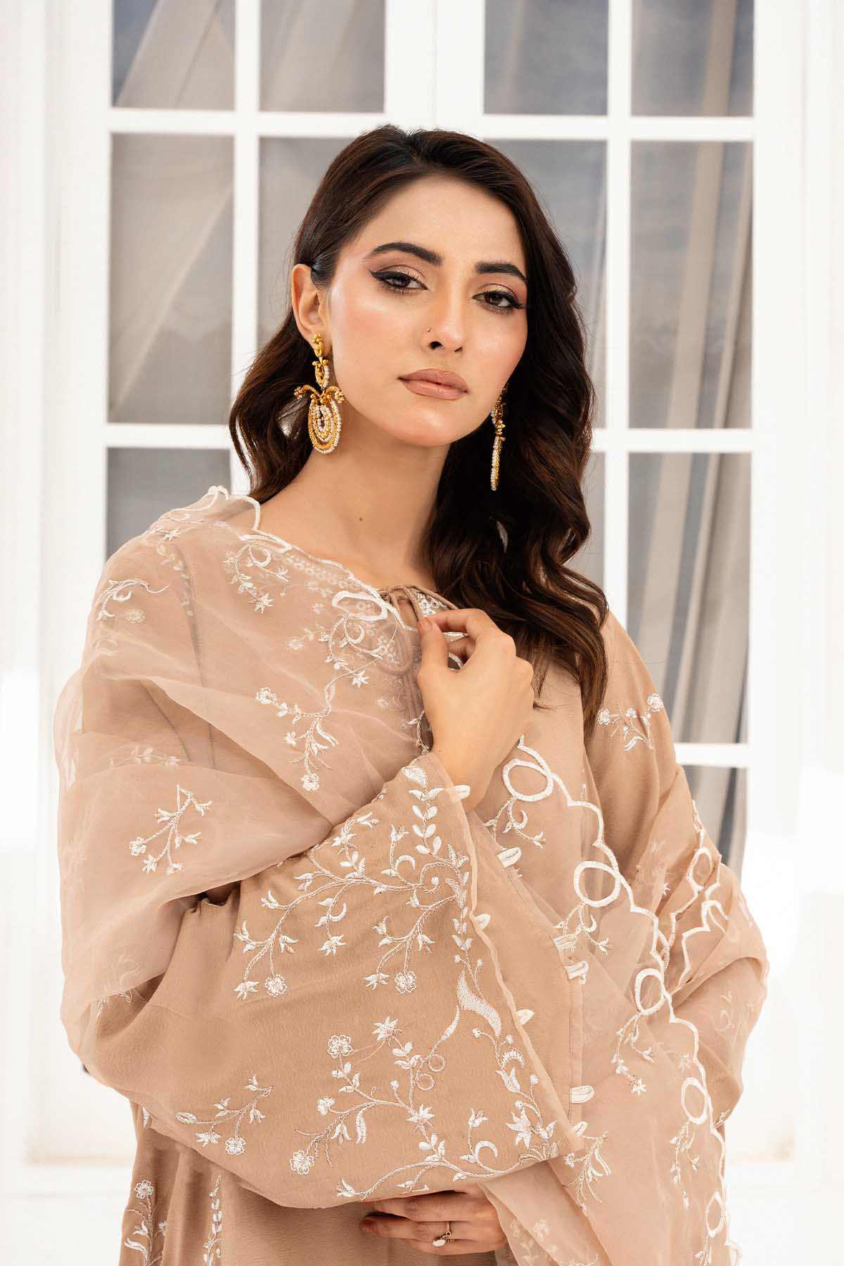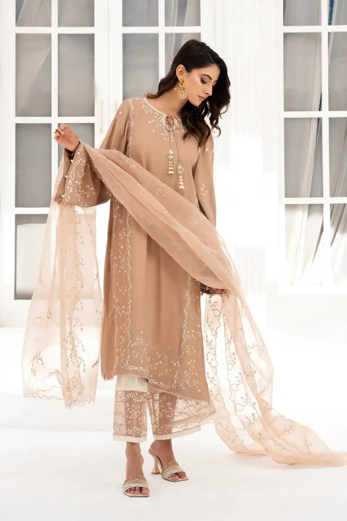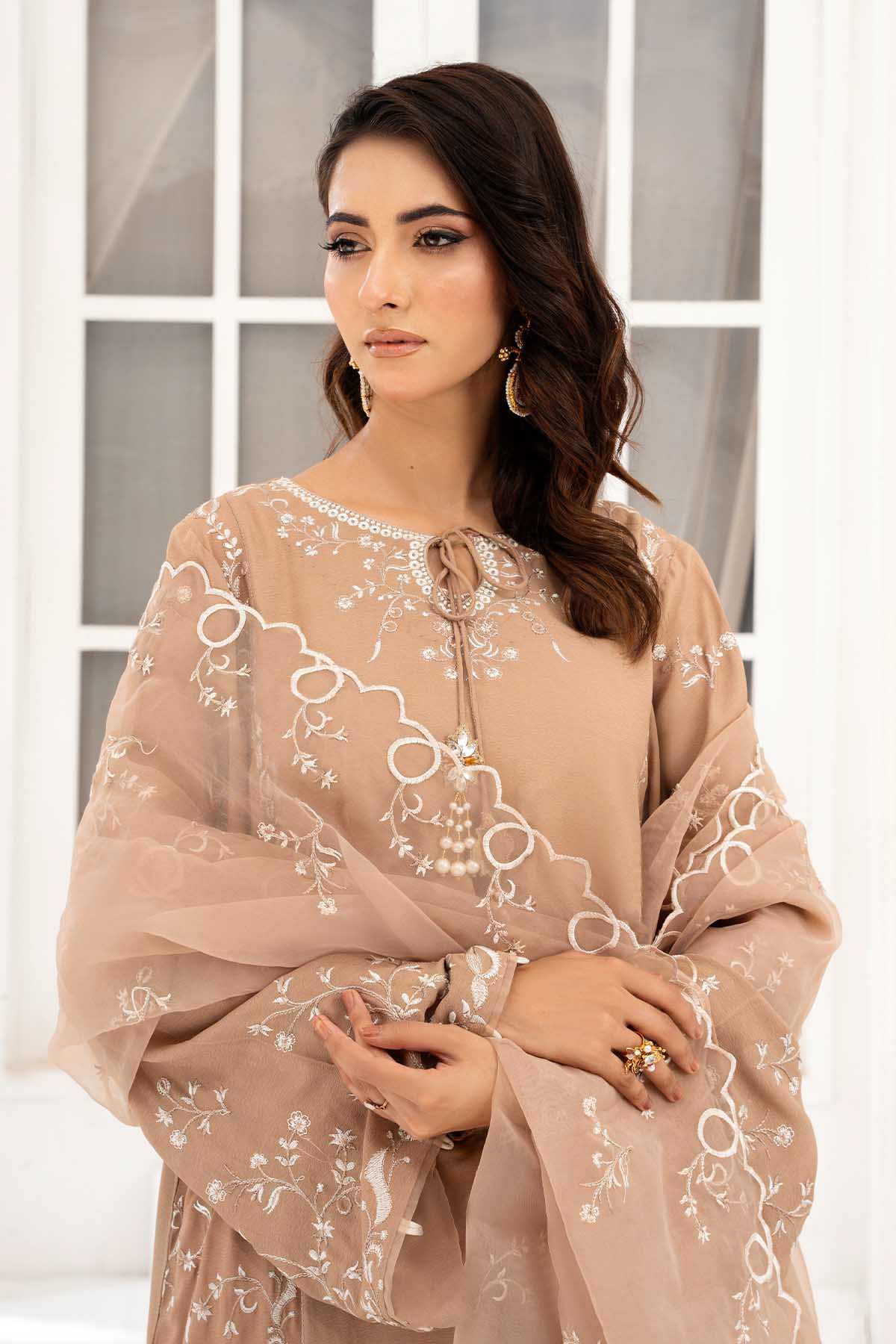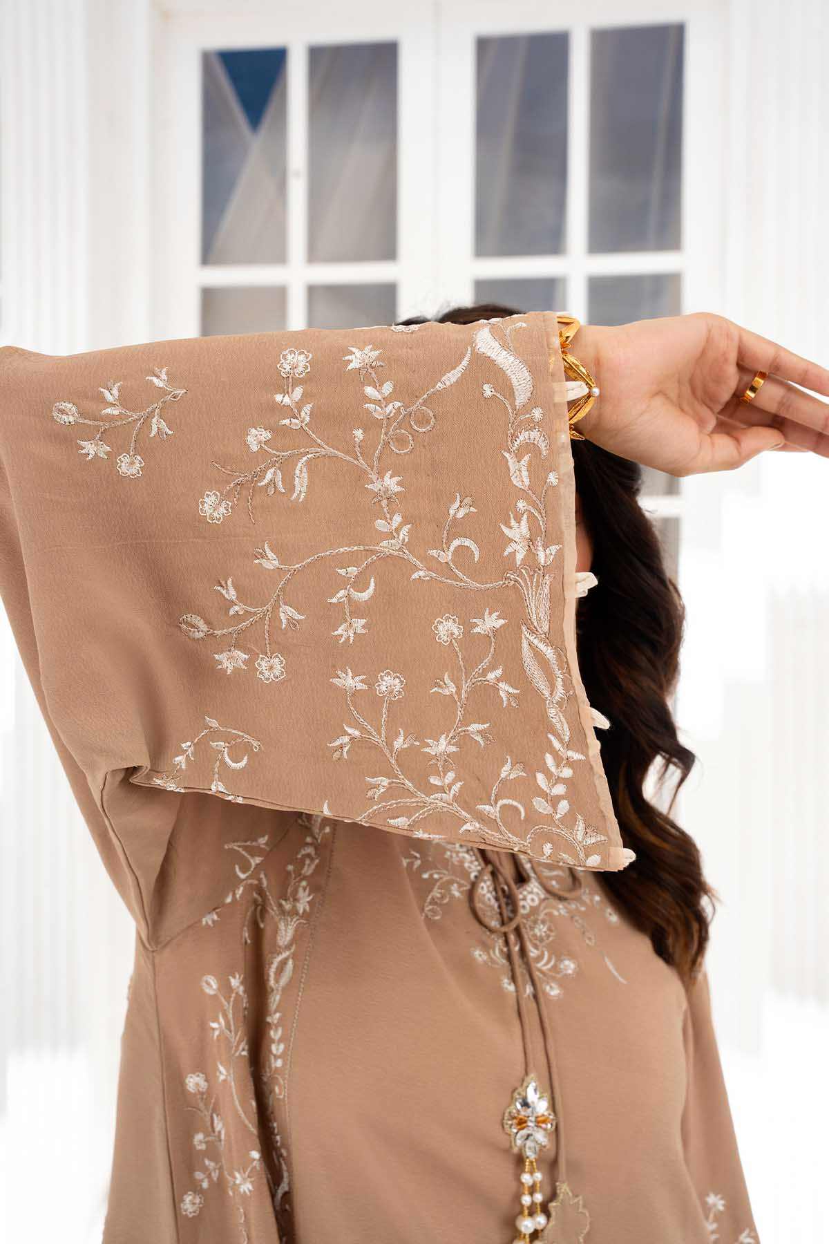 Flora & Fauna Eid Festive A Mocha Mousse Crepe Georgette Panelled A Line Shirt With Round Keyhole Neck Features Detailed Contrasting Thread Embroidery.Kurta Sleeves With Thread Embroidery And Pearl Finishing.Tassel Finishing On The Neckline.Cream Bamboo Rawsilk Culotte Embellished With Embroidered Organza On The Edges.Paired With Mocha Mousse Organza Dupatta Adorned With Contrasting Thread Embroidery And Cutwork Borders.